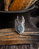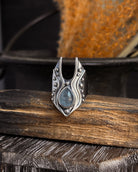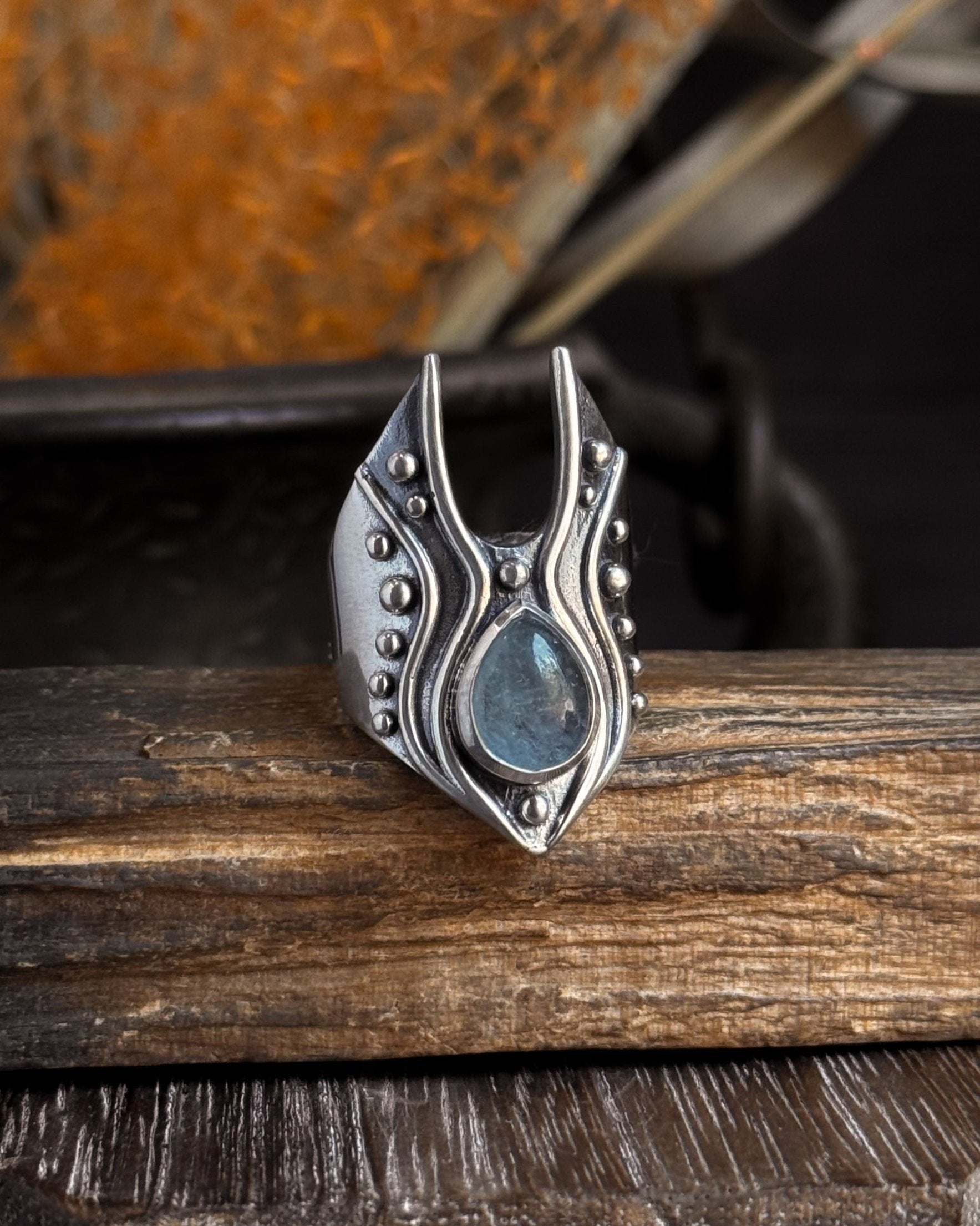 Sterling silver hand fabricated Warmaster ring set with a natural Aquamarine.If you have questions regarding fit, you can contact us at any time.