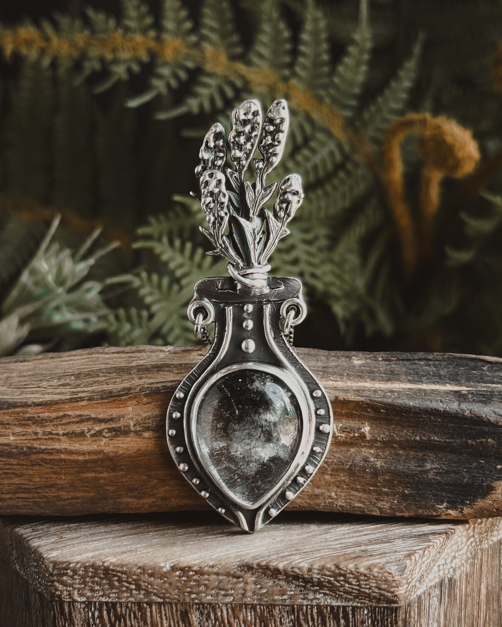 Lavender Potion Bottle Necklace w/ Tourmalated Inclusion Quartz