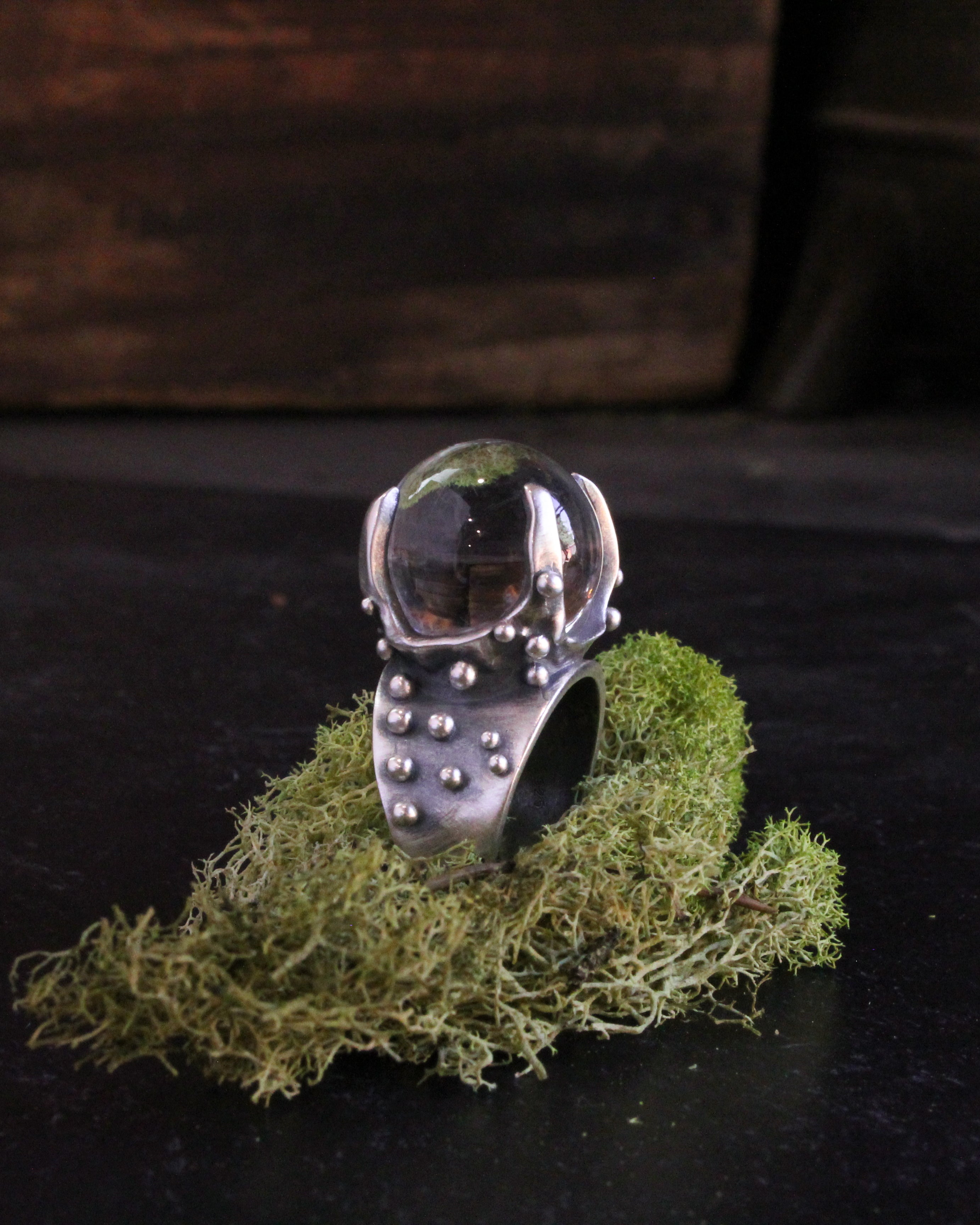 We developed a new version of our original Divination Ring, this new version is inspired by our Sorceress Crystal Ball Necklace which uses the same technique to create an organic drippy look.