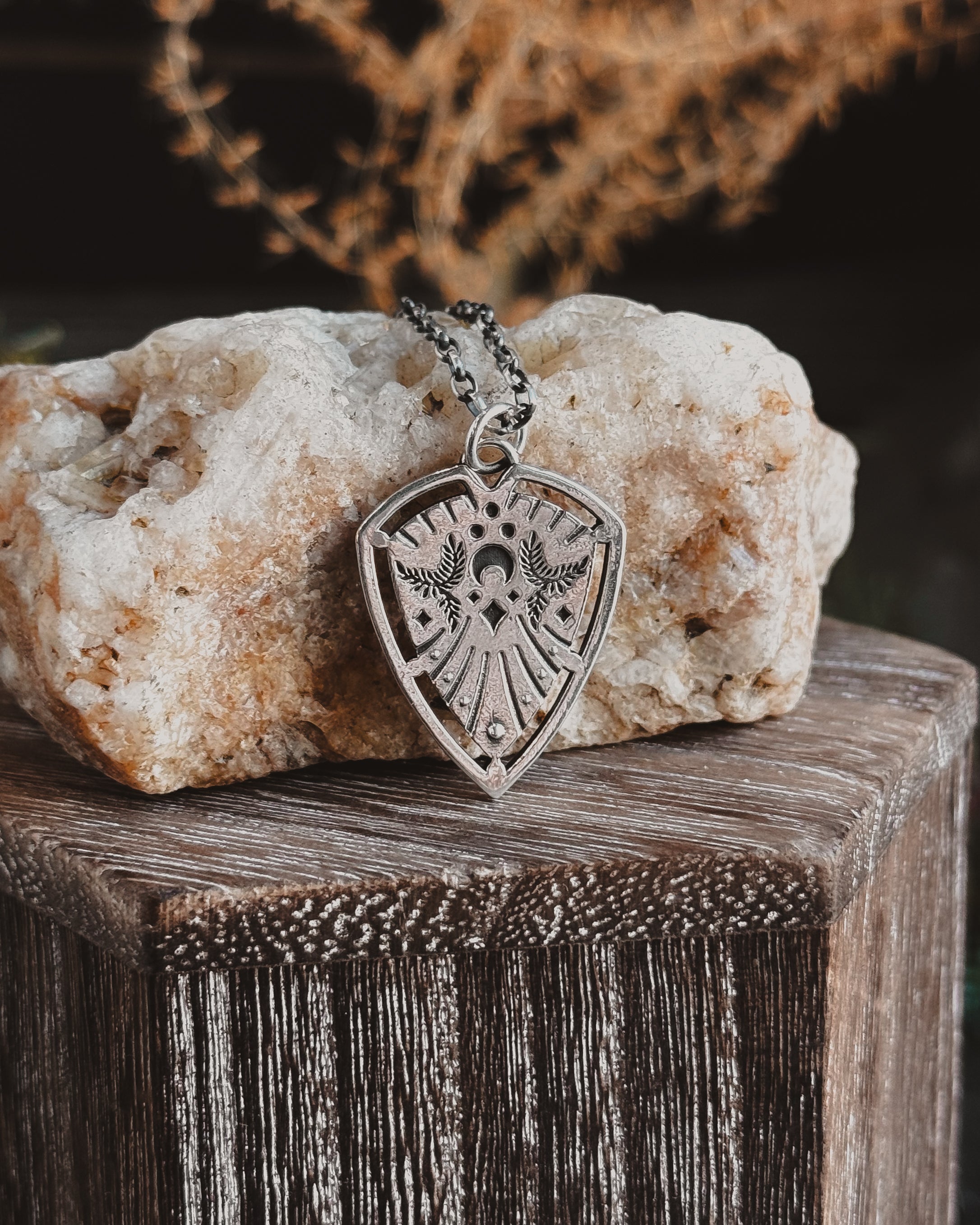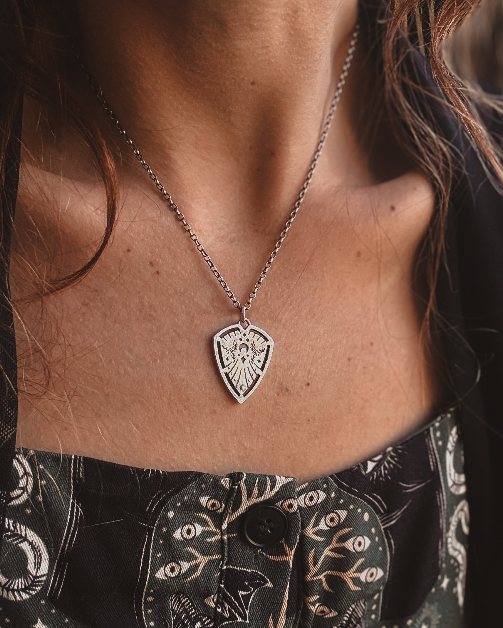 The Ferns Shield Necklace features a hand-drawn botanical illustration that celebrates the delicate beauty and transformative power of ferns. This elegant talisman connects you to the energy of new beginnings and personal growth, inviting tranquility and renewal into your daily life.
