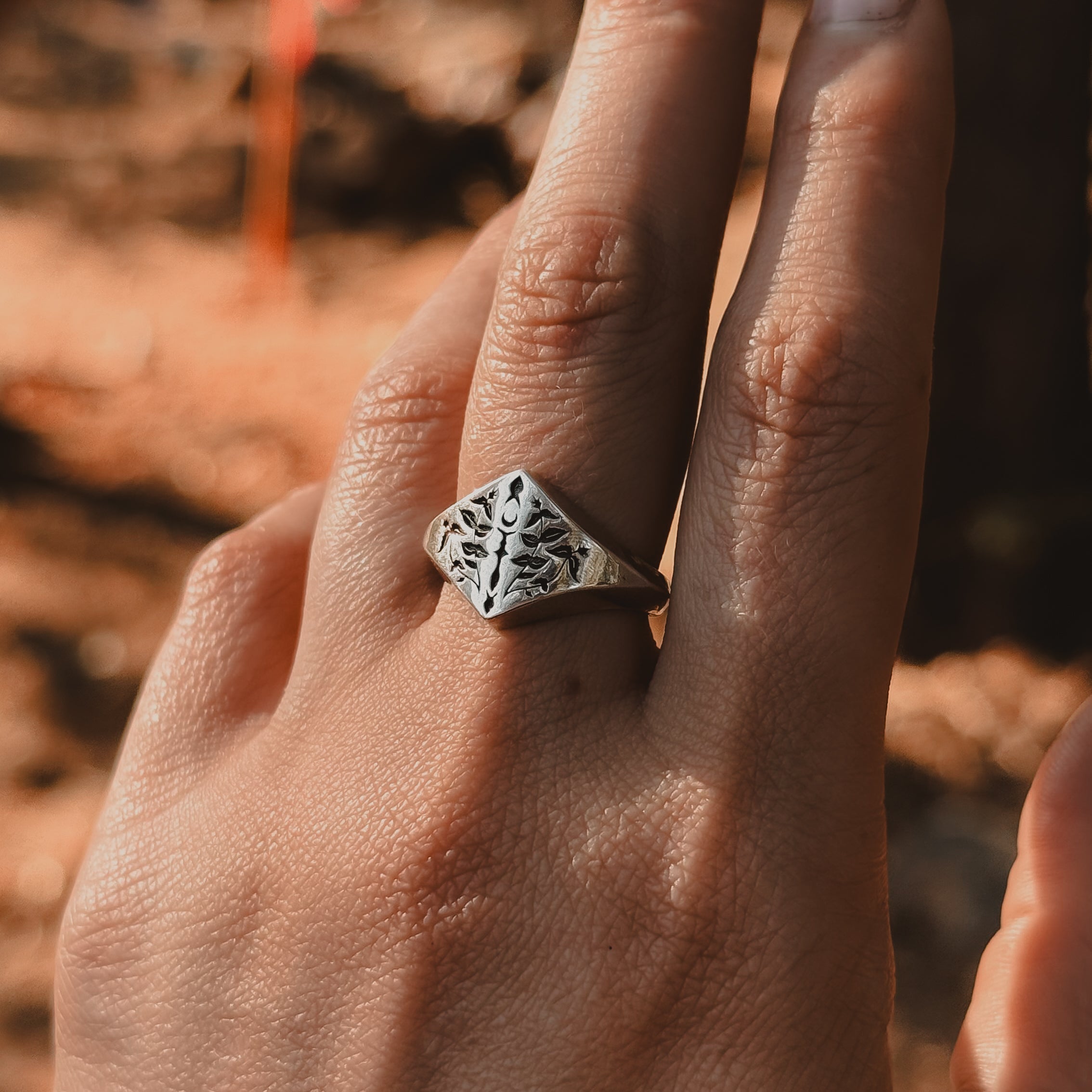 Hand-carved sterling silver signet ring featuring hand-drawn lemon balm illustration.