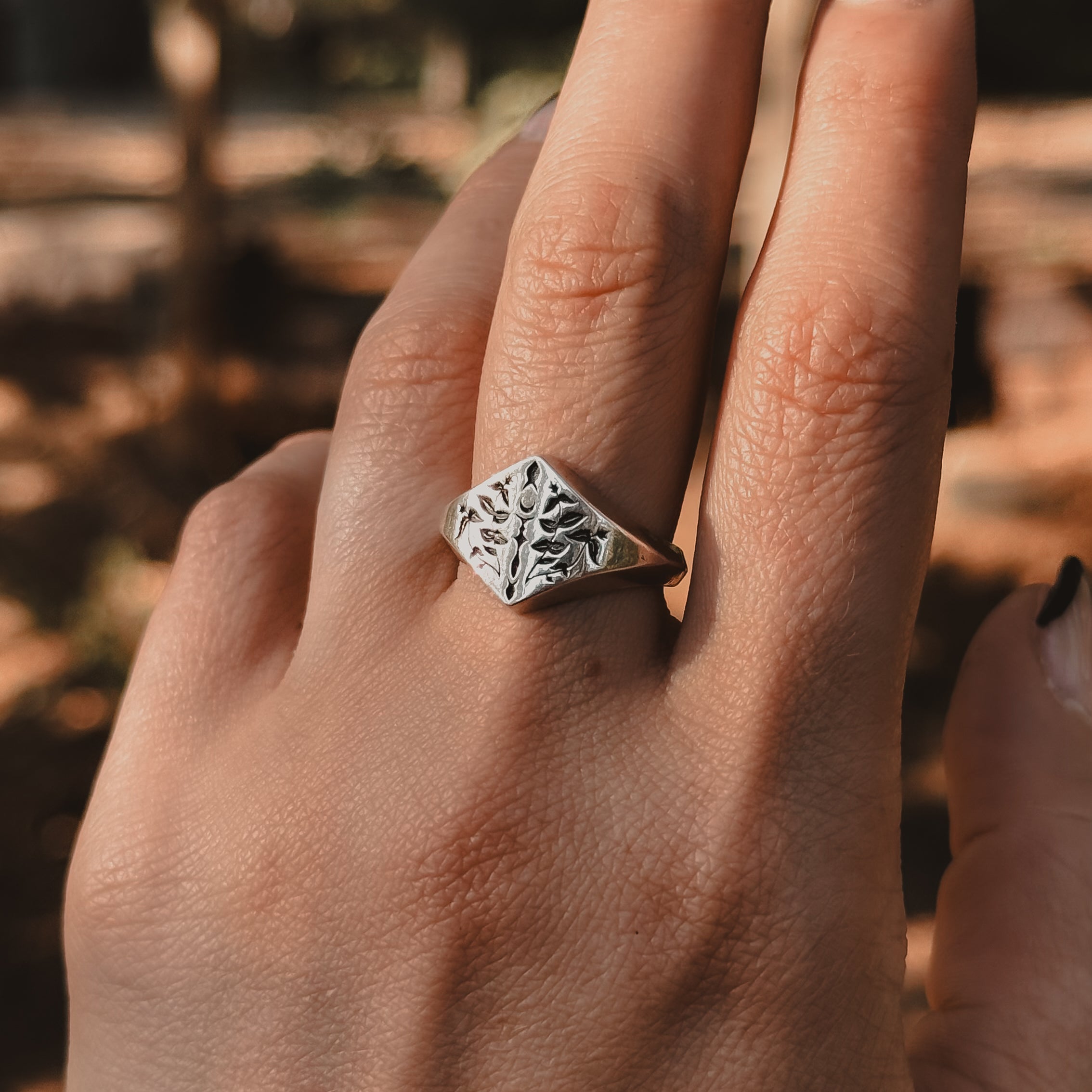 Handcrafted in sterling silver from our Plant Magick Collection, this signet ring serves as a wearable tribute to an herb that has been cherished for centuries for its ability to calm the heart and lift the spirits. The carefully detailed lemon balm leaves represent peace, healing, and emotional well-being—qualities that make this herb a trusted ally during stressful times. Like the refreshing scent of lemon balm that immediately soothes the senses, this ring reminds you to pause, breathe, and return to center amidst life's demands.