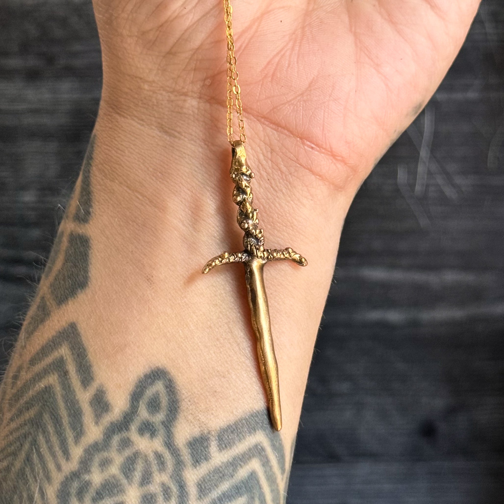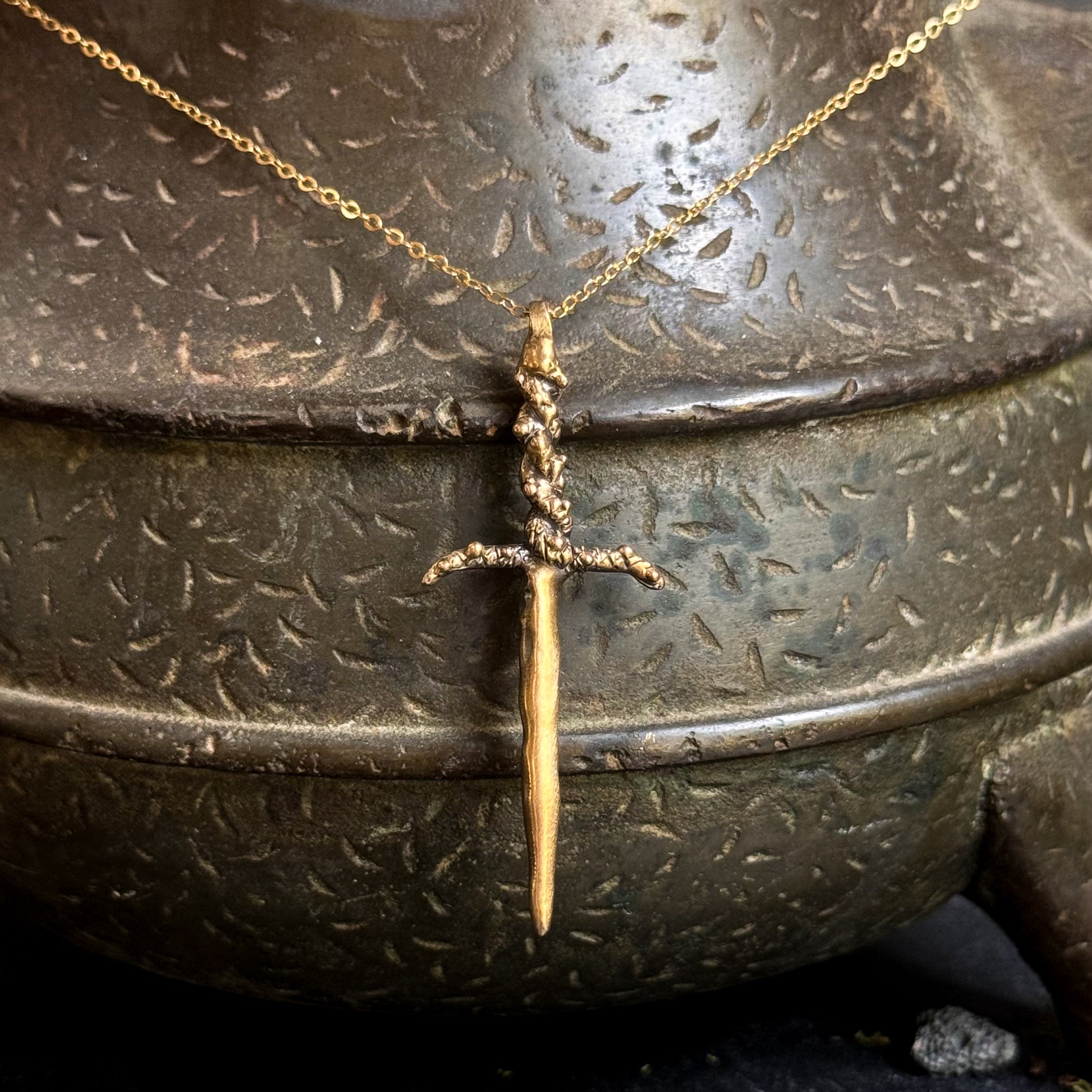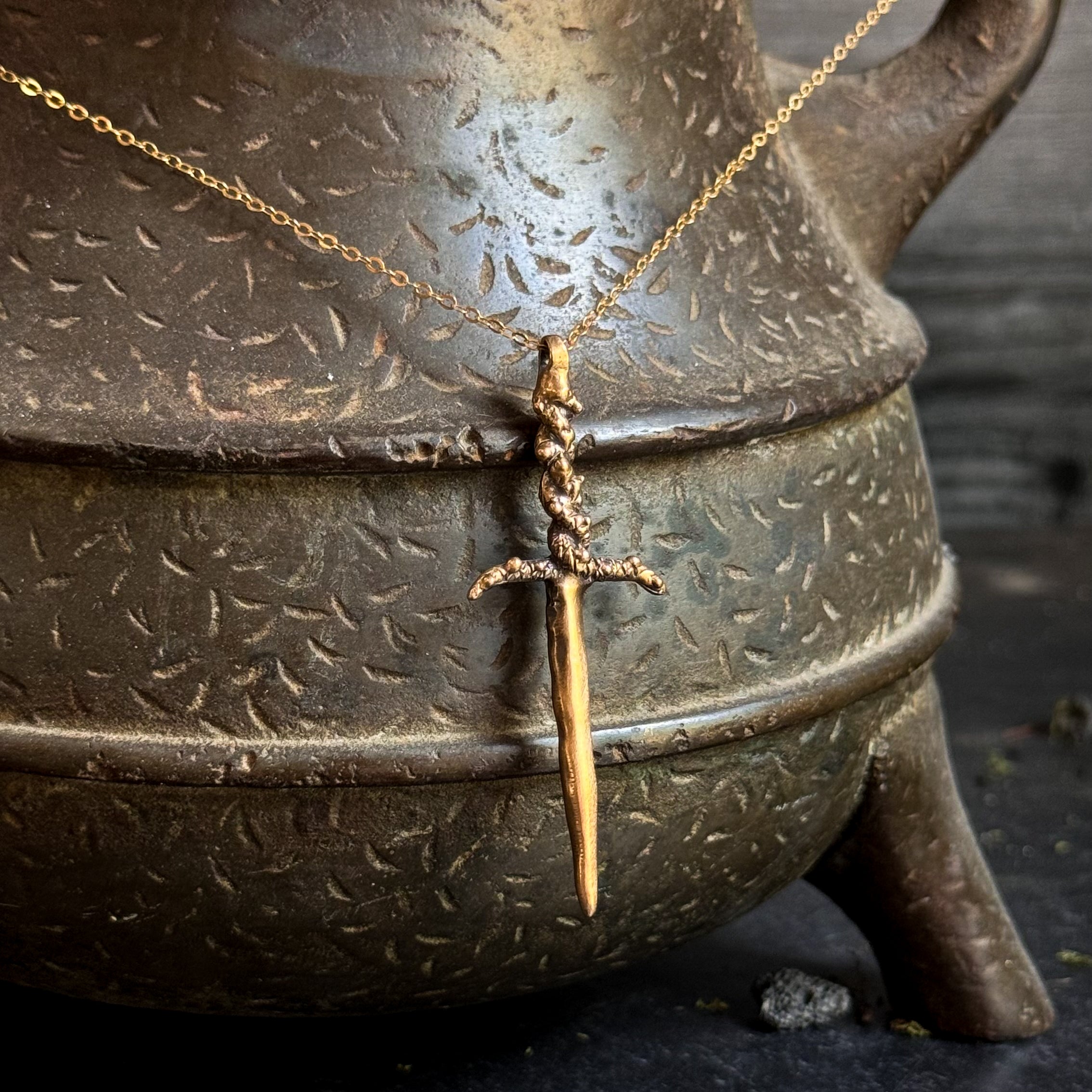 Hand carved and cast dagger necklace- Brass on Gold Filled Chain