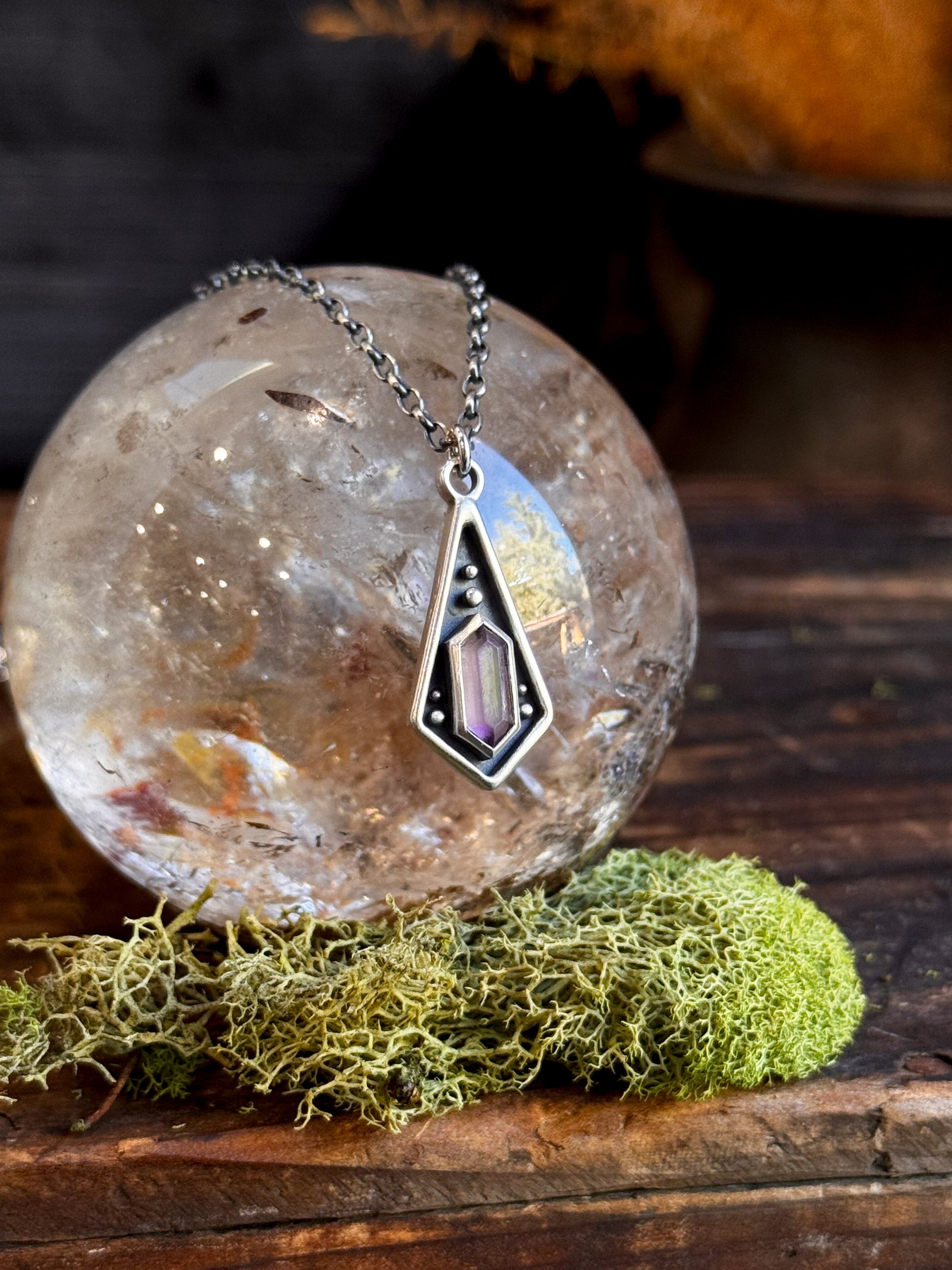The Maiden Necklace features Amethyst, a powerful protective crystal that transmutes negative energy into loving vibrations. This elegant pendant connects you to higher realms and inner wisdom, encouraging spiritual growth and enhancing your natural intuitive abilities.
