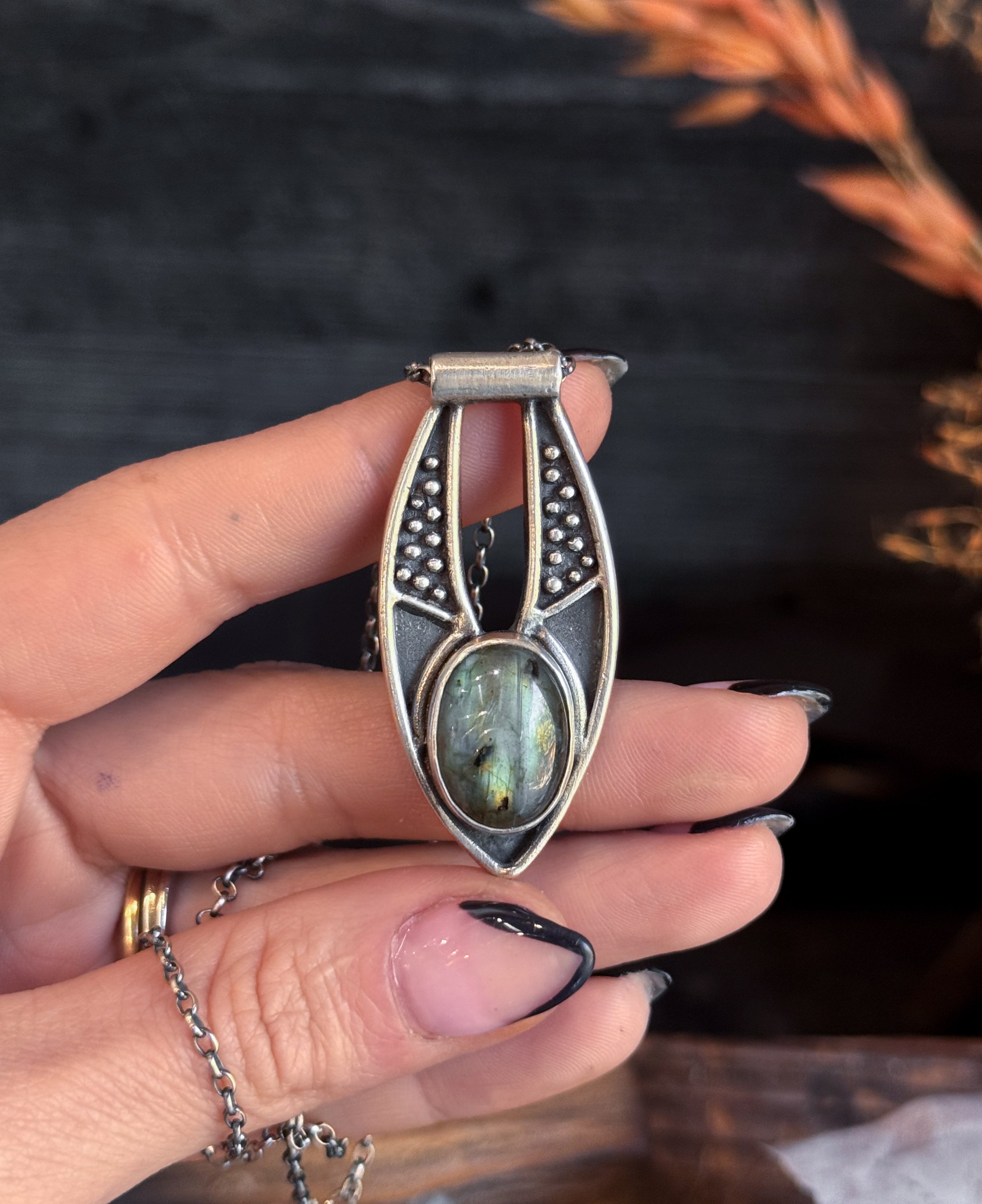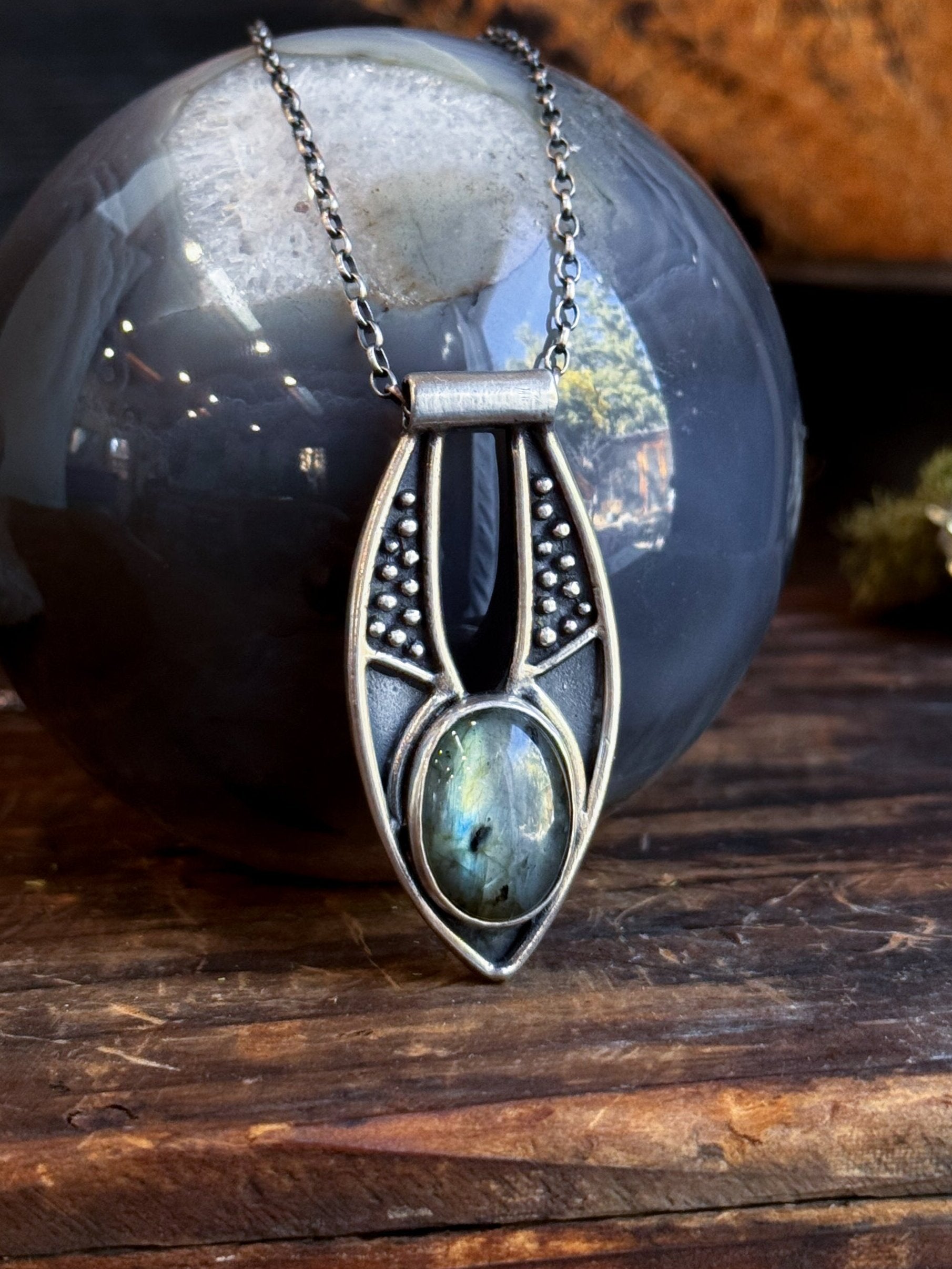 Handcrafted in sterling silver with a natural Labradorite gemstone, this striking piece symbolizes the revelation of hidden truths and inner wisdom. The carefully designed pendant serves as both a protective shield against negative energies and a tool for psychic development, helping you dispel illusions and perceive true intentions with clarity.