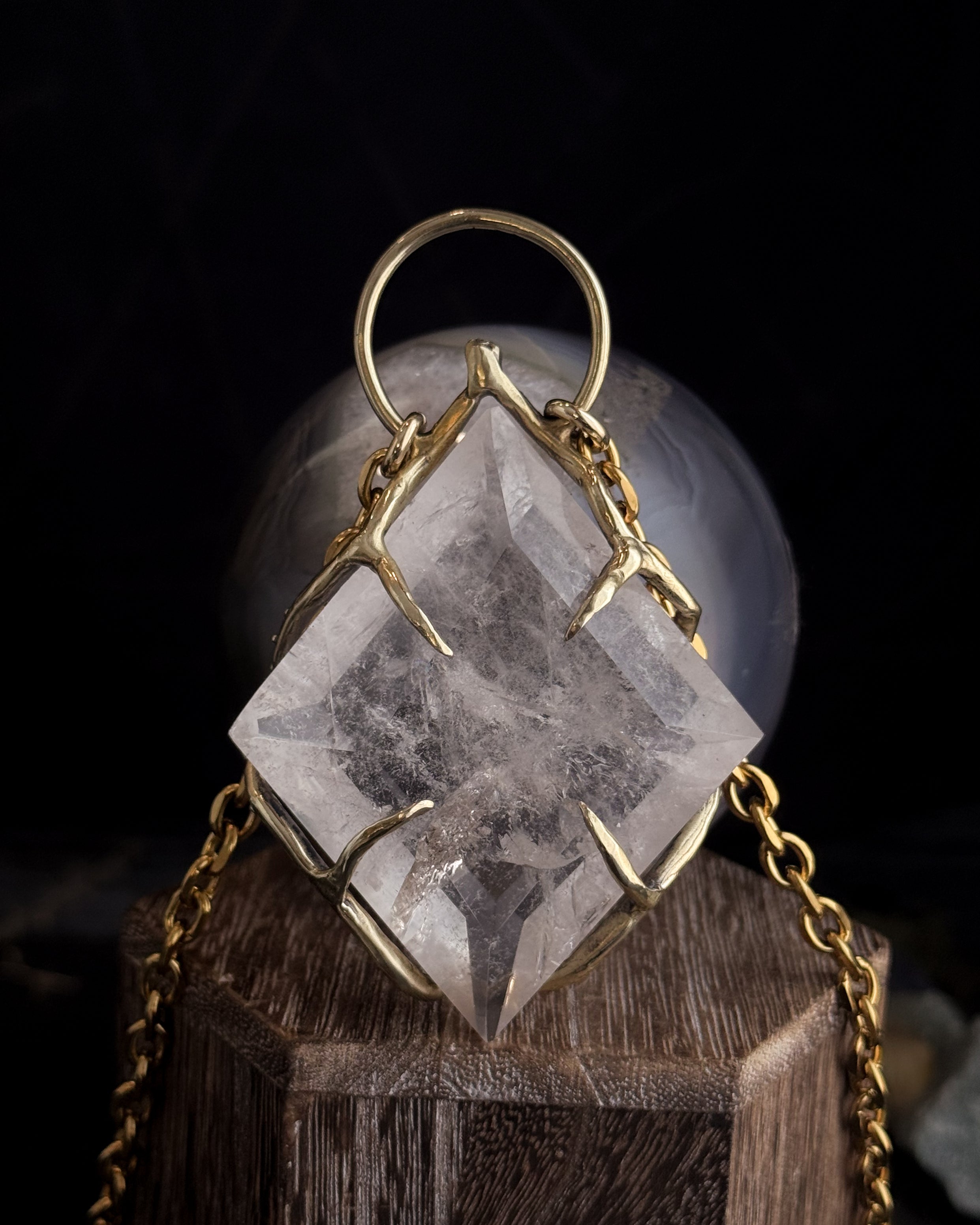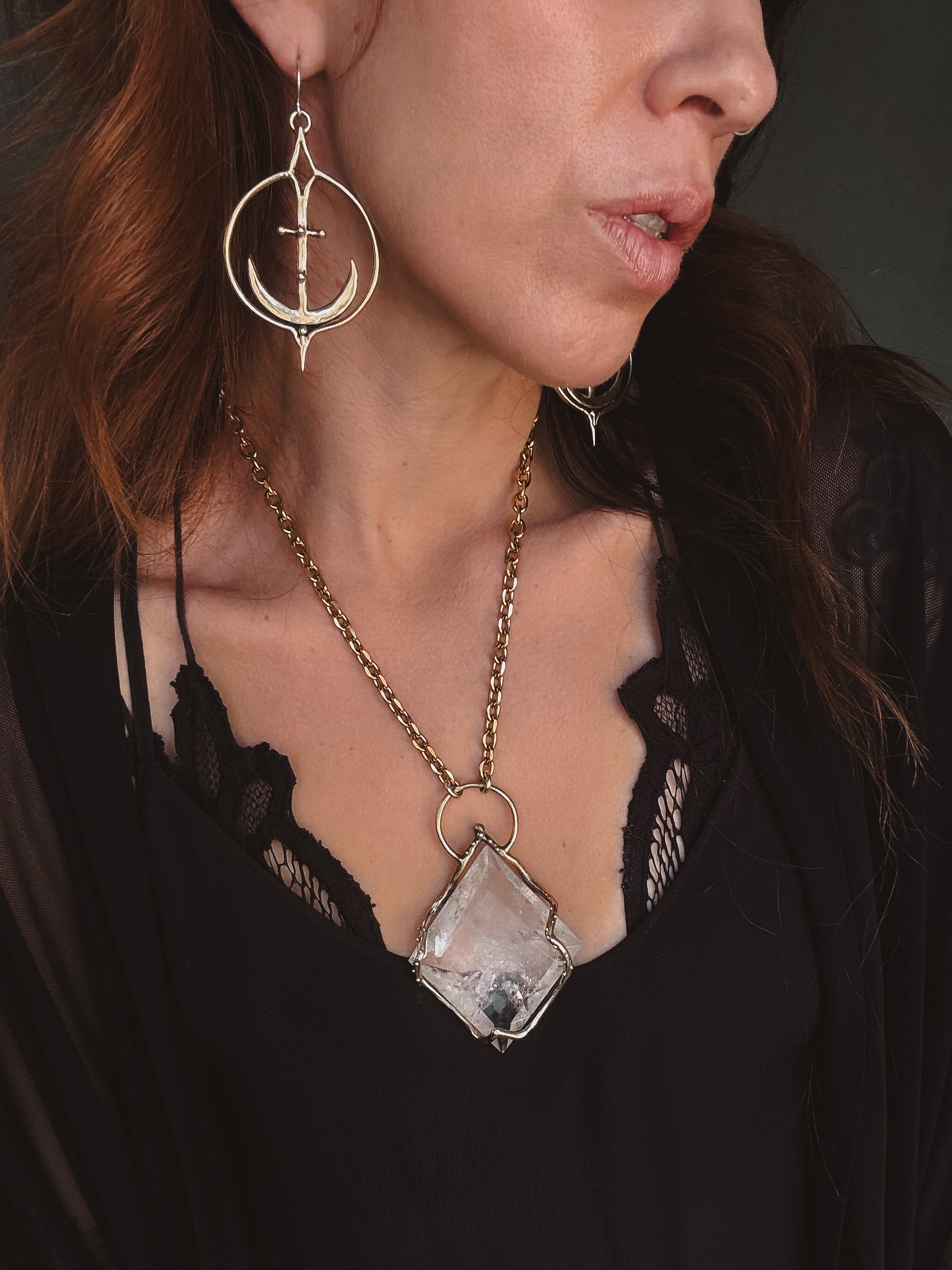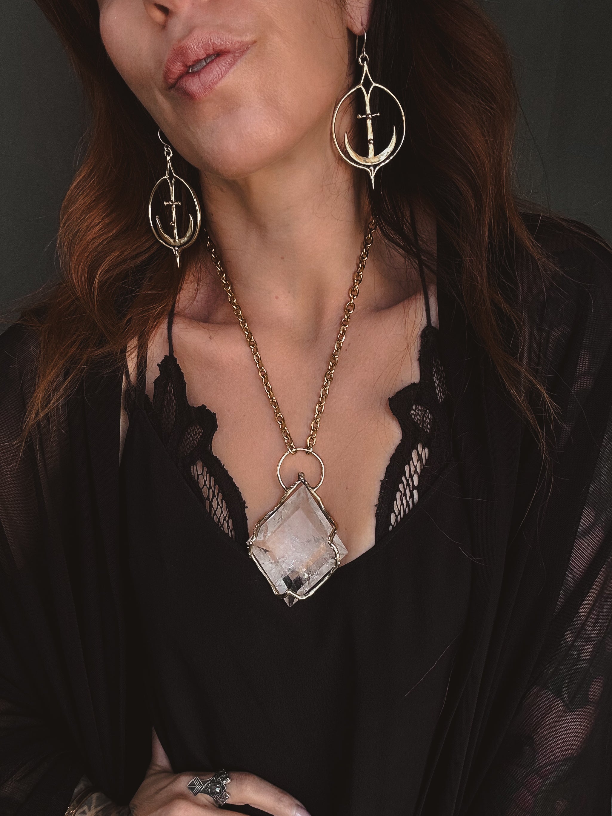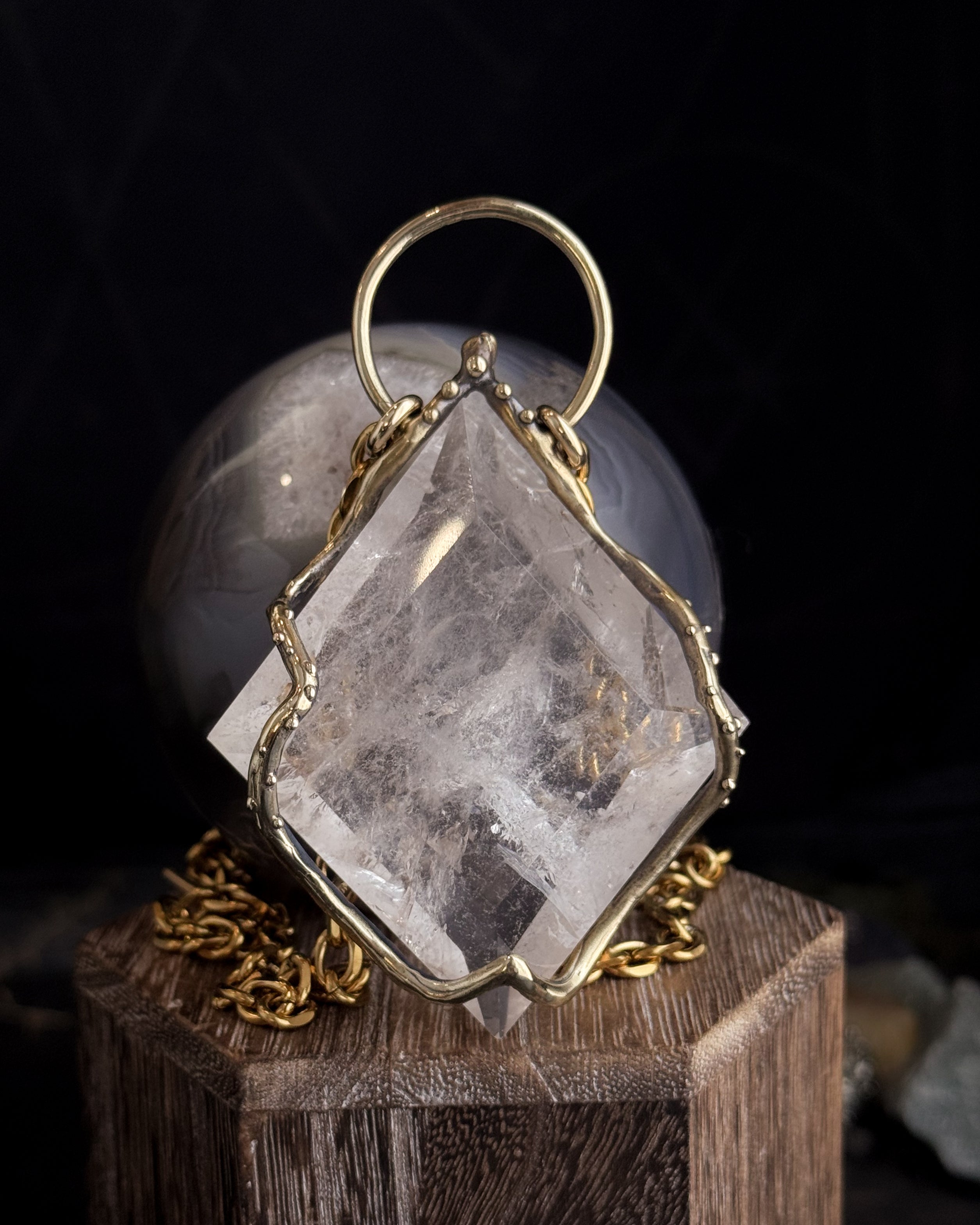 This piece is hand cast in solid brass. Empress Shield Necklace featuring a natural Quartz.