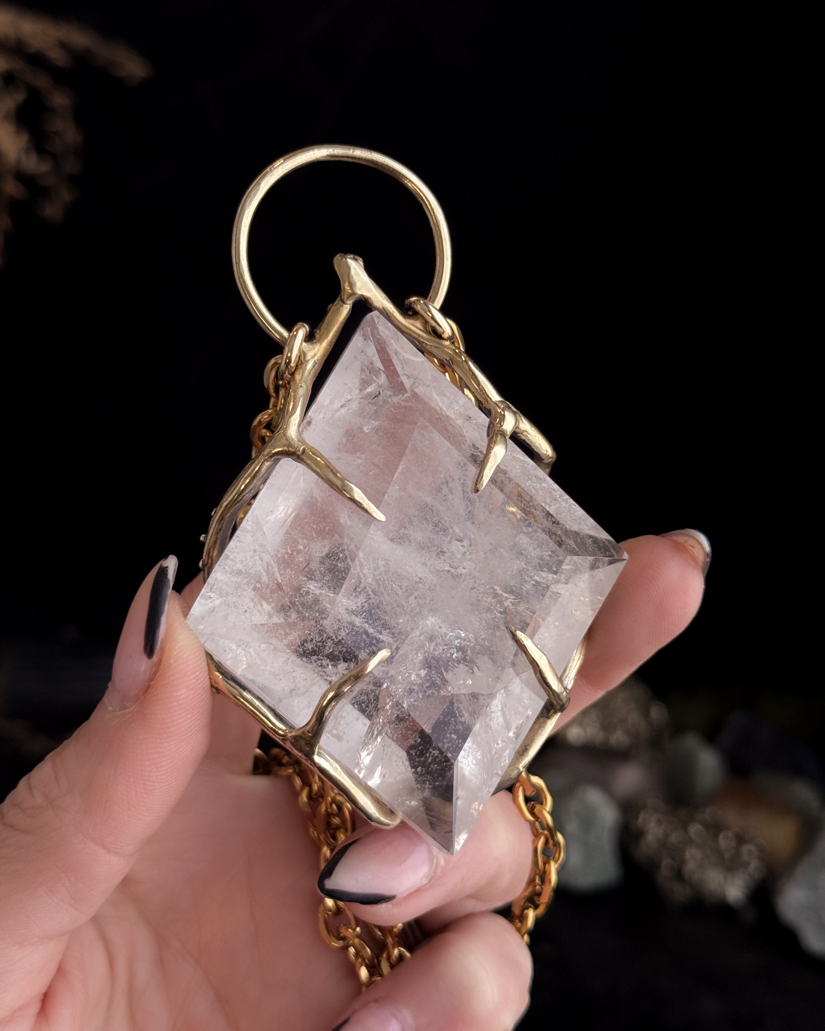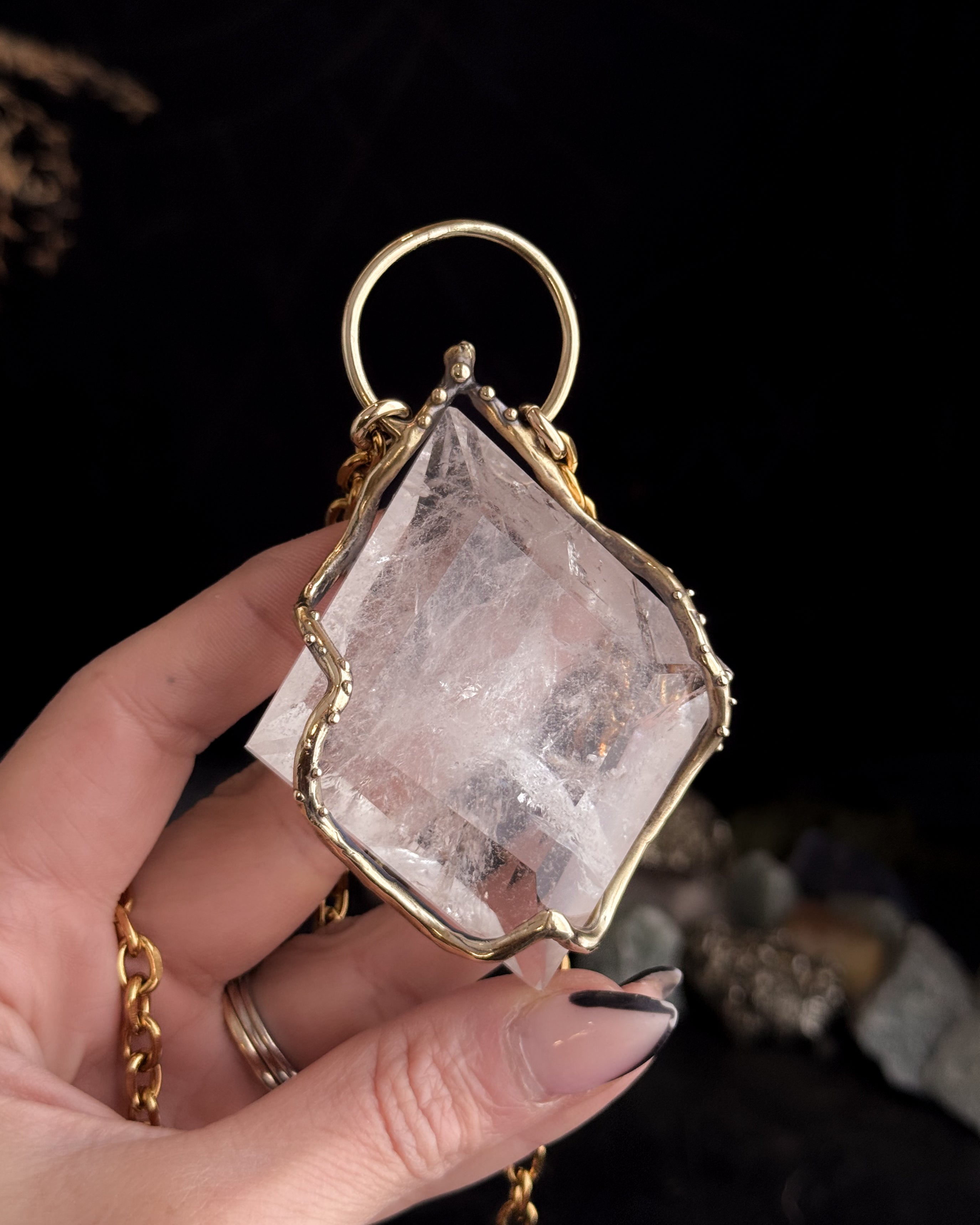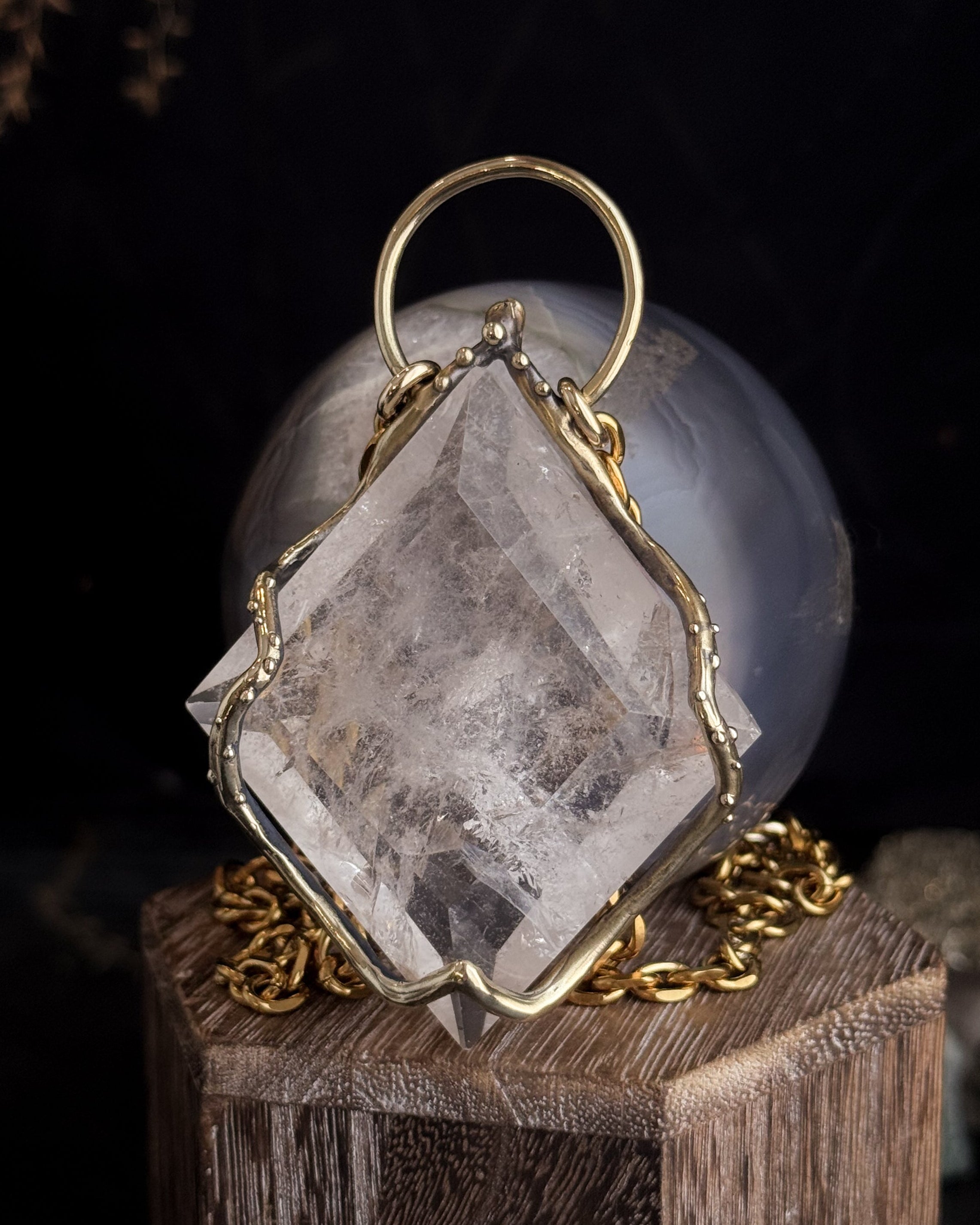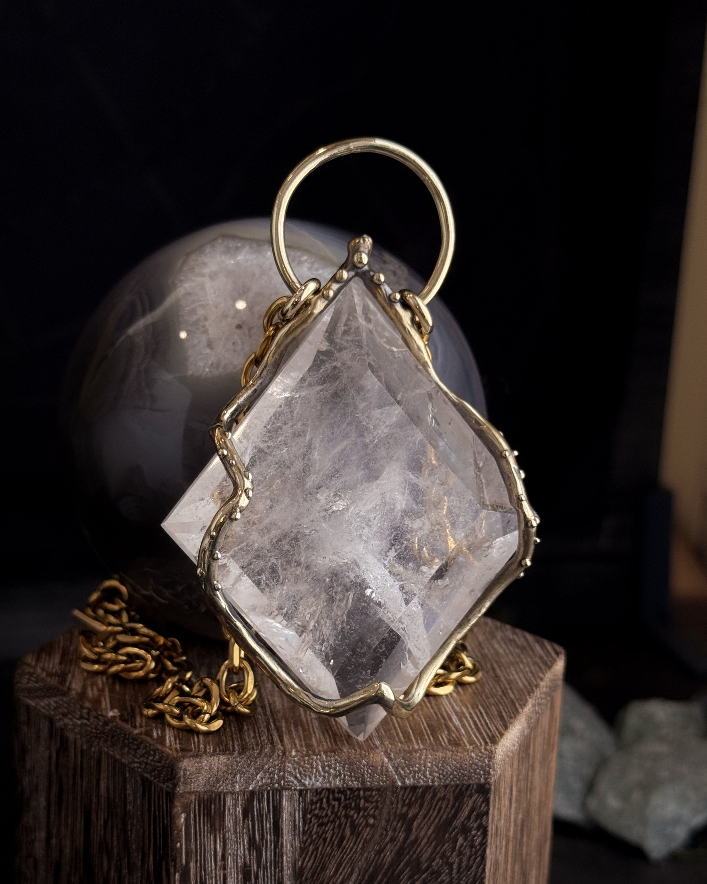 This piece is hand cast in solid brass. Empress Shield Necklace featuring a natural Quartz.