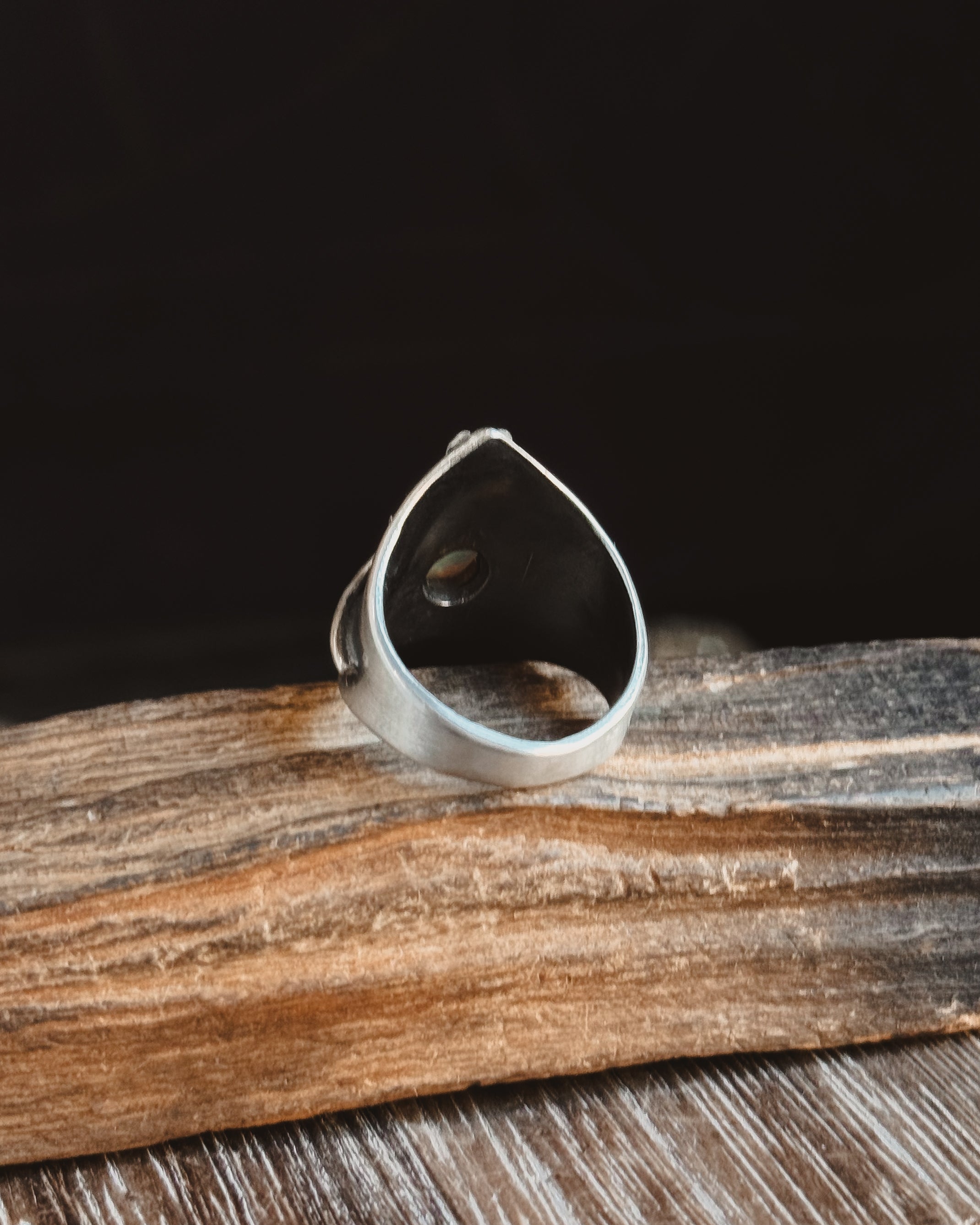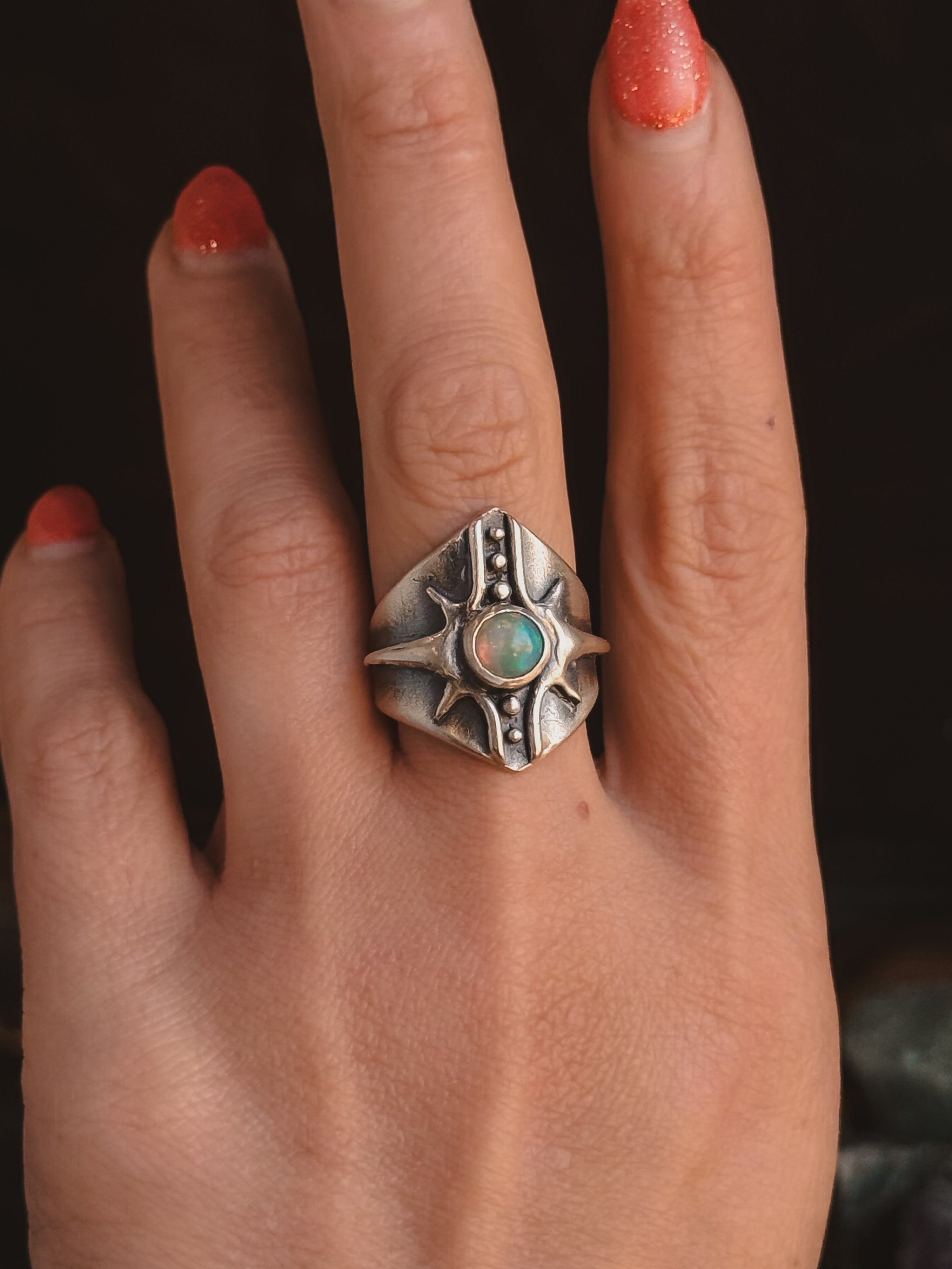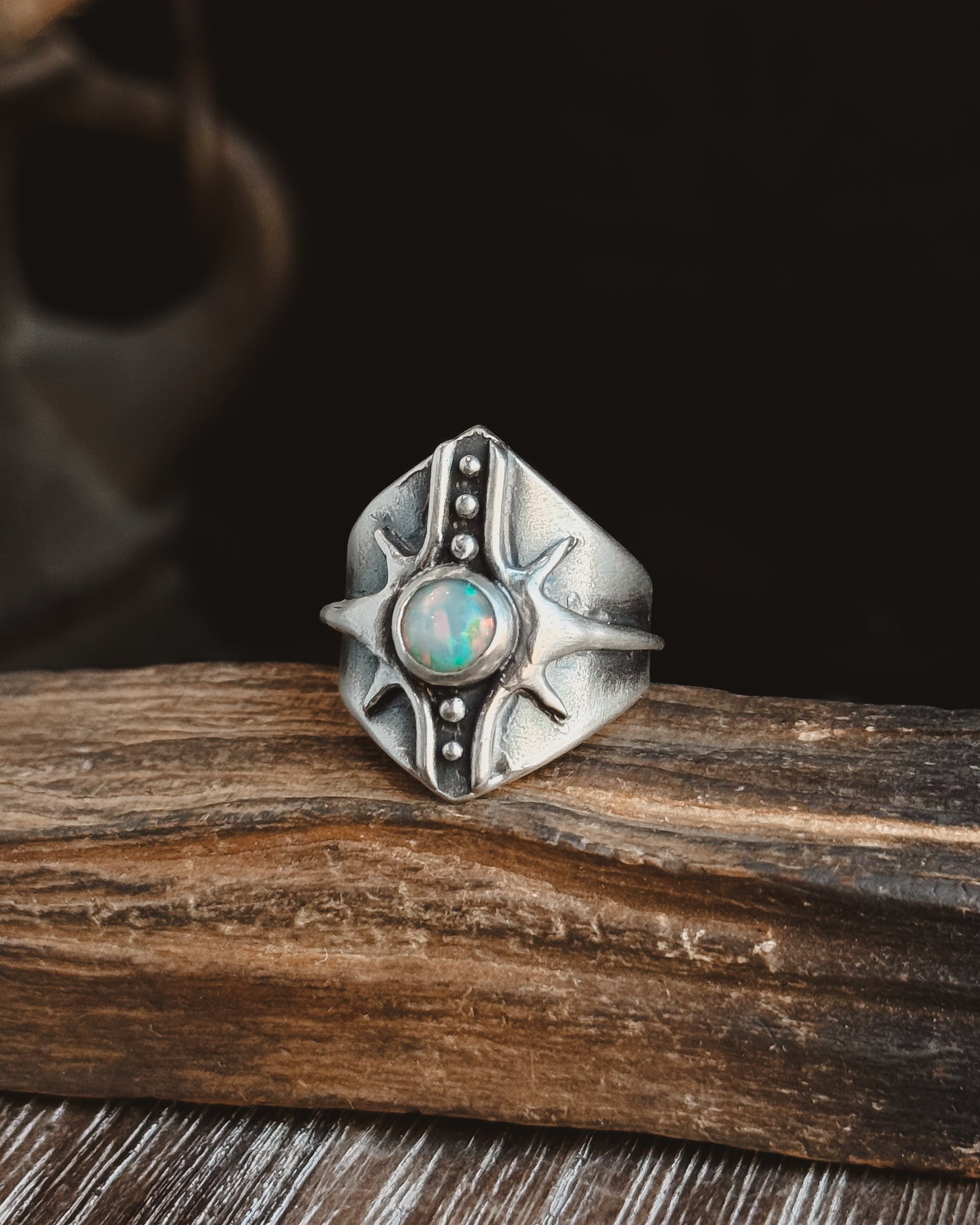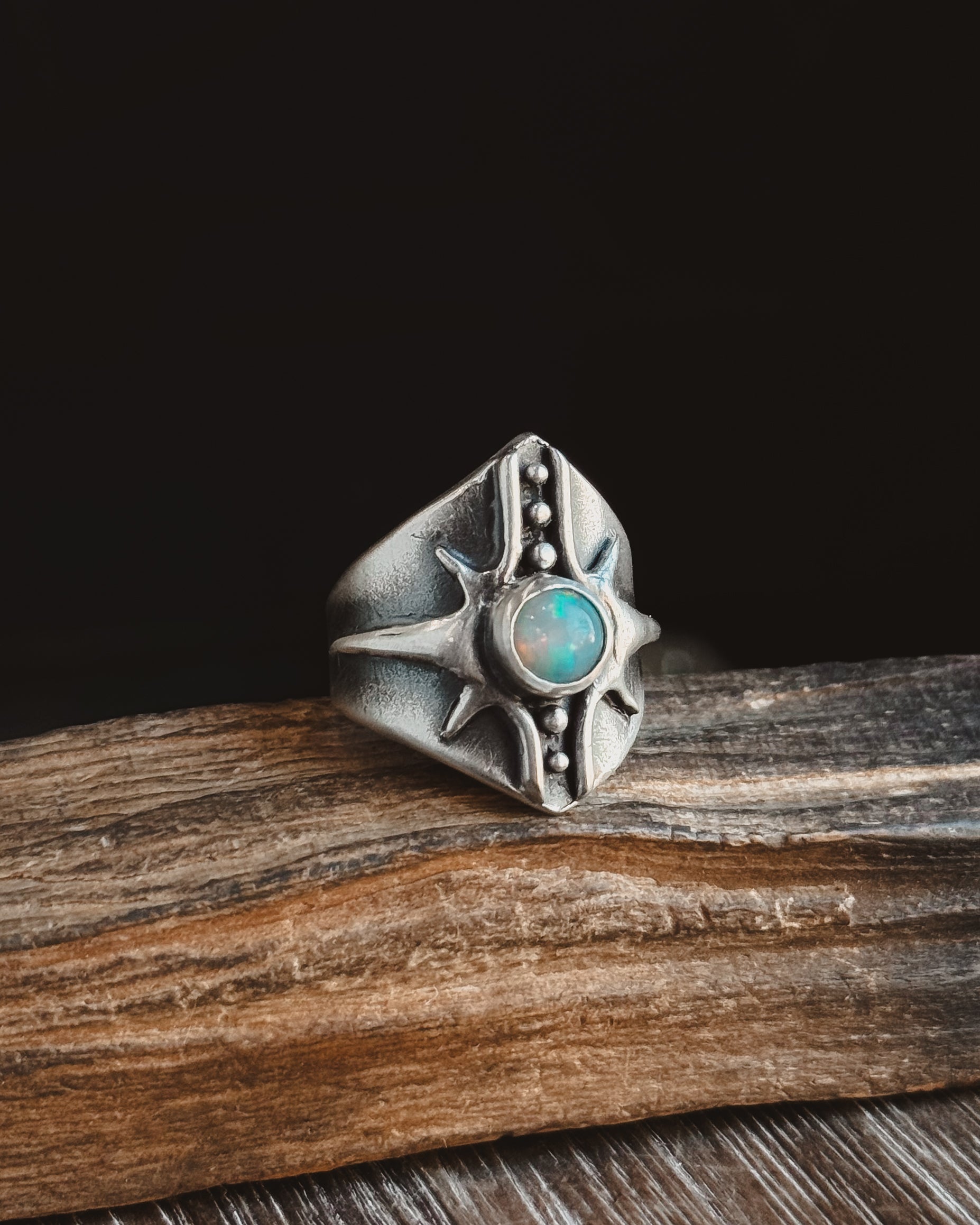 Hand carved and cast sterling silver Nova Ring Ring featuring a natural opalIf you have questions regarding fit, you can contact us at any time. We are happy to help you determine your ring size.