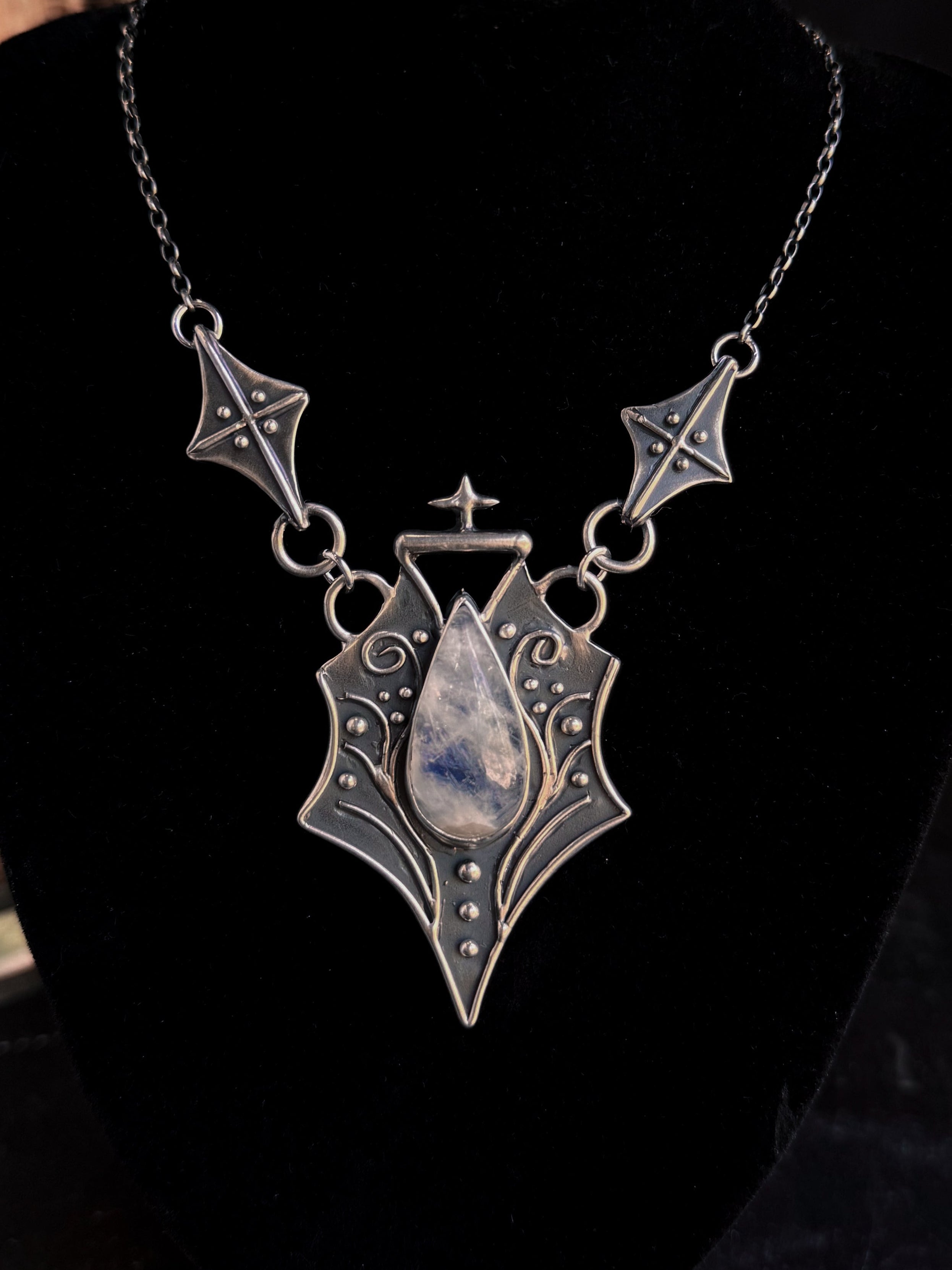 This piece is solid sterling silver including the chain and findings. Nibiru Necklace (LRG) featuring natural Rainbow Moonstone