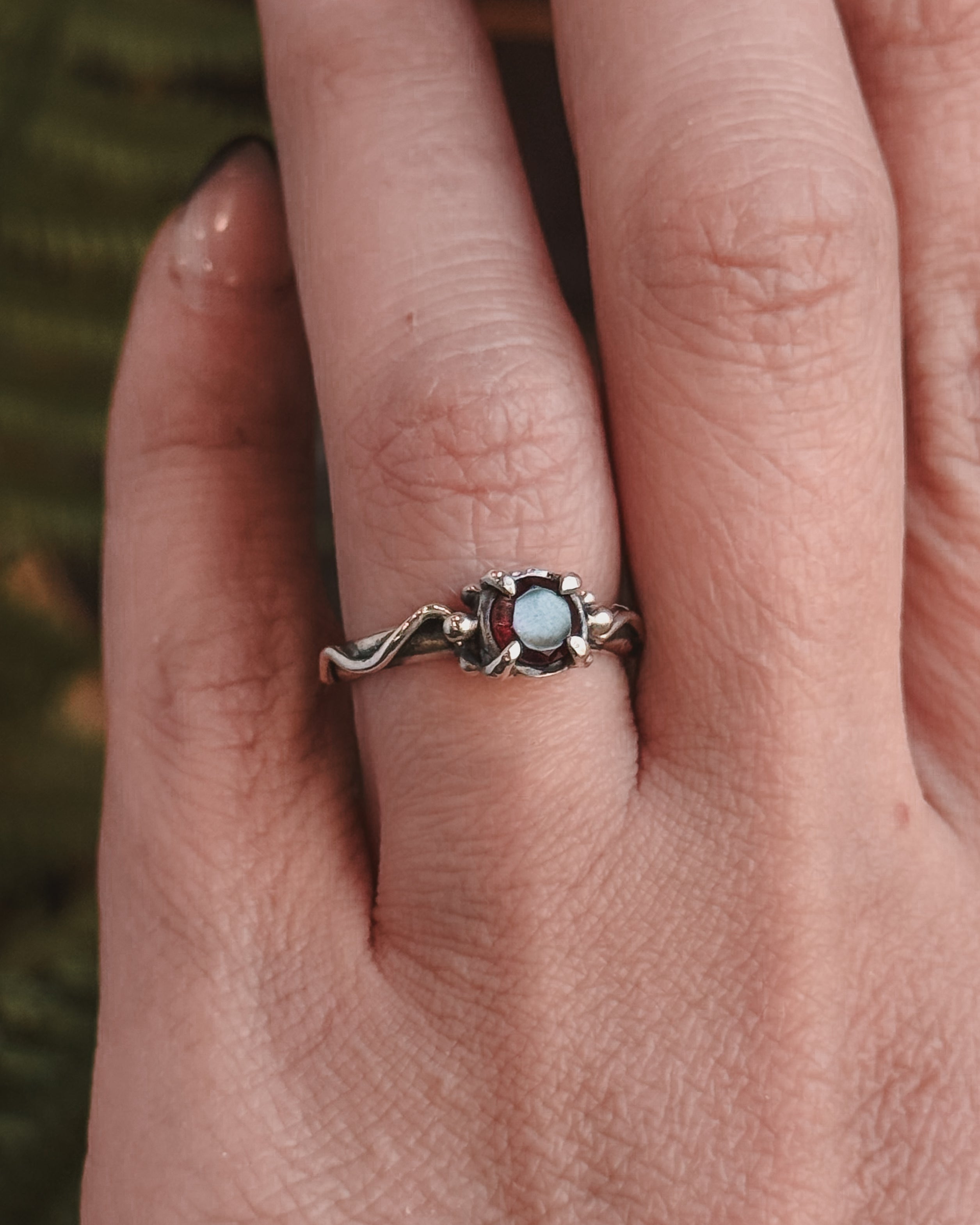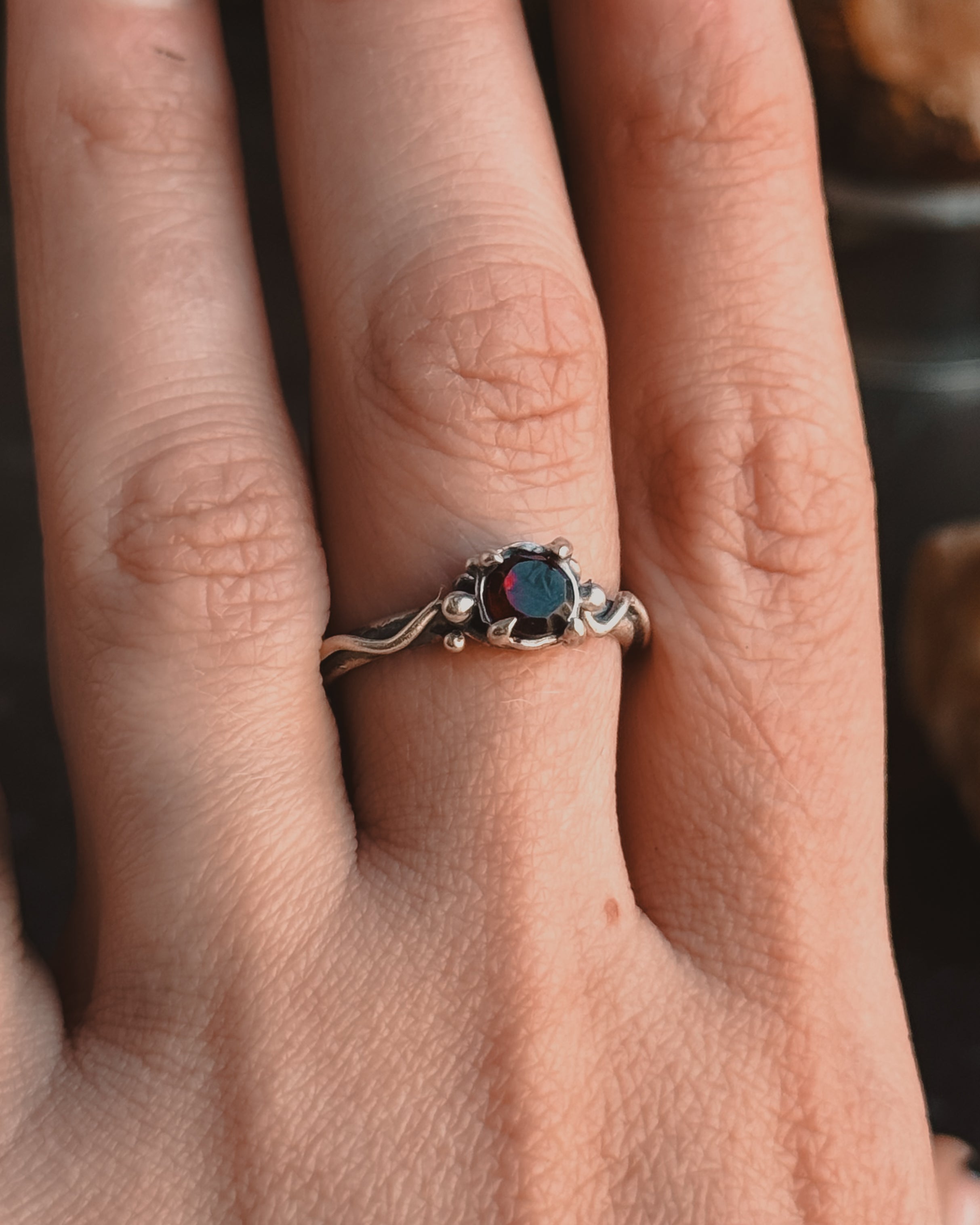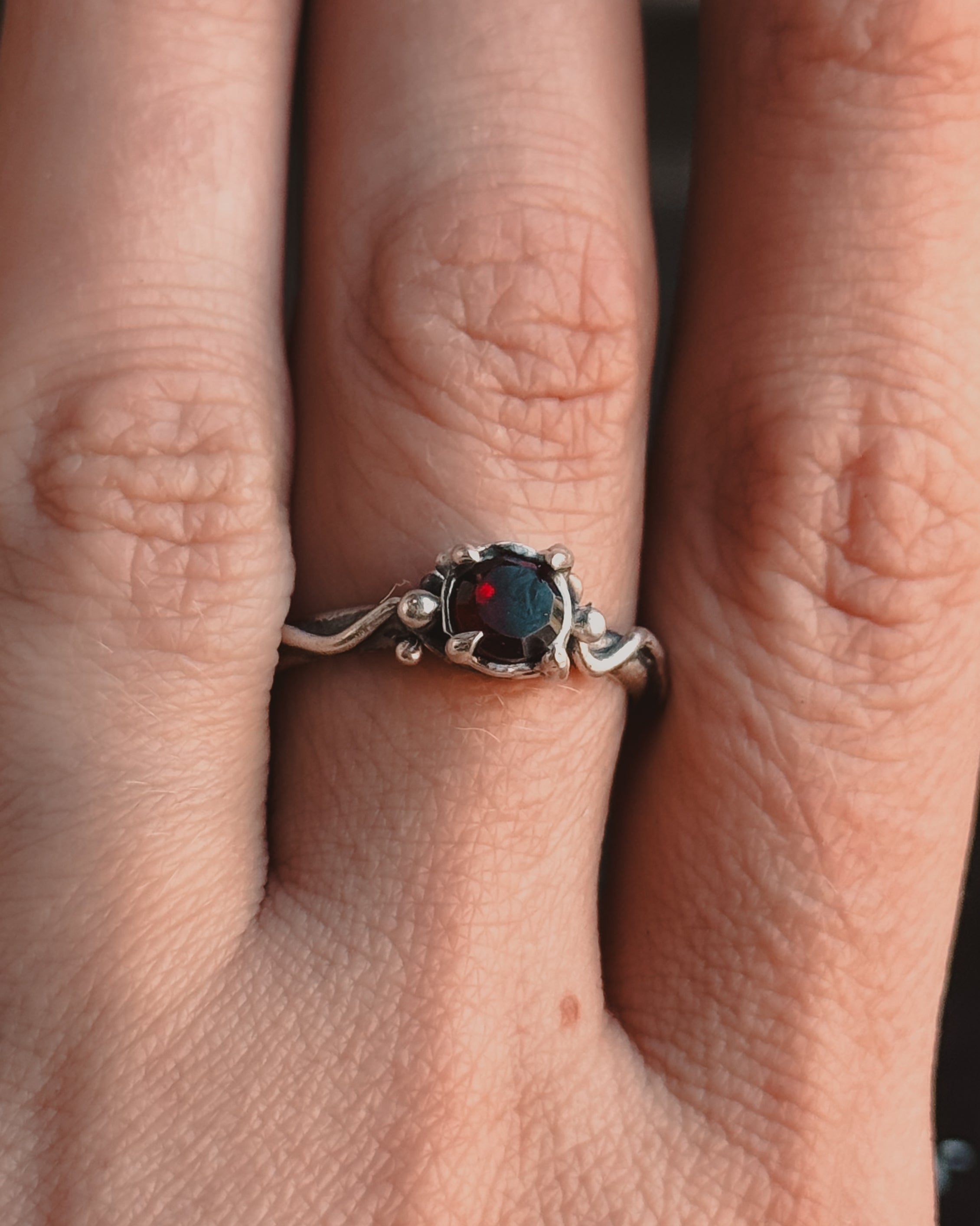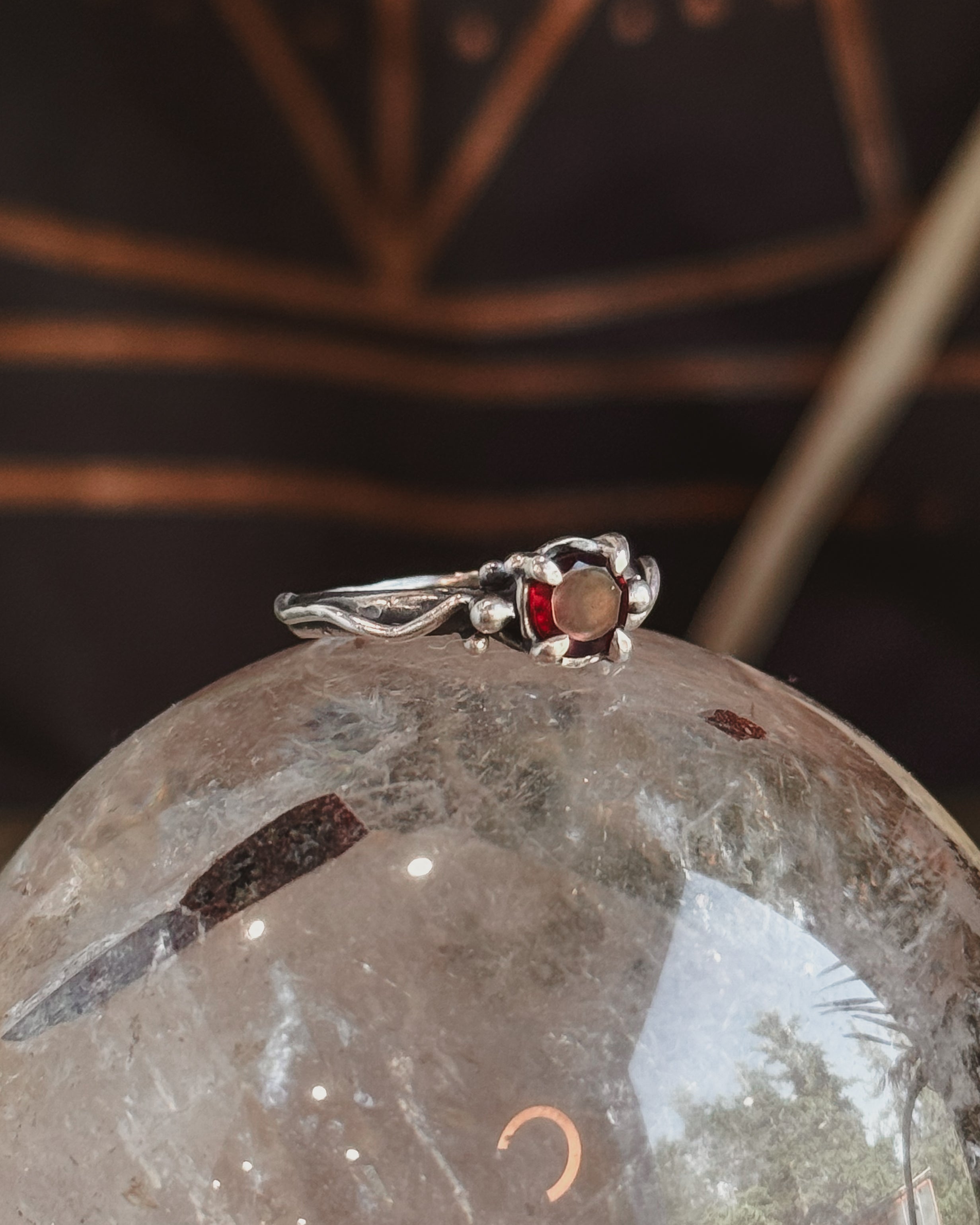 Hand carved and cast sterling silver Ritual Ring featuring Garnet. If you have questions regarding fit, you can contact us at any time. We are happy to help you determine your ring size.