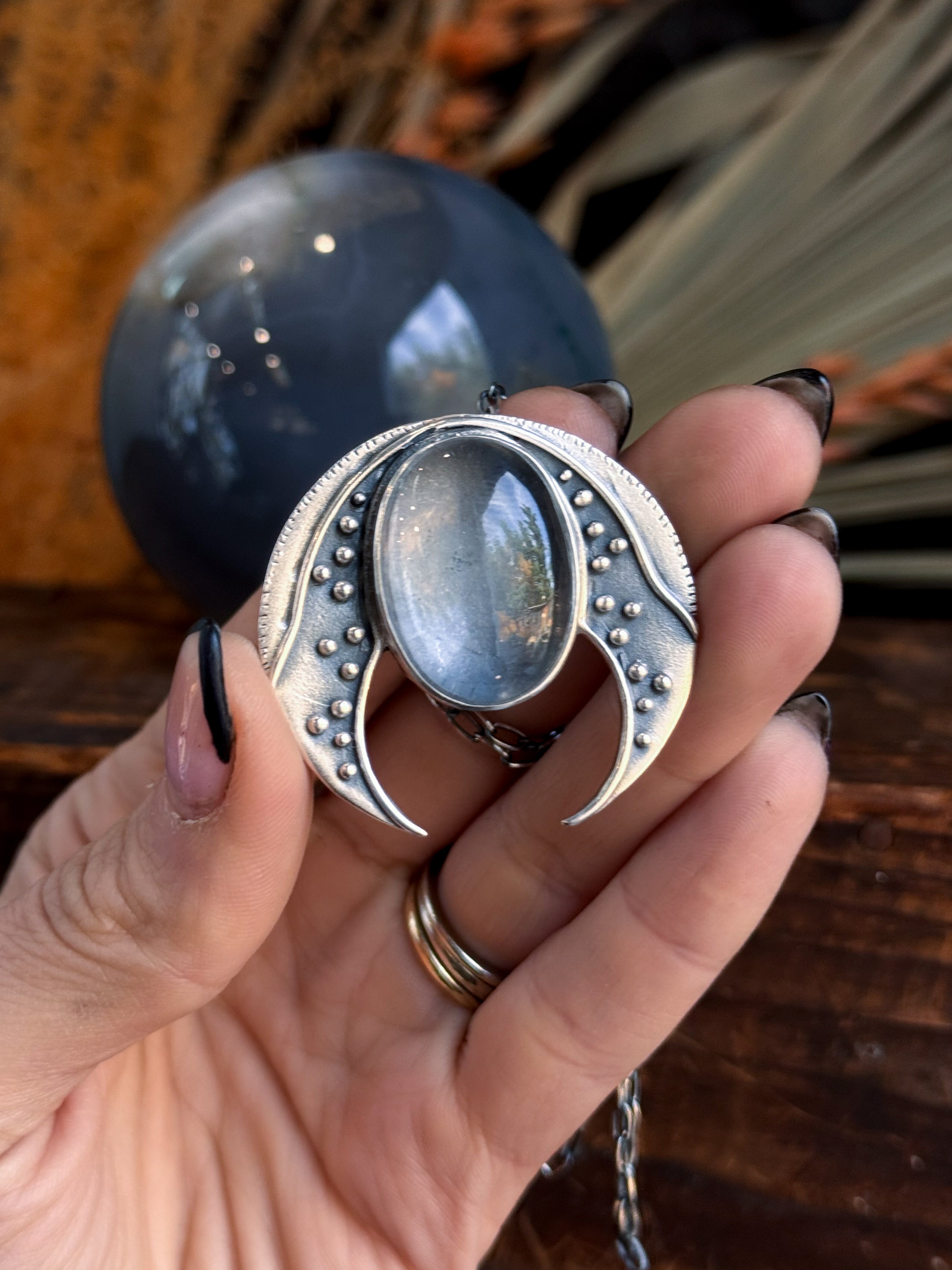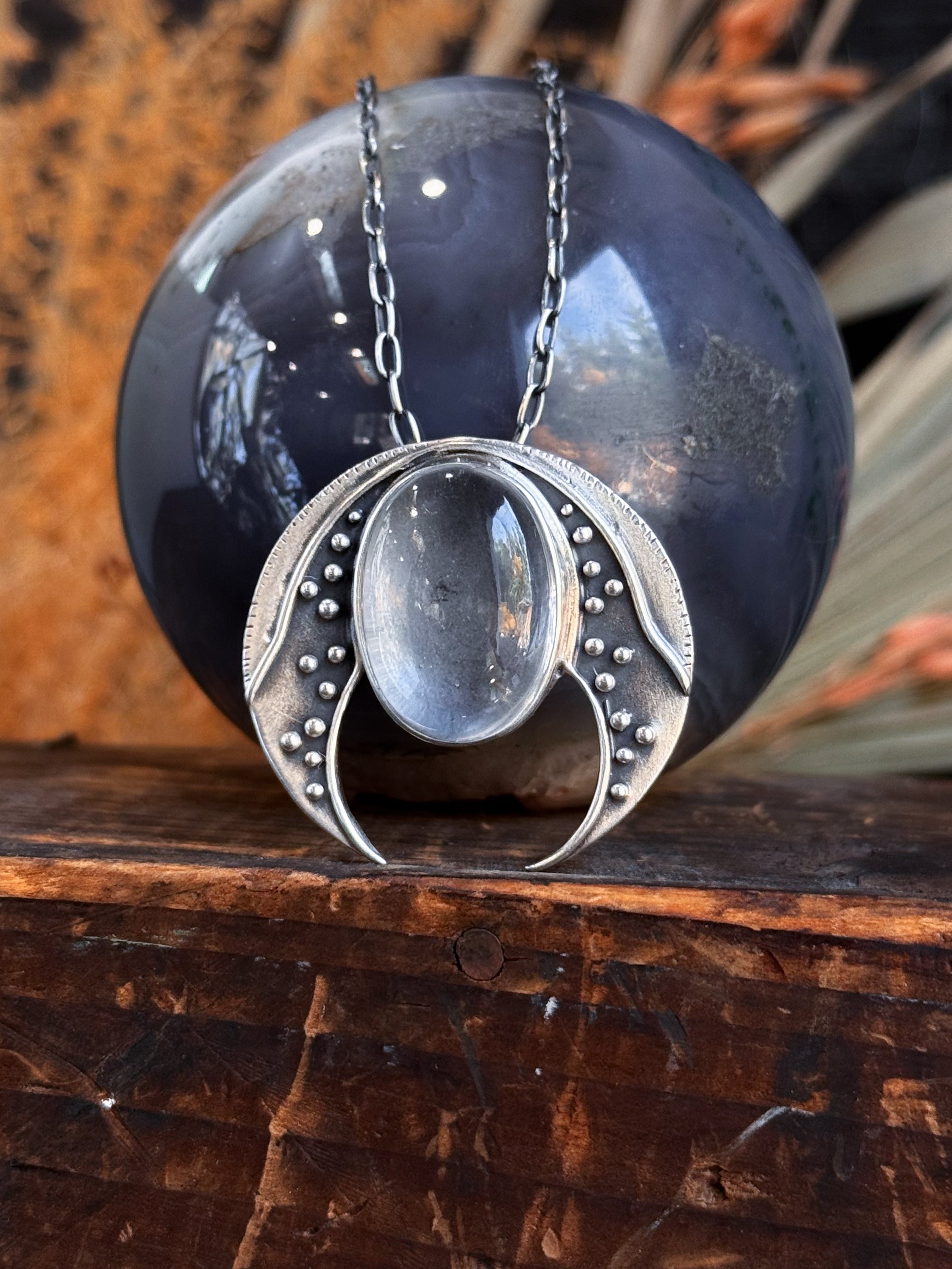 Handcrafted in solid sterling silver, this celestial-inspired piece celebrates your connection to the moon's mystical influence and transformative cycles. The carefully designed pendant honors the ancient relationship between humans and the night sky, serving as a powerful amplifier for your spiritual practice and intentions. As moonlight reflects and magnifies, so does this crystal enhance your natural energies and intuitive abilities.