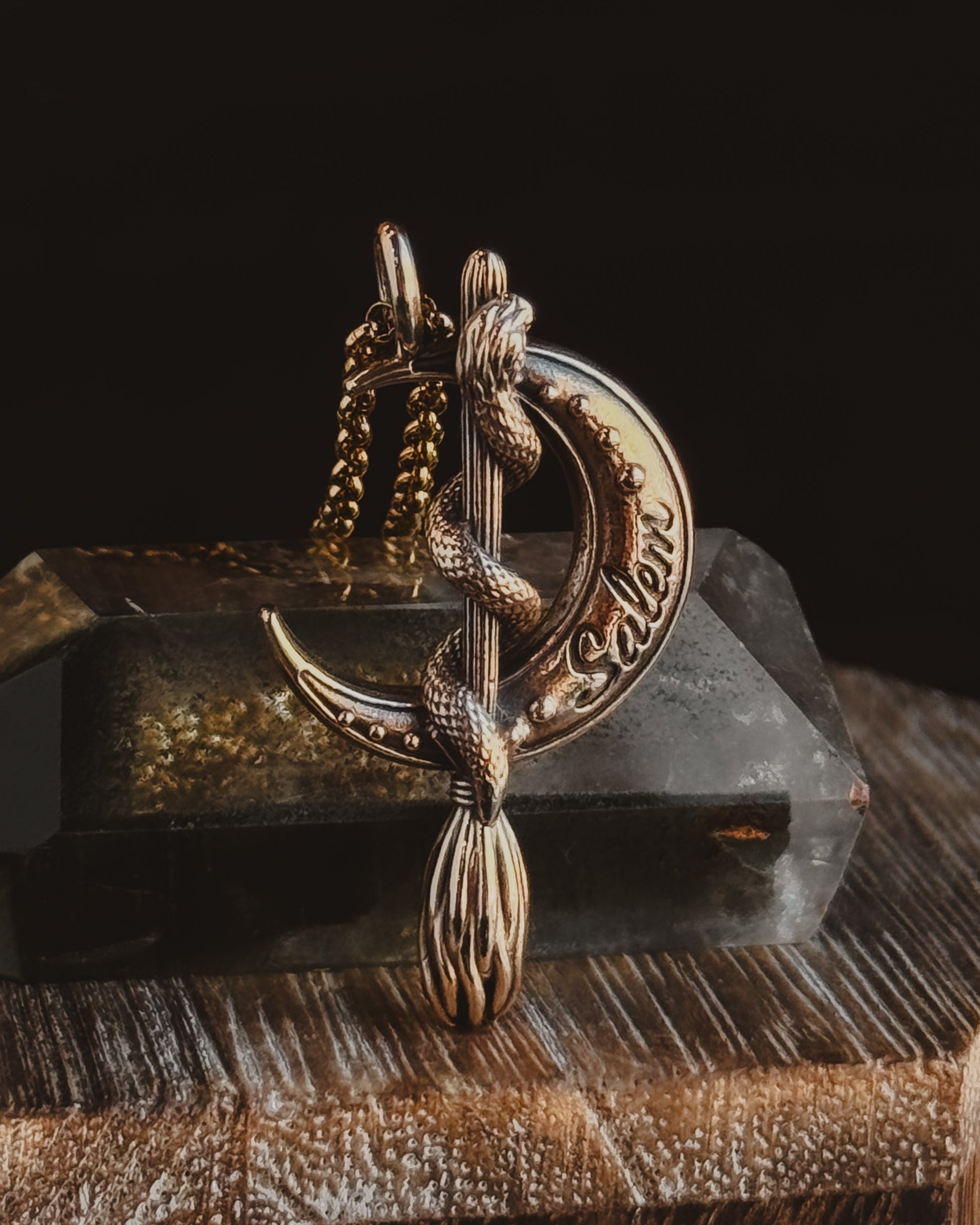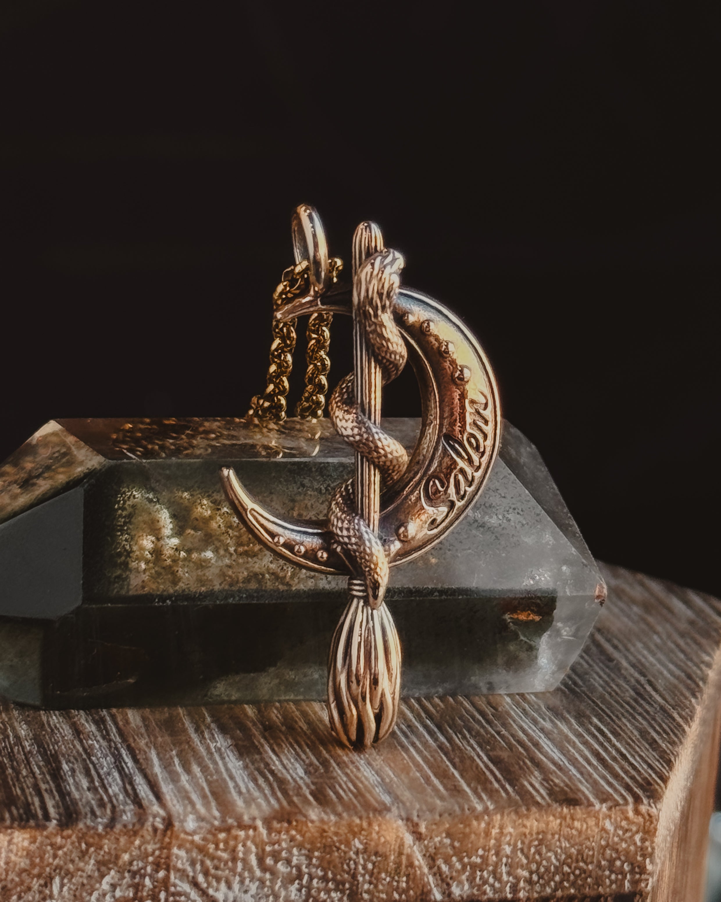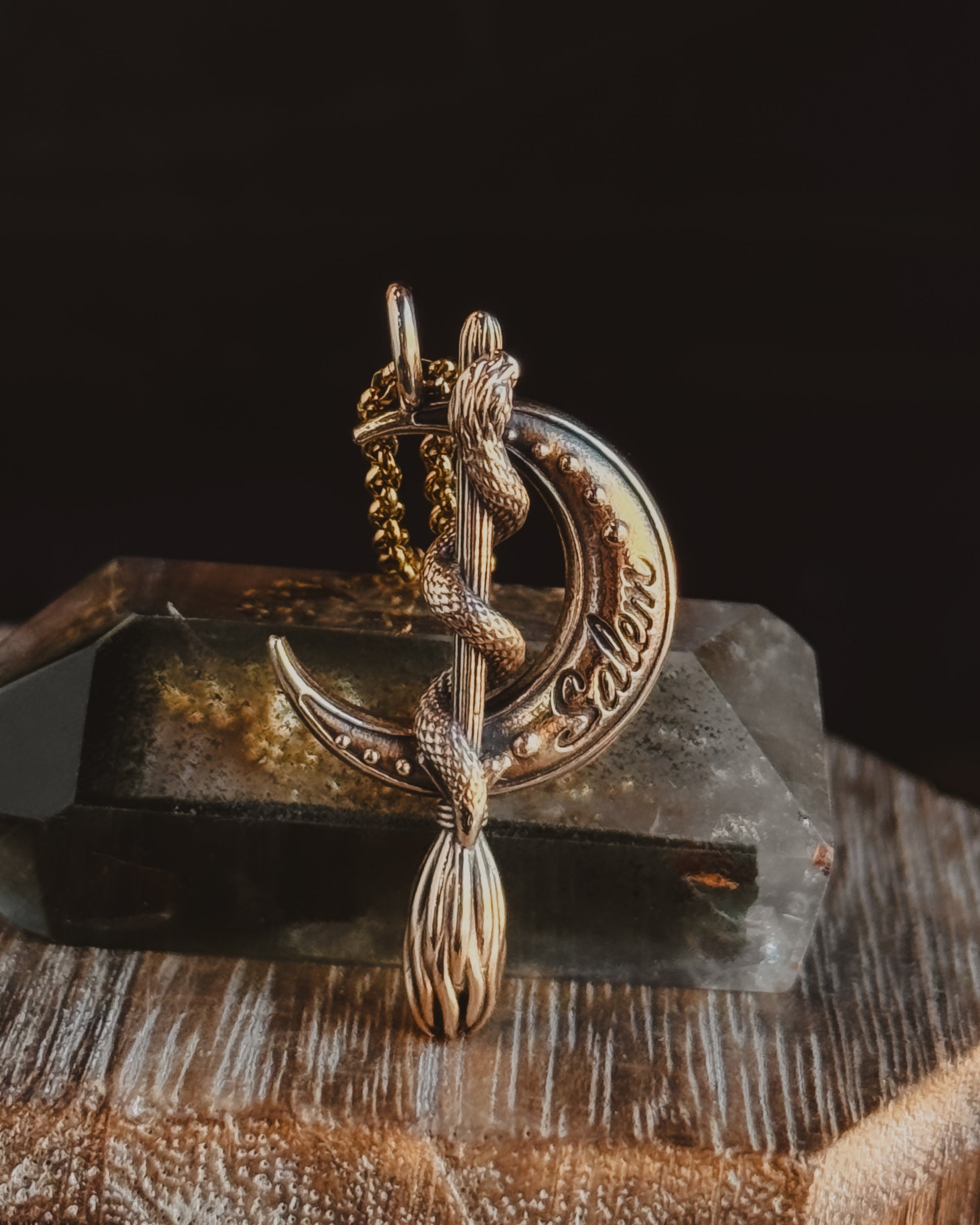 The Salem Necklace pays tribute to the spirit of Salem, a city where history, myth, and modern magic intertwine. Inspired by the iconic Samantha statue, this talisman embodies the freedom, individuality, and mystical power that define both Salem and Acid Queen Jewelry. The crescent moon, broom, and serpent—symbols of intuition, transformation, and wisdom—come together in a celebration of authenticity and self-expression.