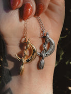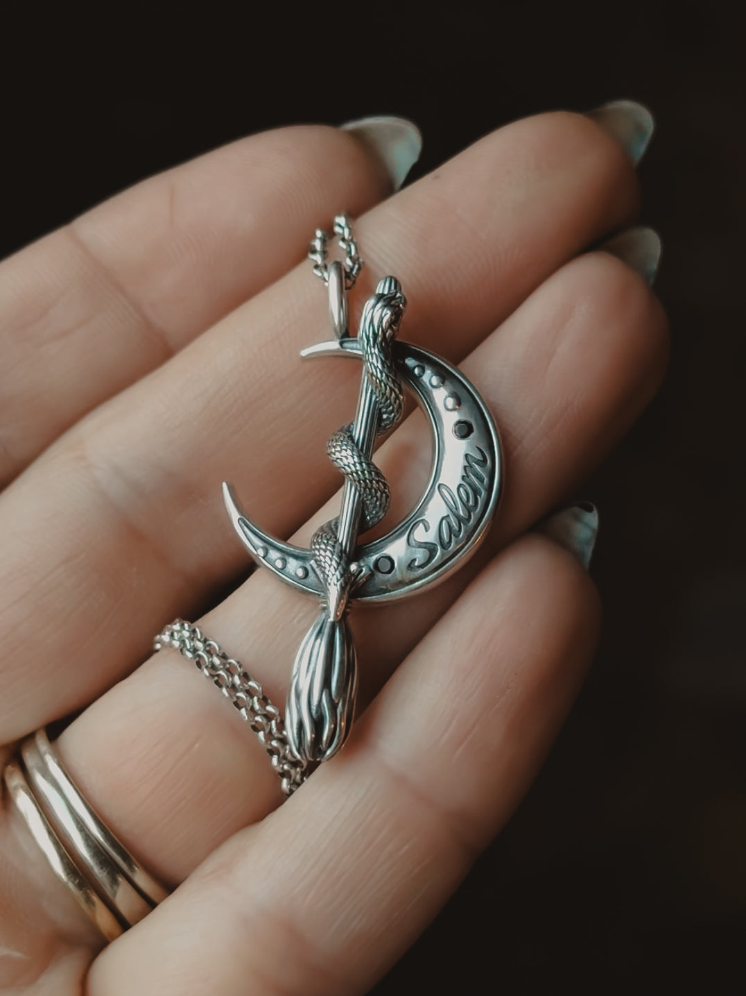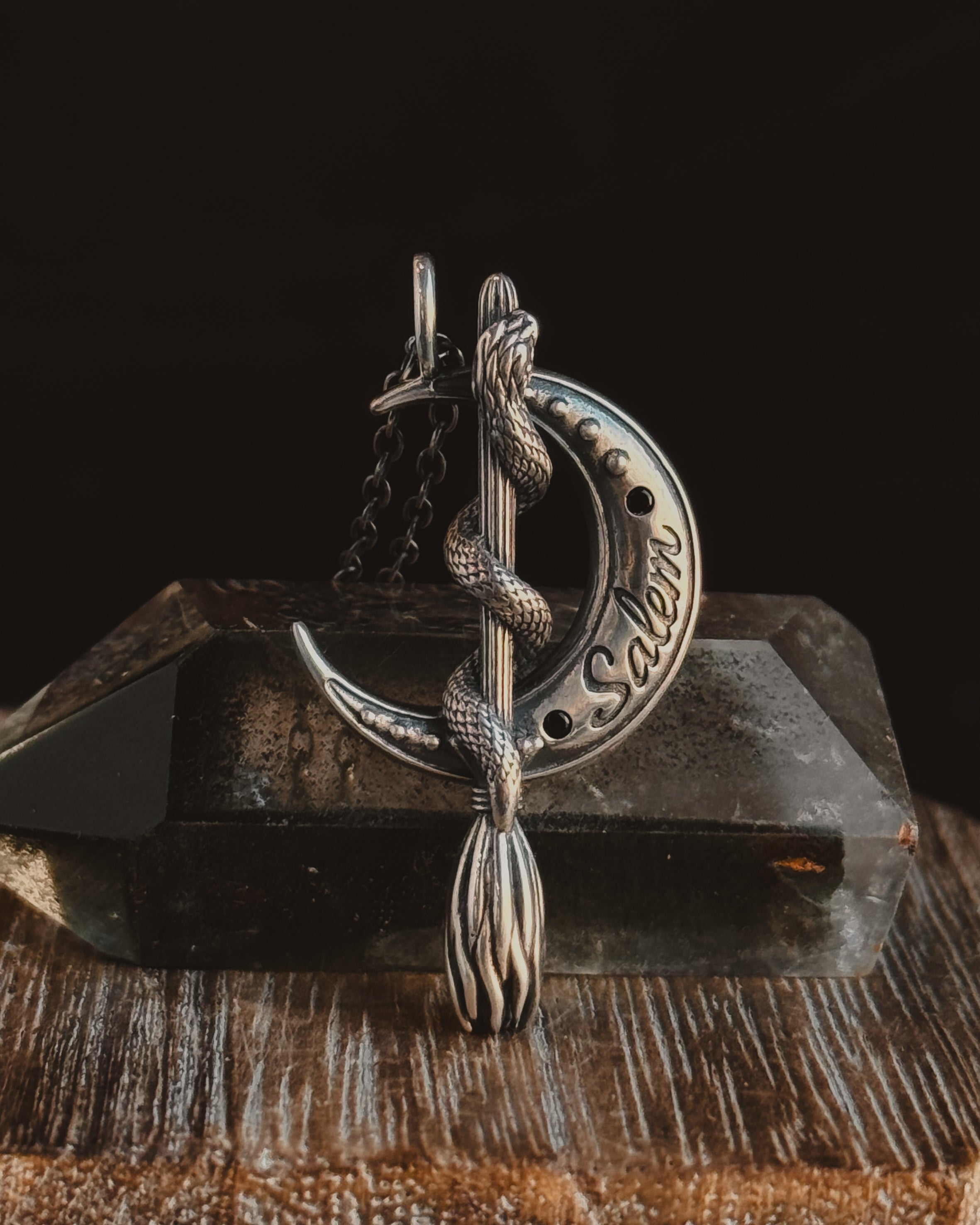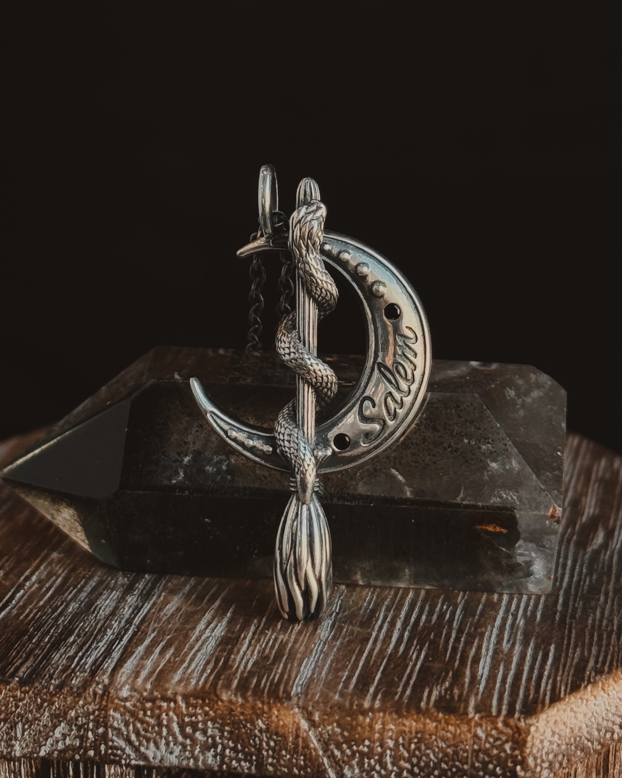 The Salem Necklace pays tribute to the spirit of Salem, a city where history, myth, and modern magic intertwine. Inspired by the iconic Samantha statue, this talisman embodies the freedom, individuality, and mystical power that define both Salem and Acid Queen Jewelry. The crescent moon, broom, and serpent—symbols of intuition, transformation, and wisdom—come together in a celebration of authenticity and self-expression.
