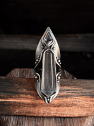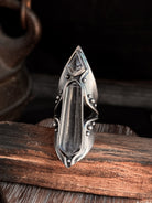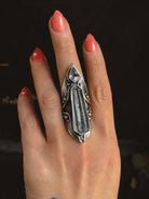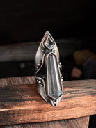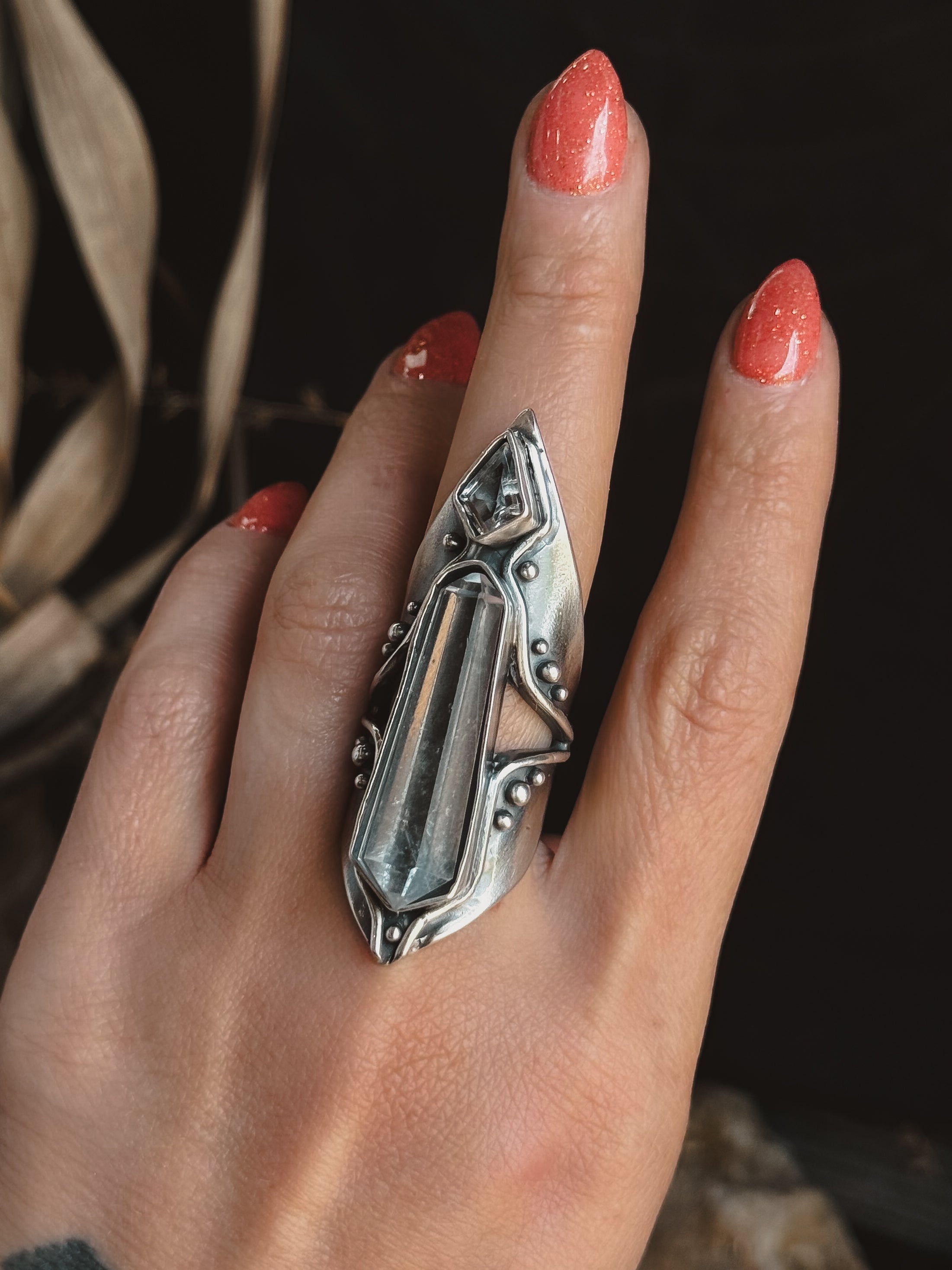 Hand carved and cast sterling silver Amplifier Cut-out Ring featuring a natural Double Quartz setting. If you have questions regarding fit, you can contact us at any time. We are happy to help you determine your ring size.