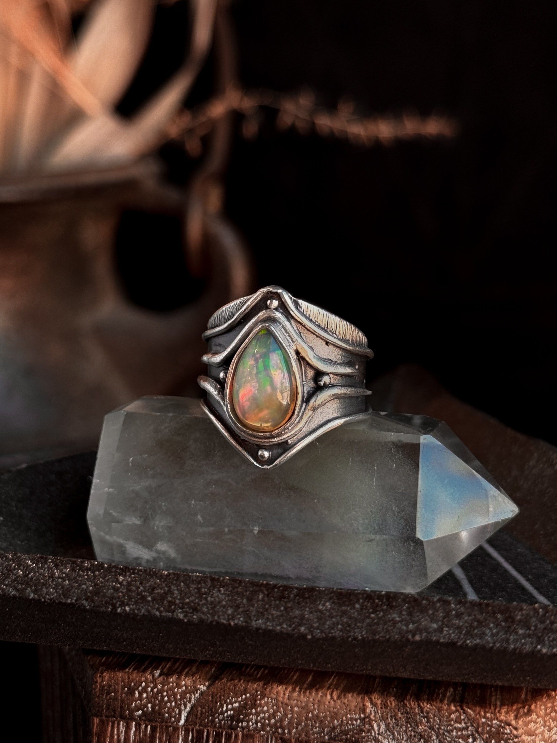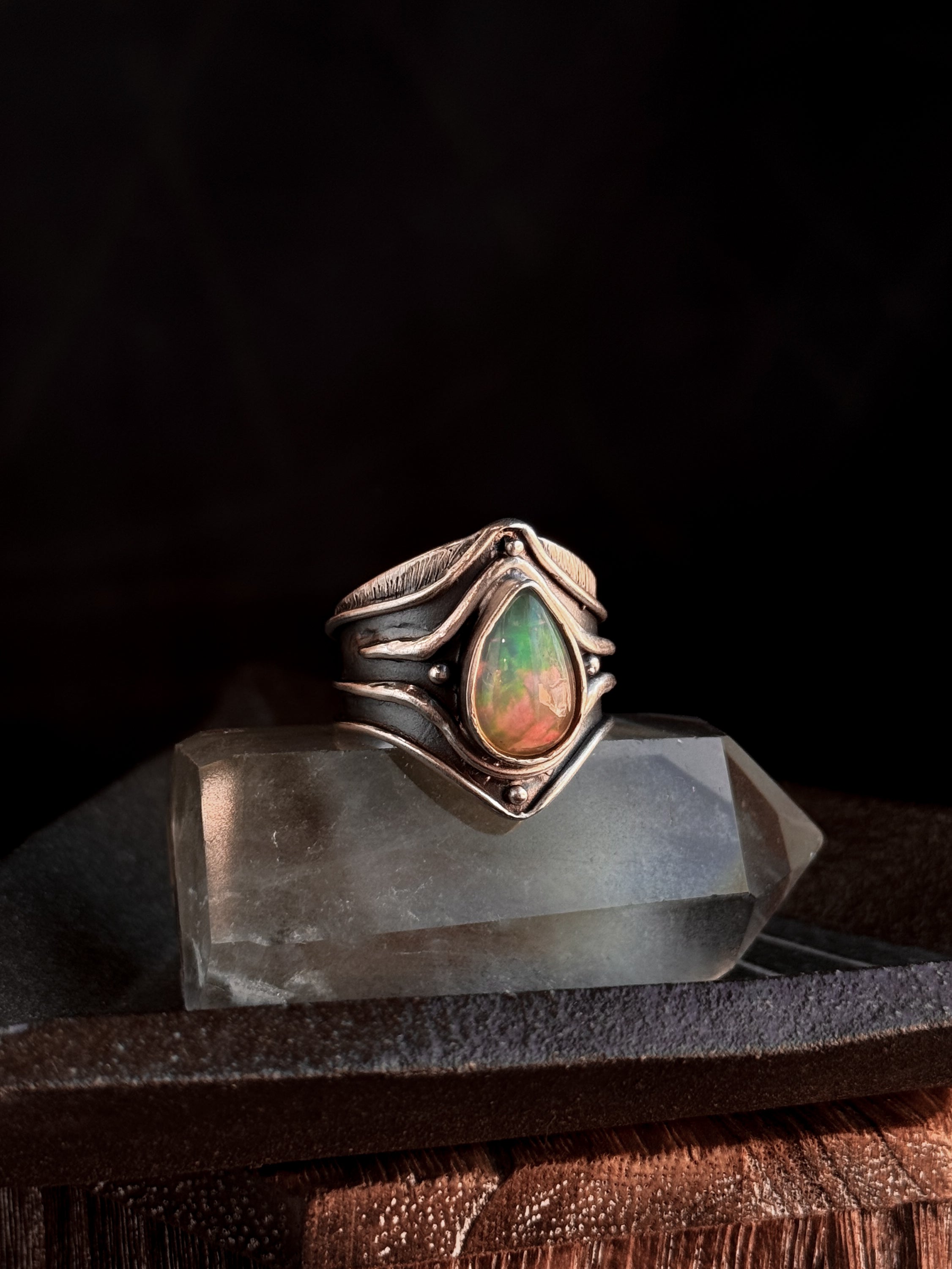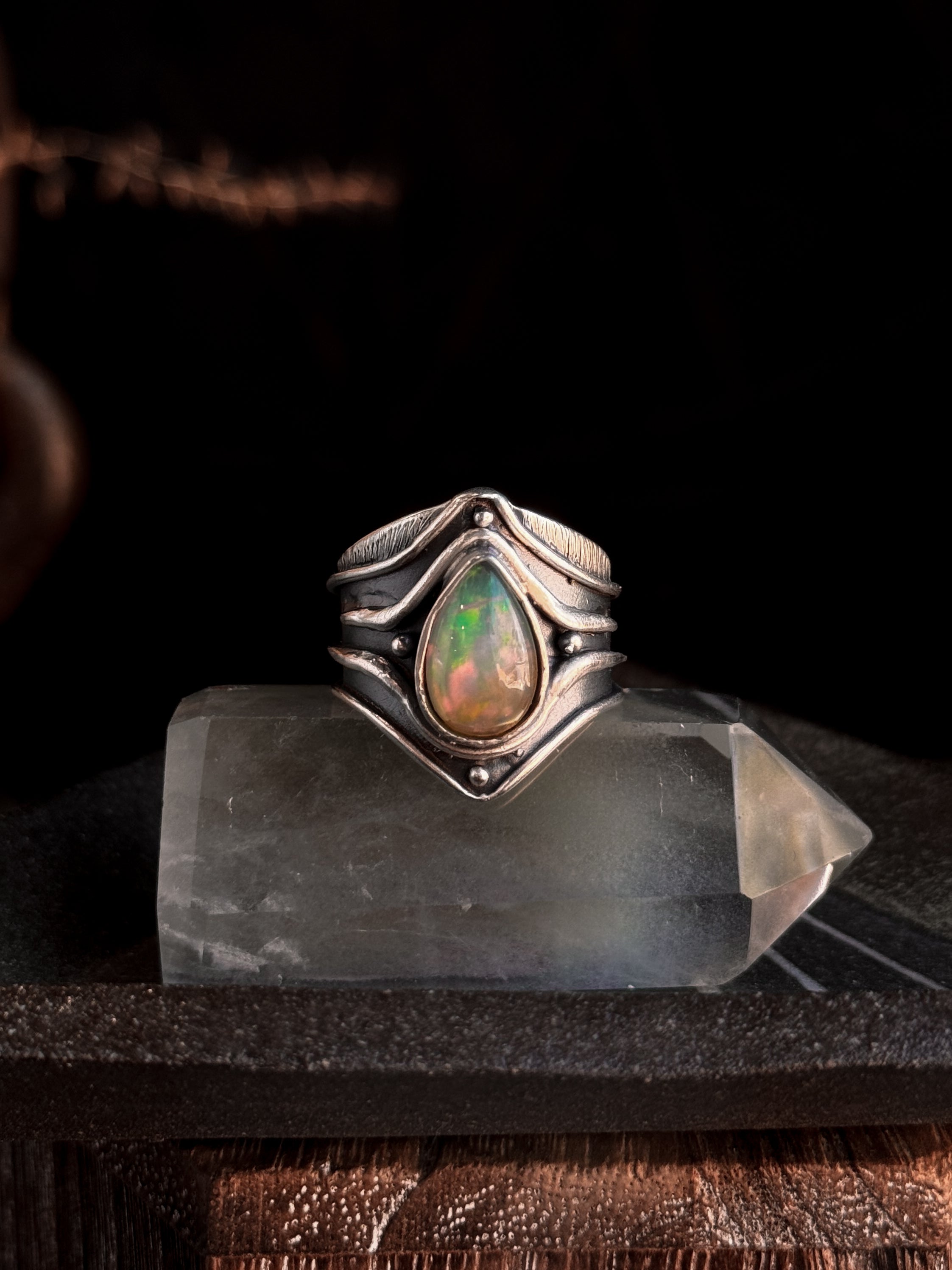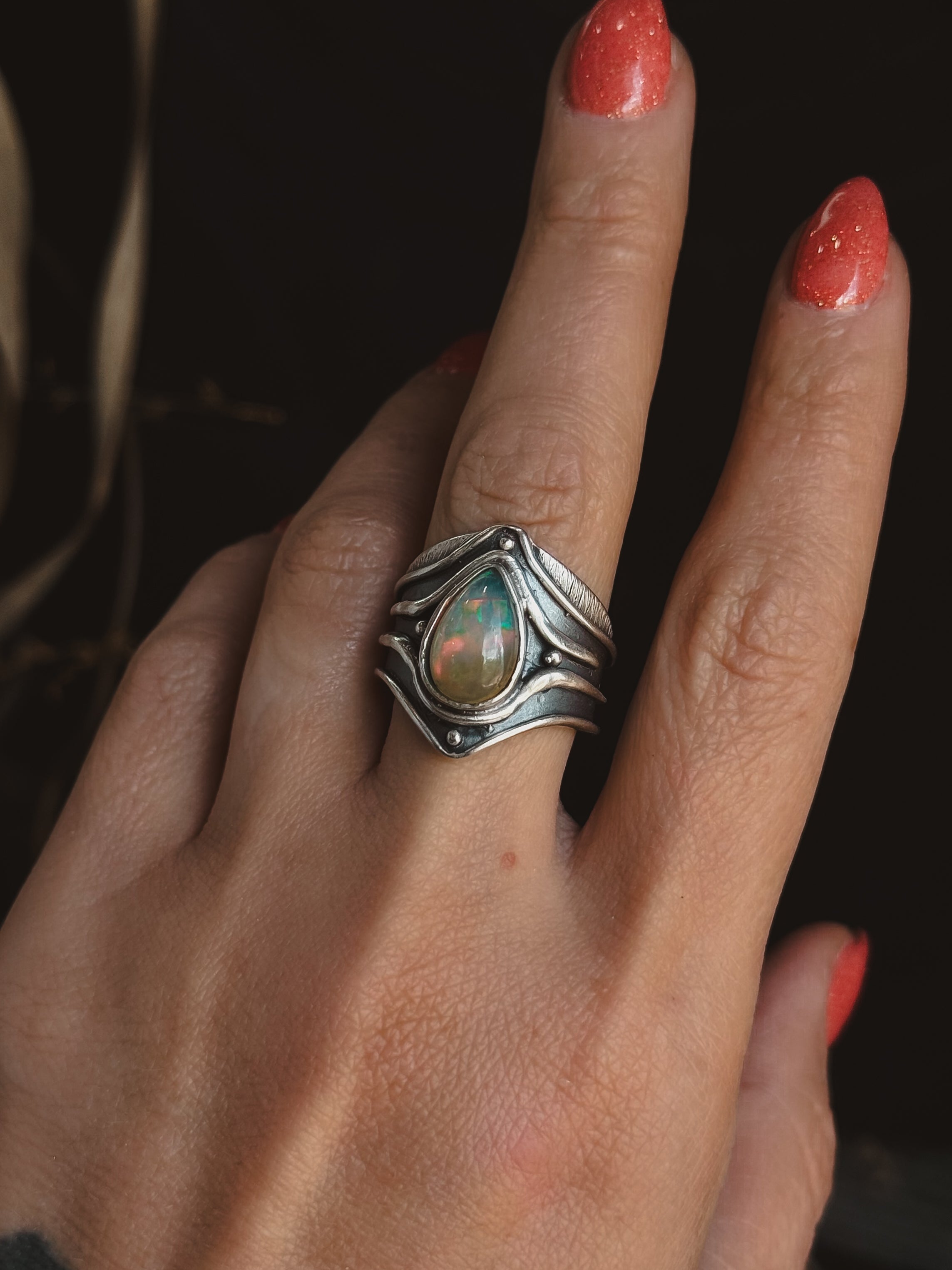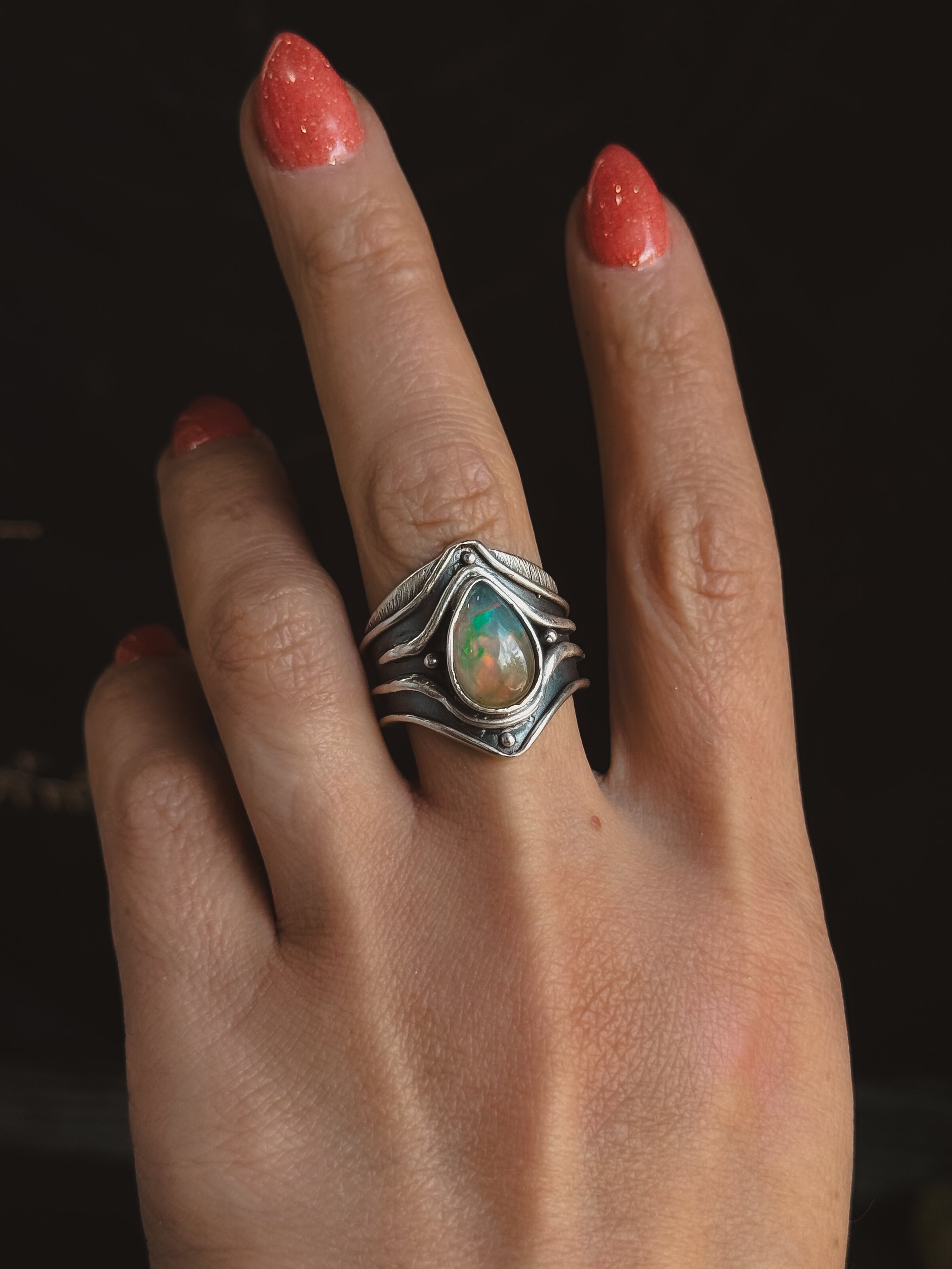 Hand carved and cast sterling silver Connections Ring featuring a natural opal. If you have questions regarding fit, you can contact us at any time. We are happy to help you determine your ring size.