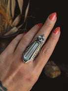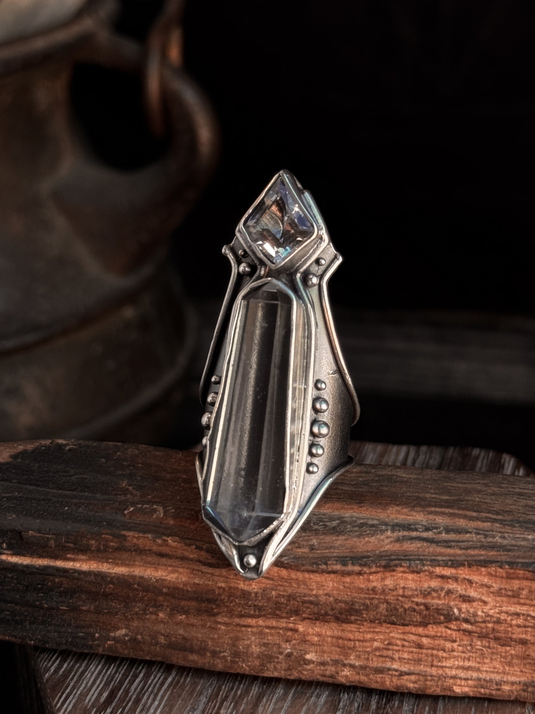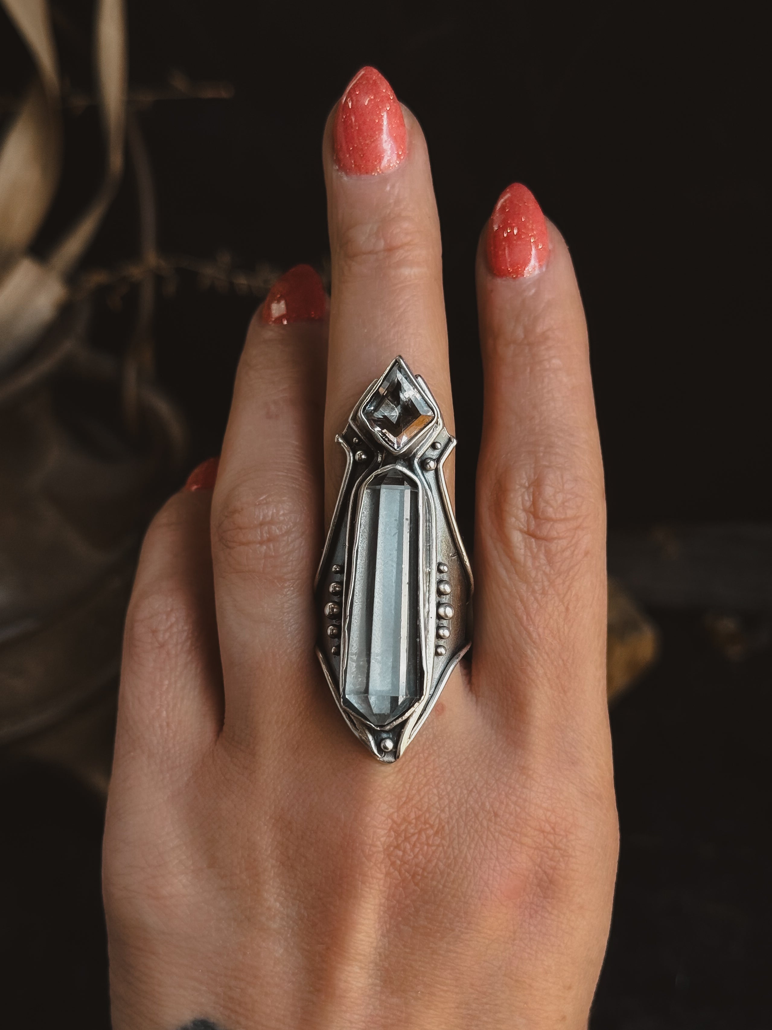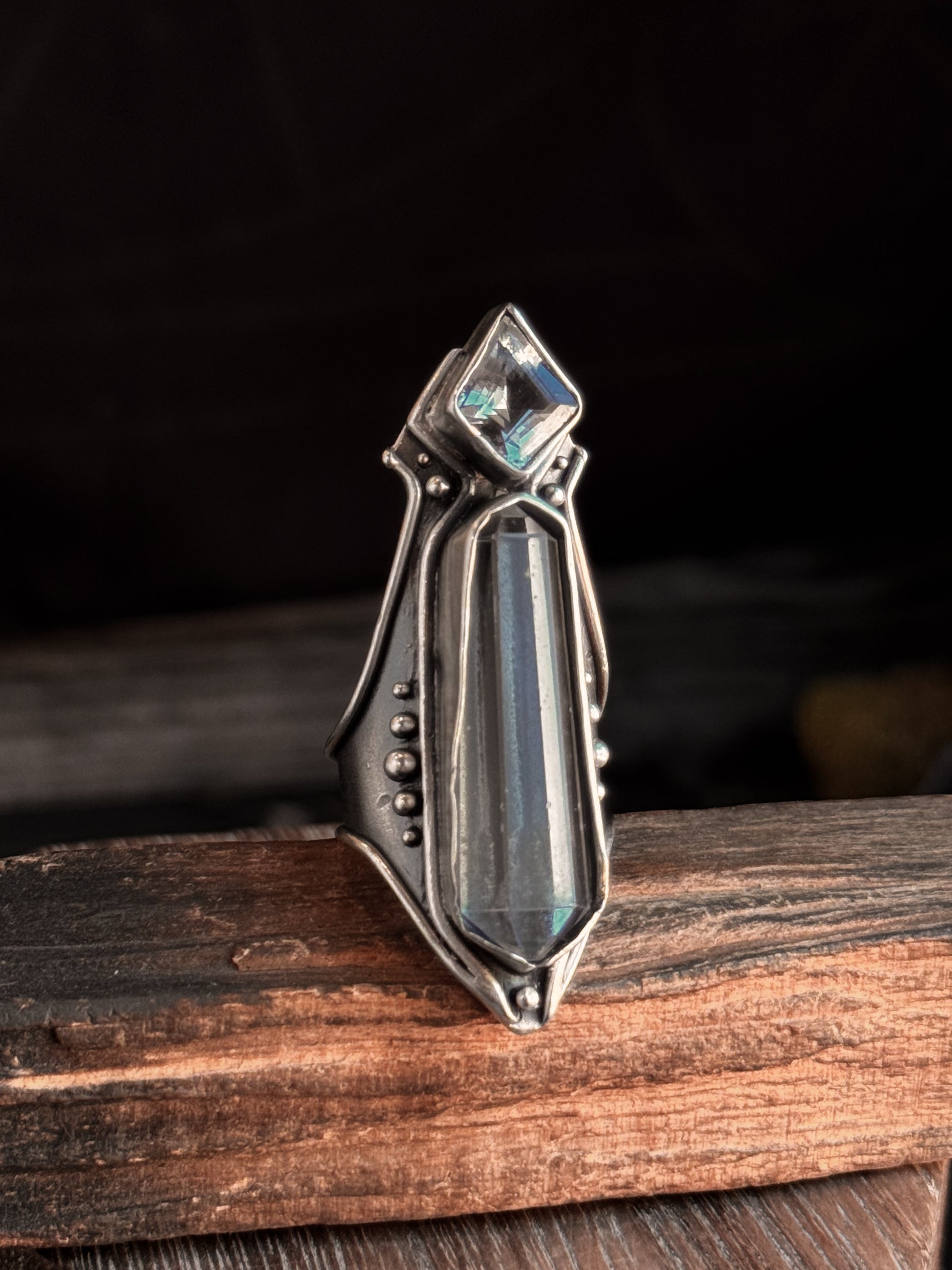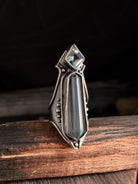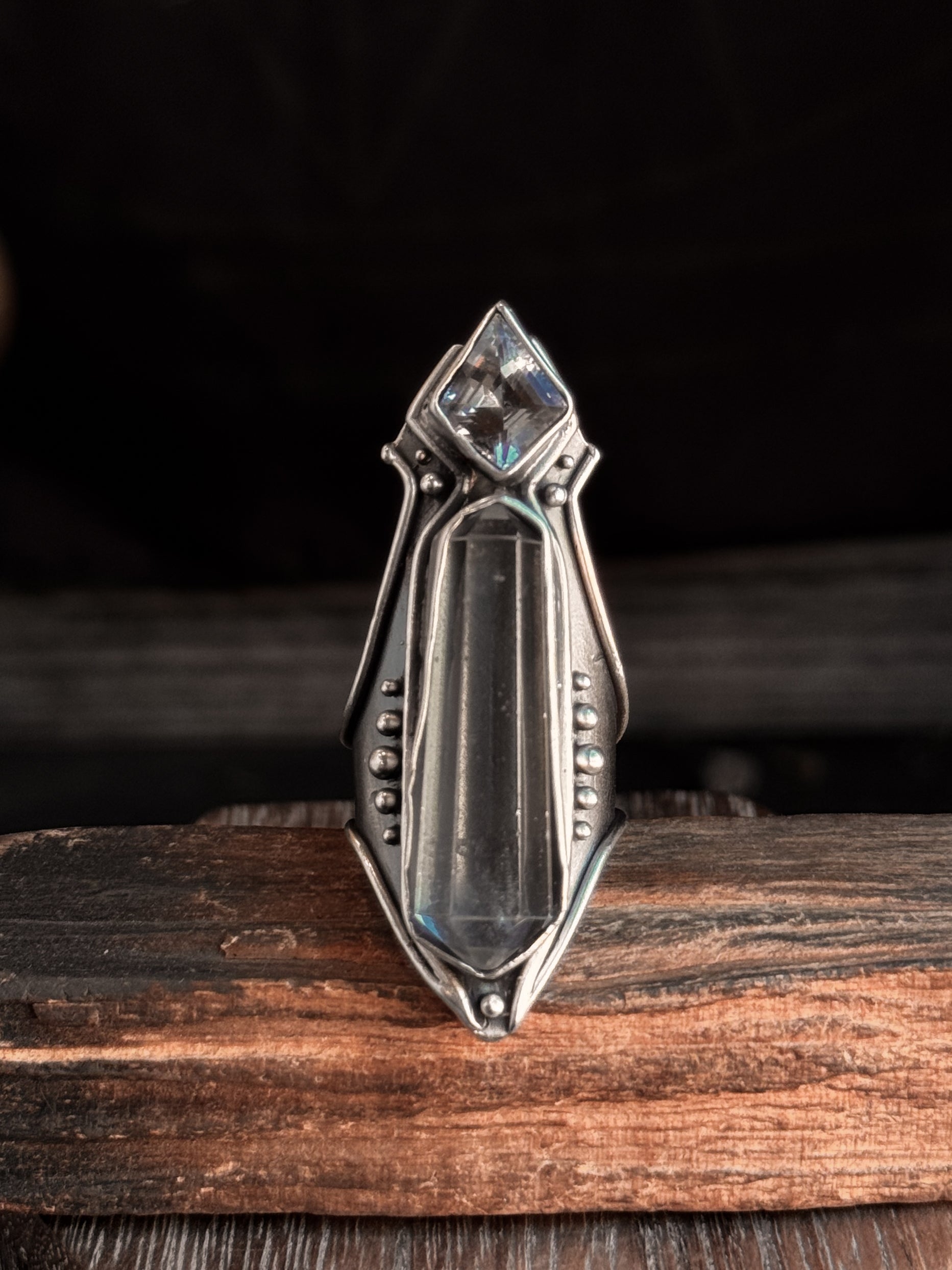 Hand carved and cast sterling silver Amplifier Ring featuring a natural Double Quartz setting. If you have questions regarding fit, you can contact us at any time. We are happy to help you determine your ring size.