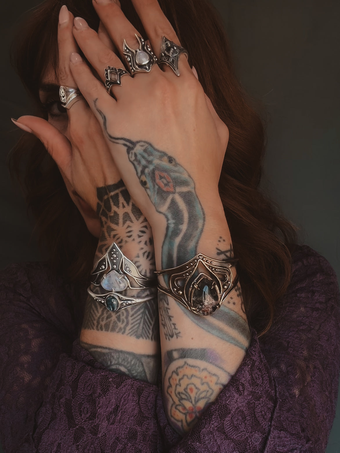 Each piece is hand fabricated in our Idyllwild, CA studio. Using Acid Queen’s signature technique, we build each piece in wax, cast in small batches, and hand finish to bring you wearable art that is bold, powerful and beautiful.
