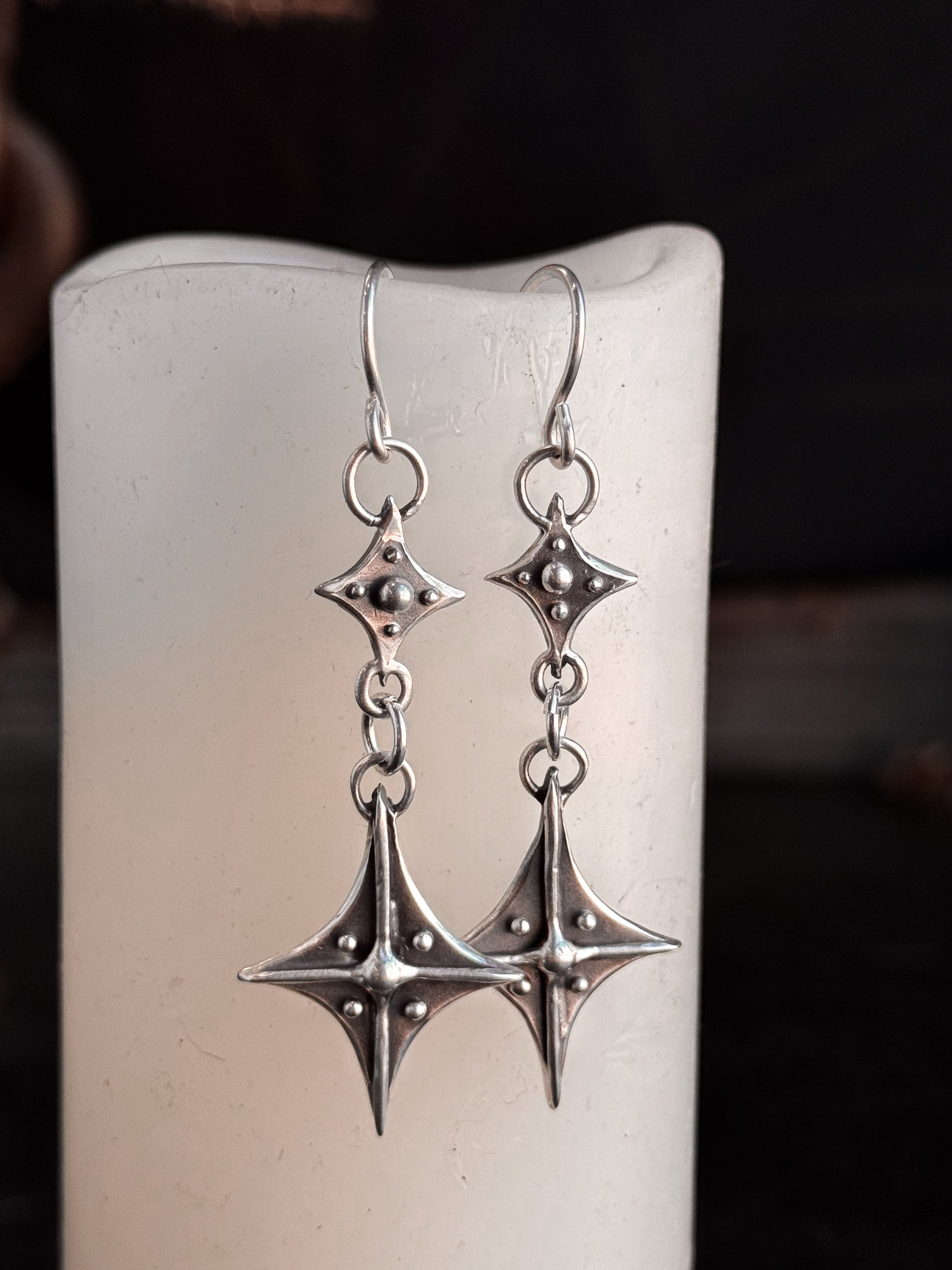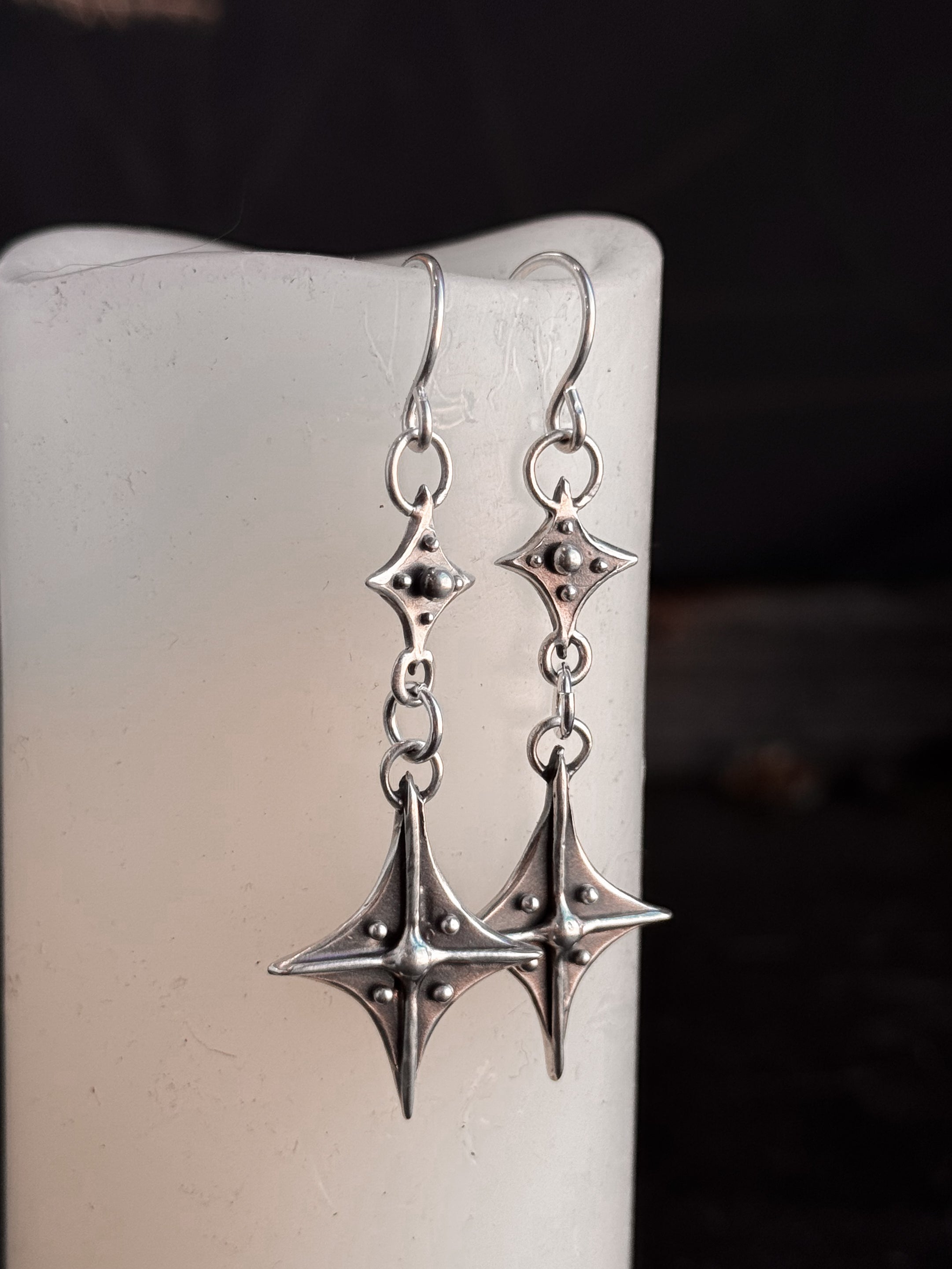 This piece is solid sterling silver including the earhooks and findings. Sterling silver Star Blast Earrings.