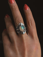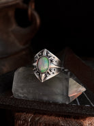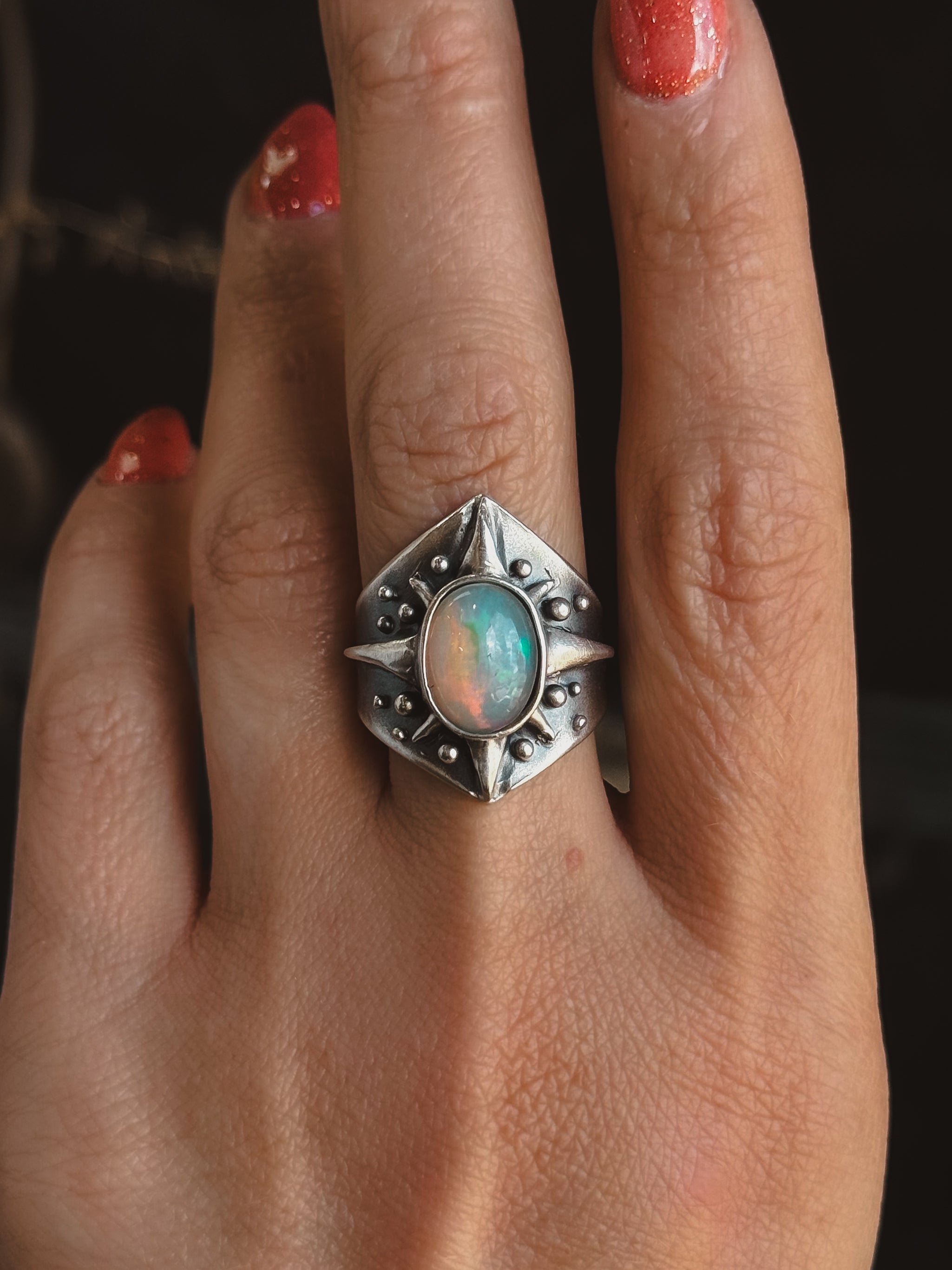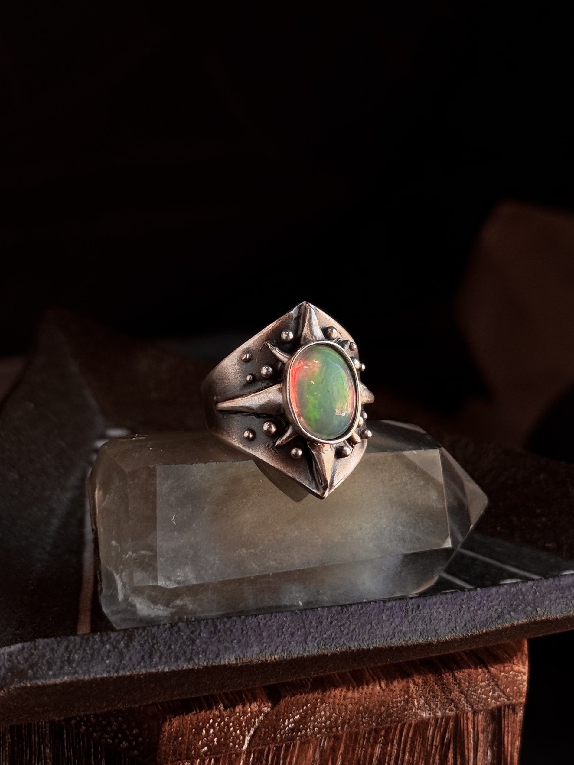 Hand carved and cast sterling silver Supernova Ring featuring a natural Opal. If you have questions regarding fit, you can contact us at any time. We are happy to help you determine your ring size.
