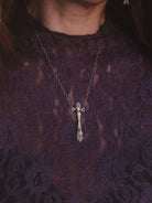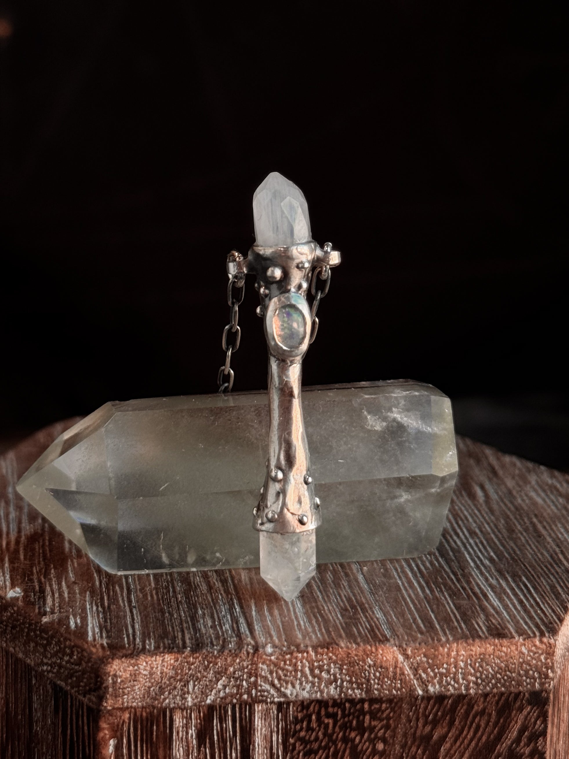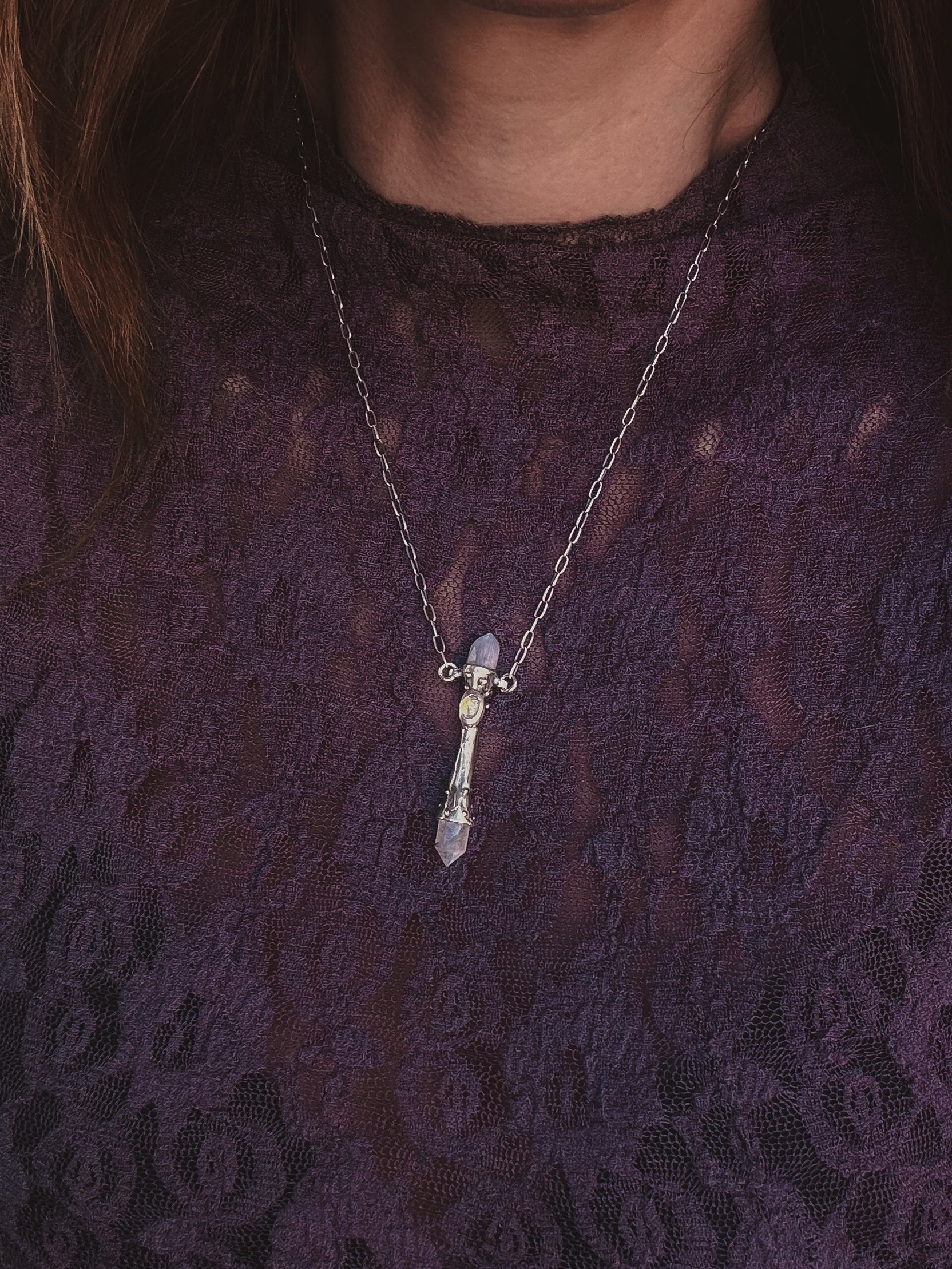 This piece is solid sterling silver including the chain and findings. Wand of Intuition featuring a natural Rainbow Moonstone & Opal