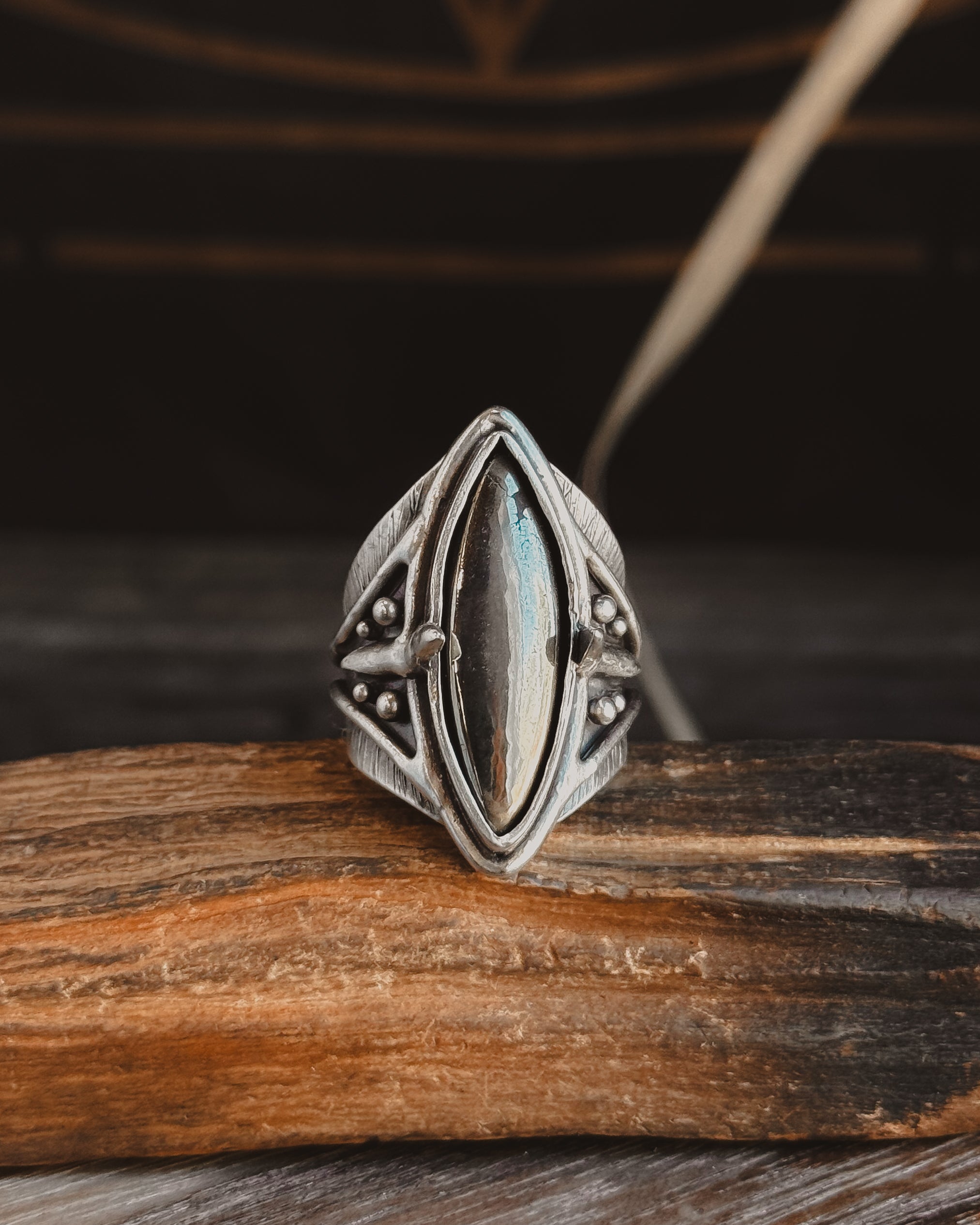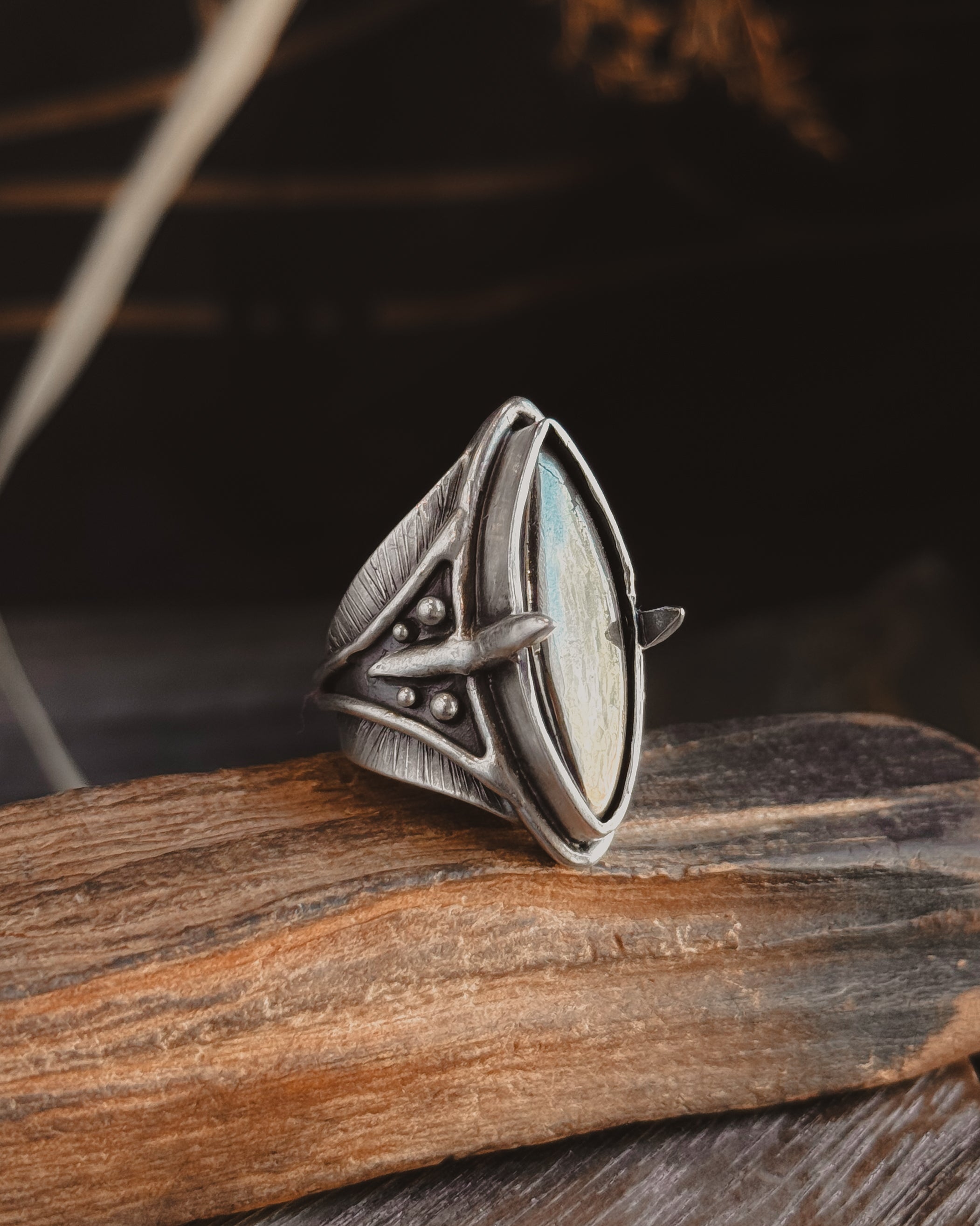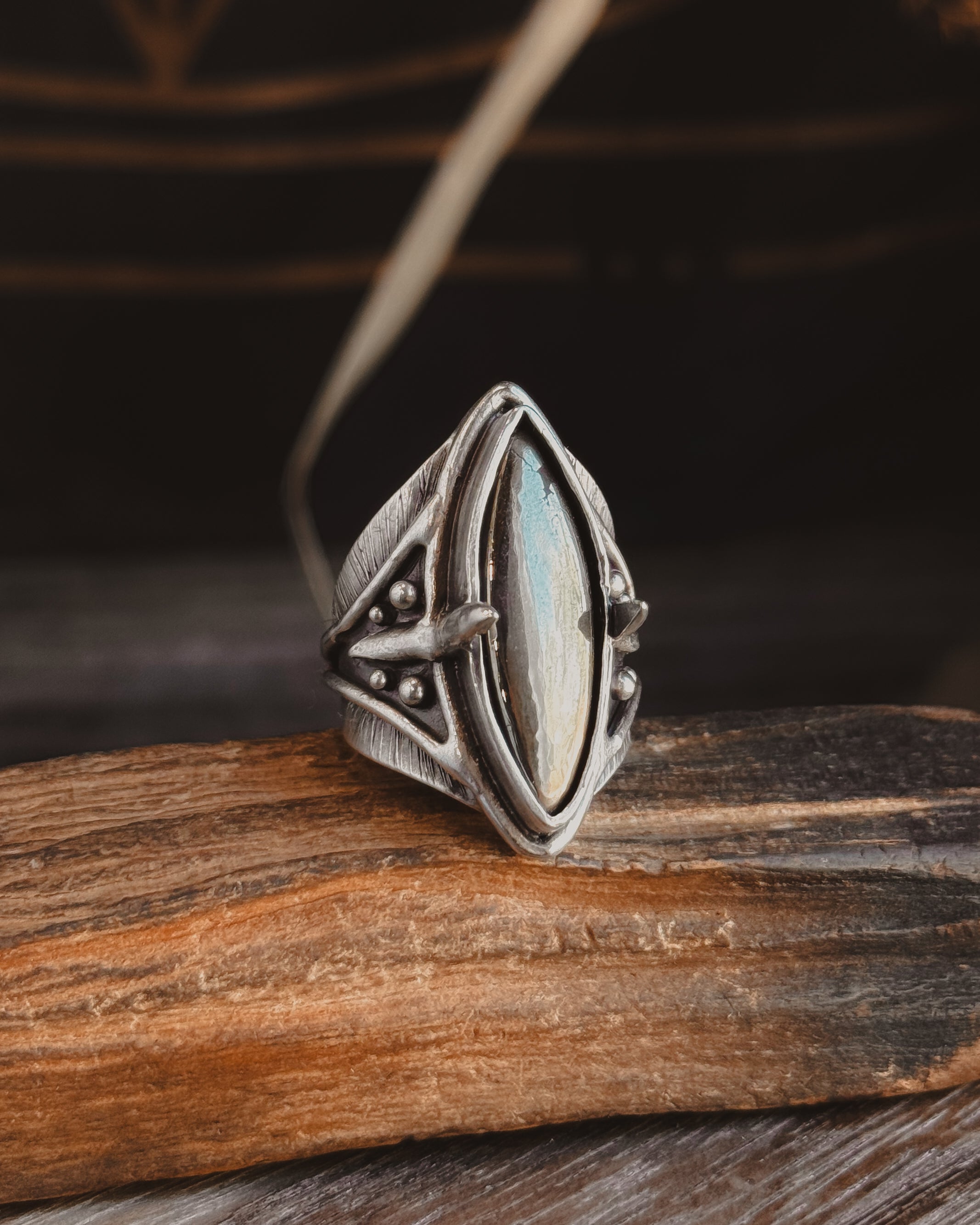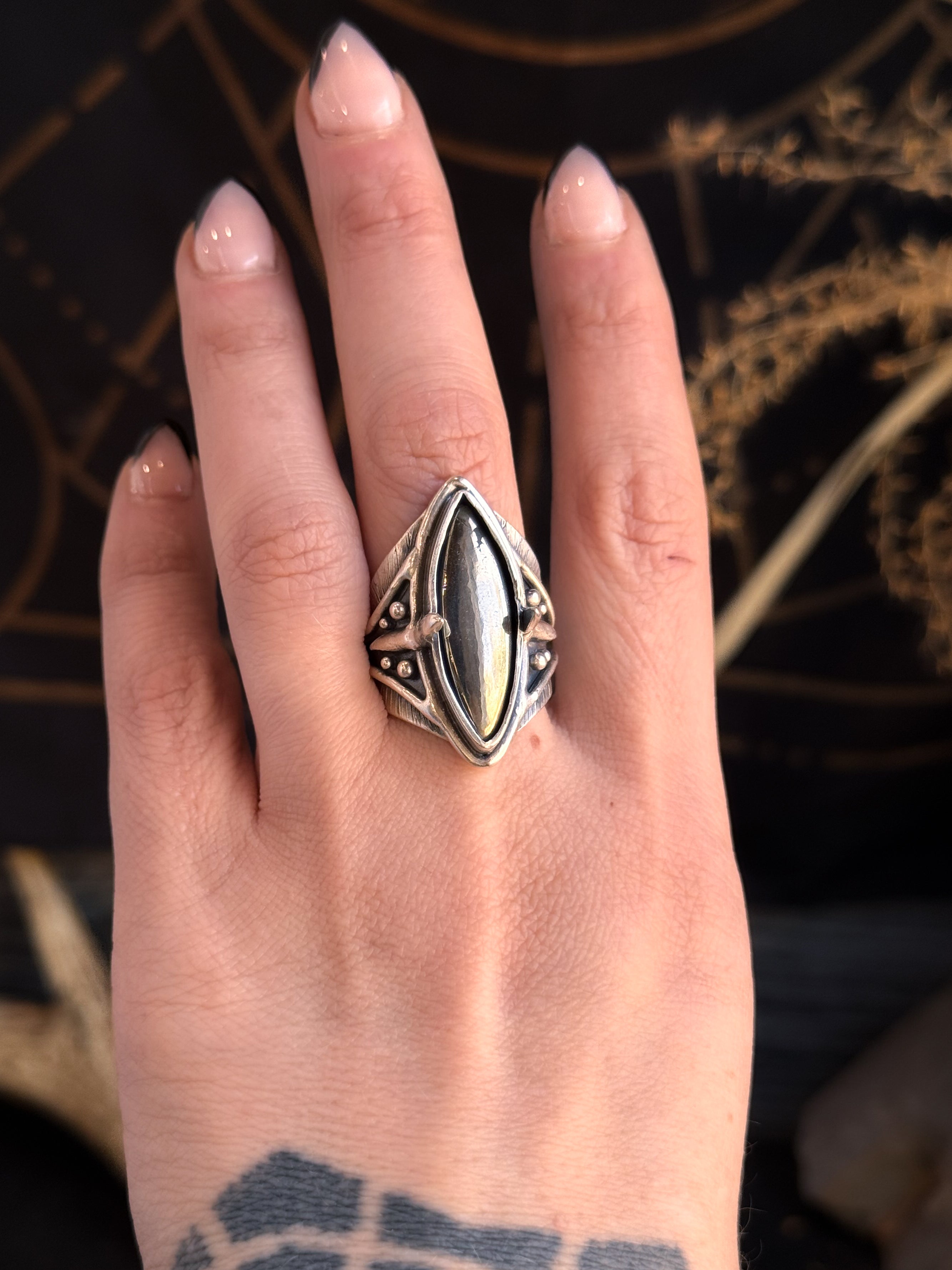 Hand carved and cast sterling silver Trail ring, set with natural Pyrite. If you have questions regarding fit, you can contact us at any time. We are happy to help you determine your ring size.