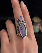 Hand carved and cast sterling silver Calming Force Ring featuring natural Double Amethyst. If you have questions regarding fit, you can contact us at any time. We are happy to help you determine your ring size.