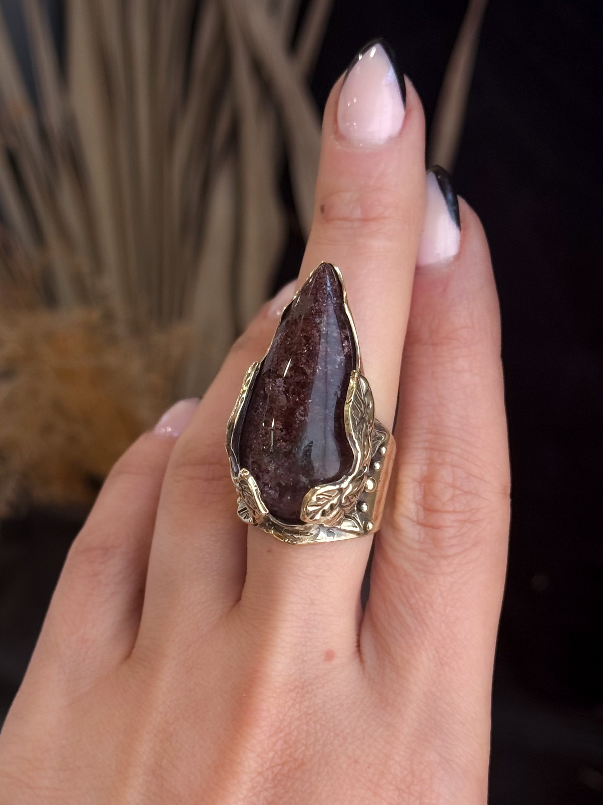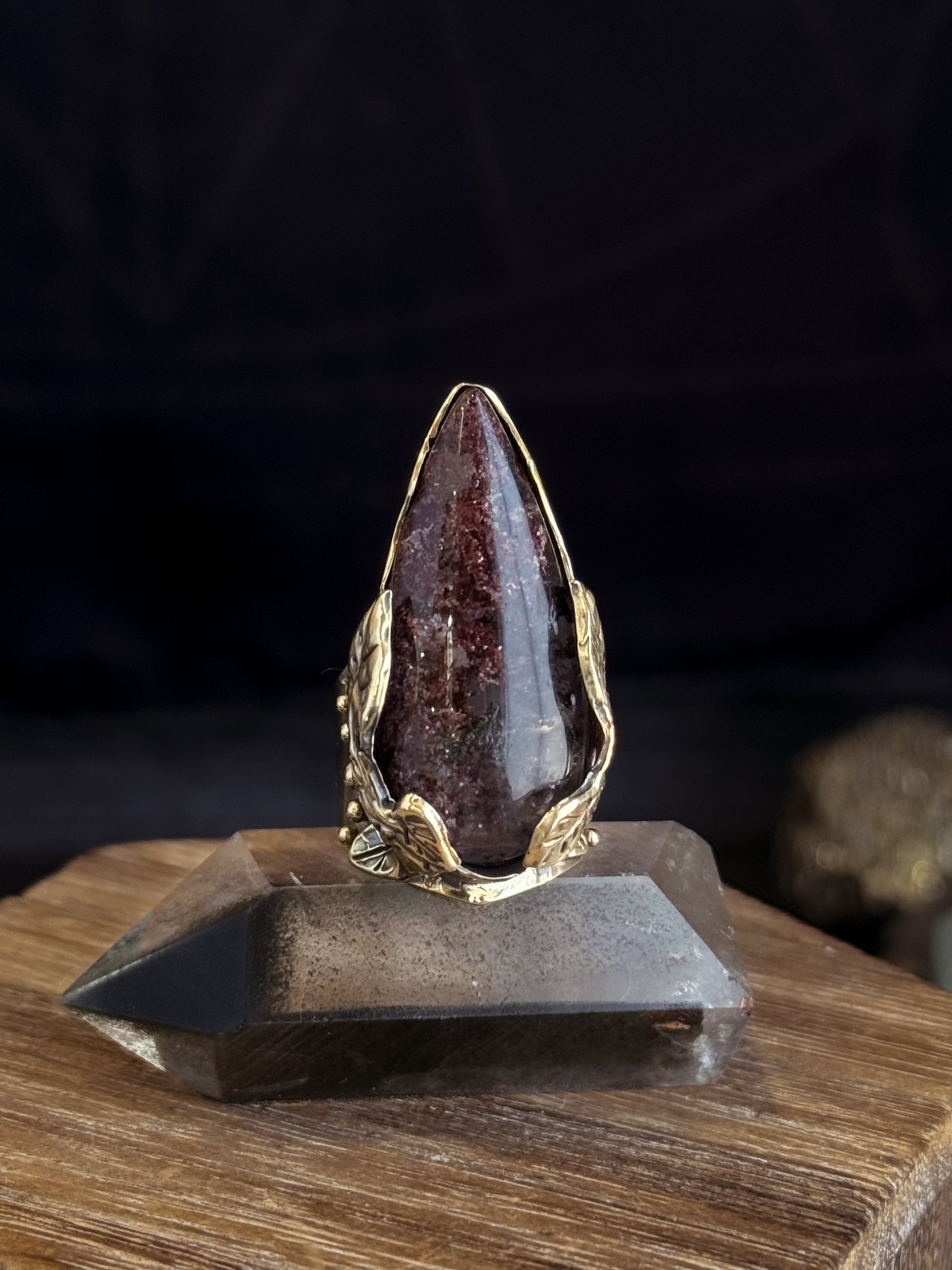 Hand carved and cast brass Empress Shield Ring featuring a natural Lodolite. If you have questions regarding fit, you can contact us at any time. We are happy to help you determine your ring size.