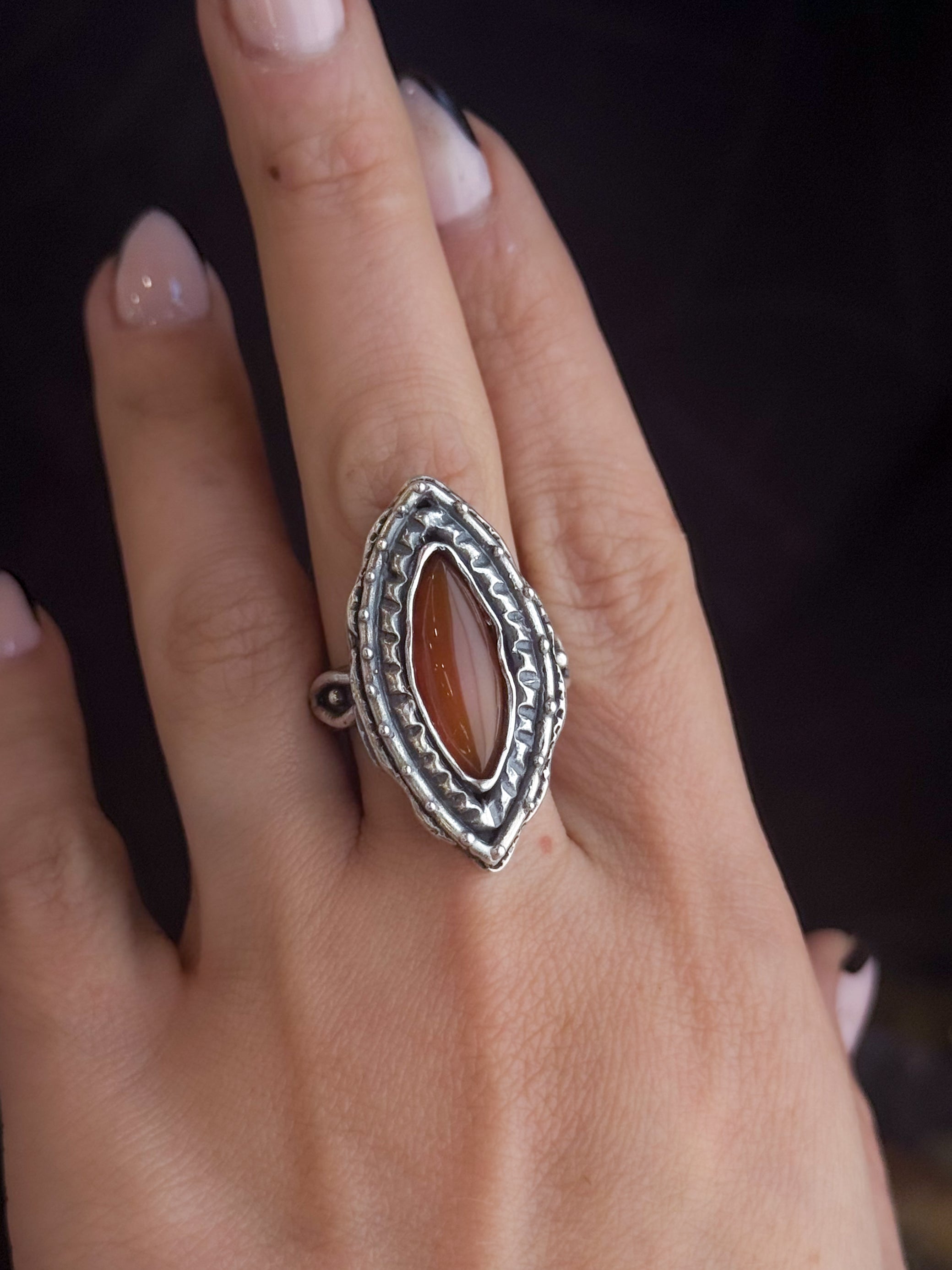 Hand carved and cast sterling silver In the Labyrinth Ring featuring a natural CarnelianIf you have questions regarding fit, you can contact us at any time. We are happy to help you determine your ring size.