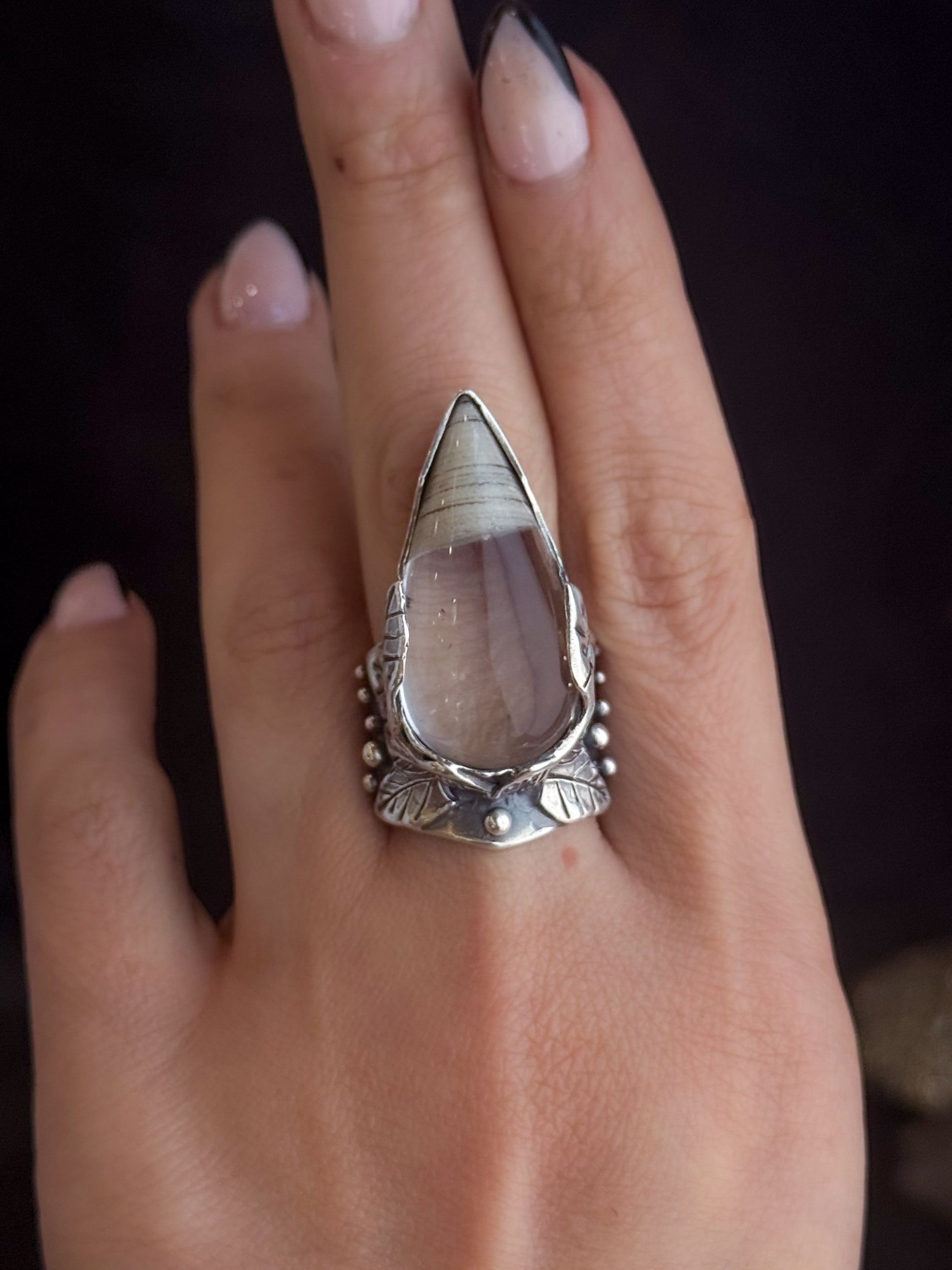 Hand carved and cast sterling silver In the Empress Shield Ring featuring a natural Inclusion Quartz. If you have questions regarding fit, you can contact us at any time. We are happy to help you determine your ring size.