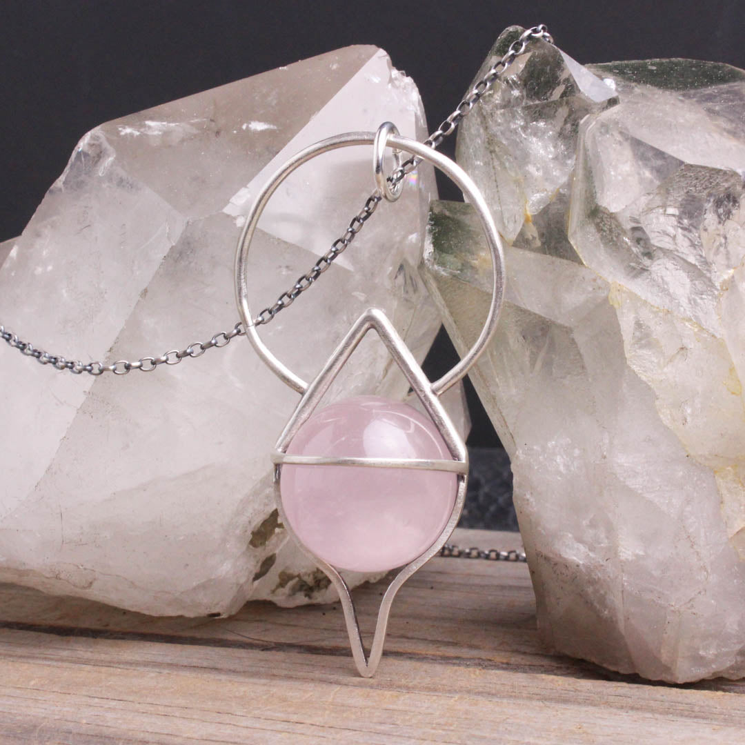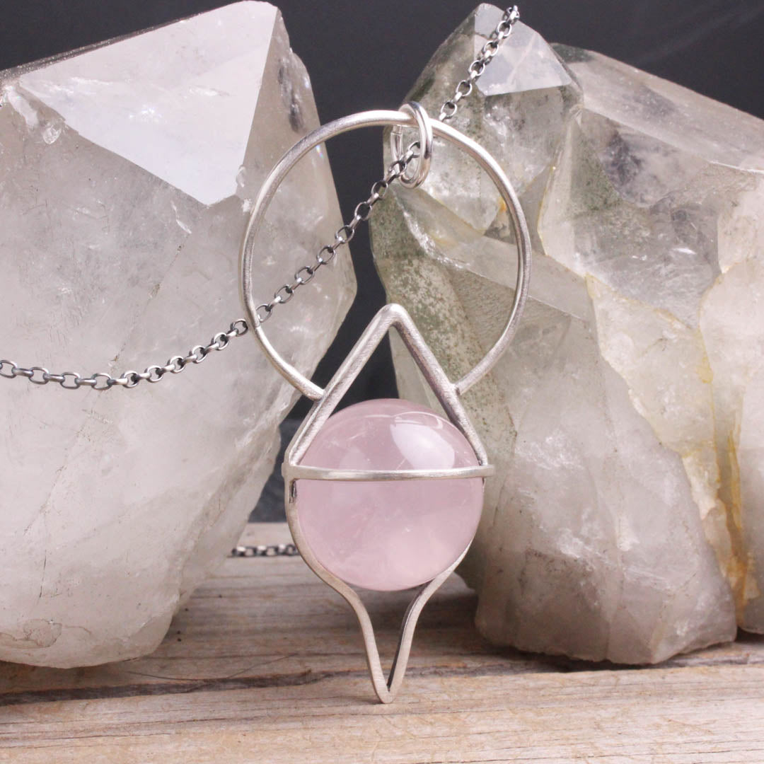 This piece is solid sterling silver including the chain and findings. One-of-a-kind Crystal Ball pendant featuring Rose Quartz