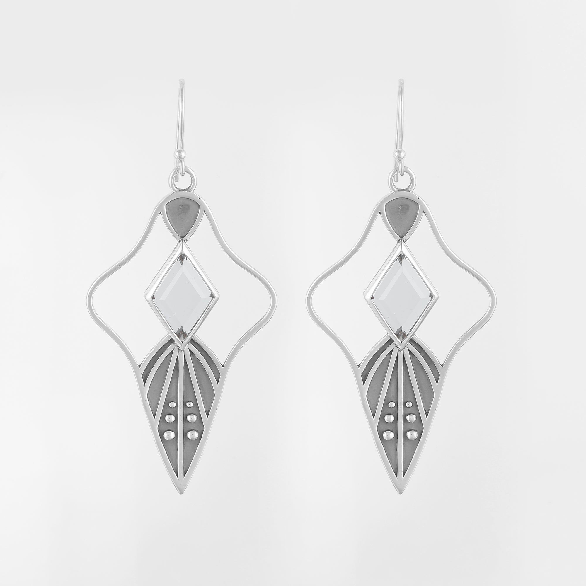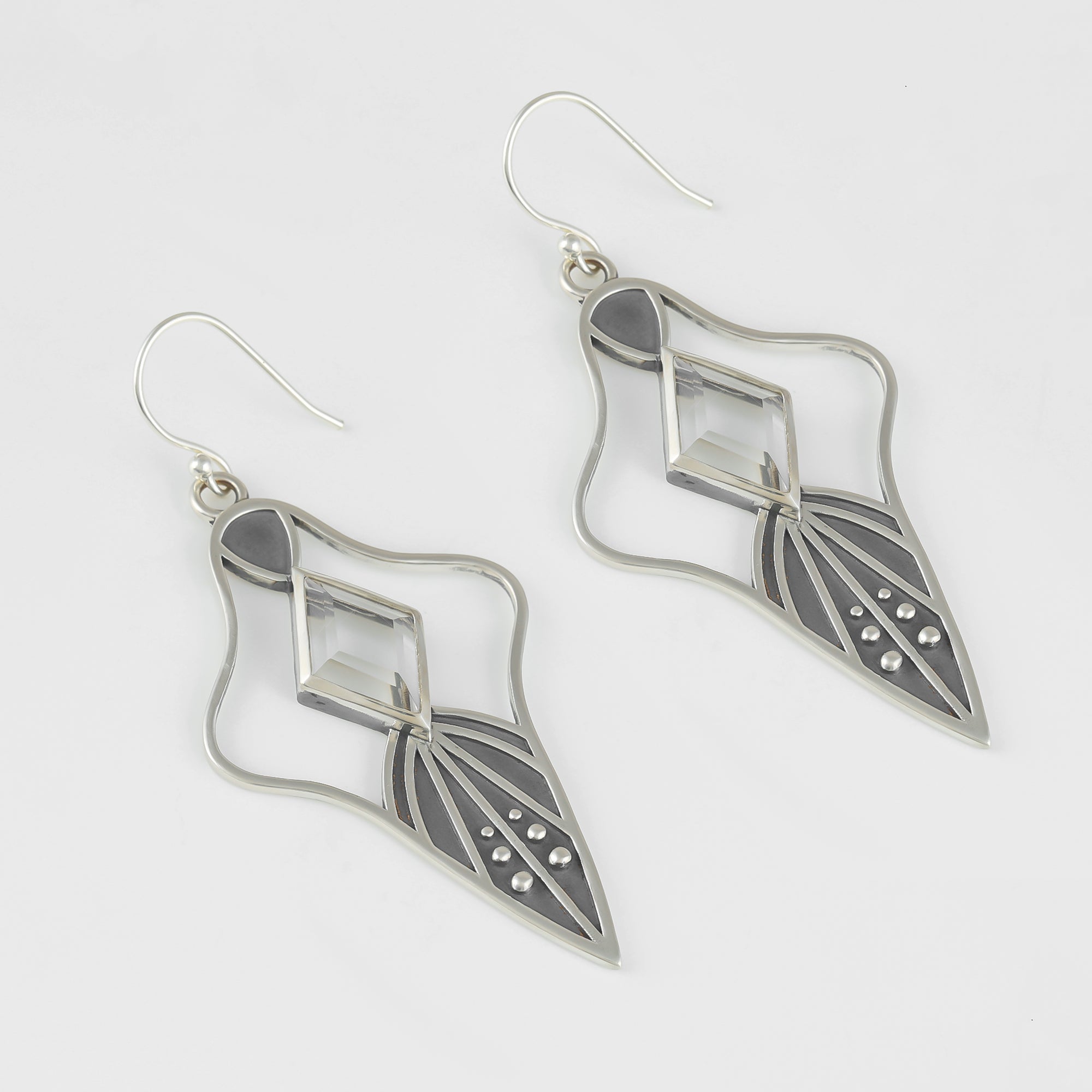 Hand carved and cast sterling silver fan-shaped earrings set with natural faceted Clear Quartz.