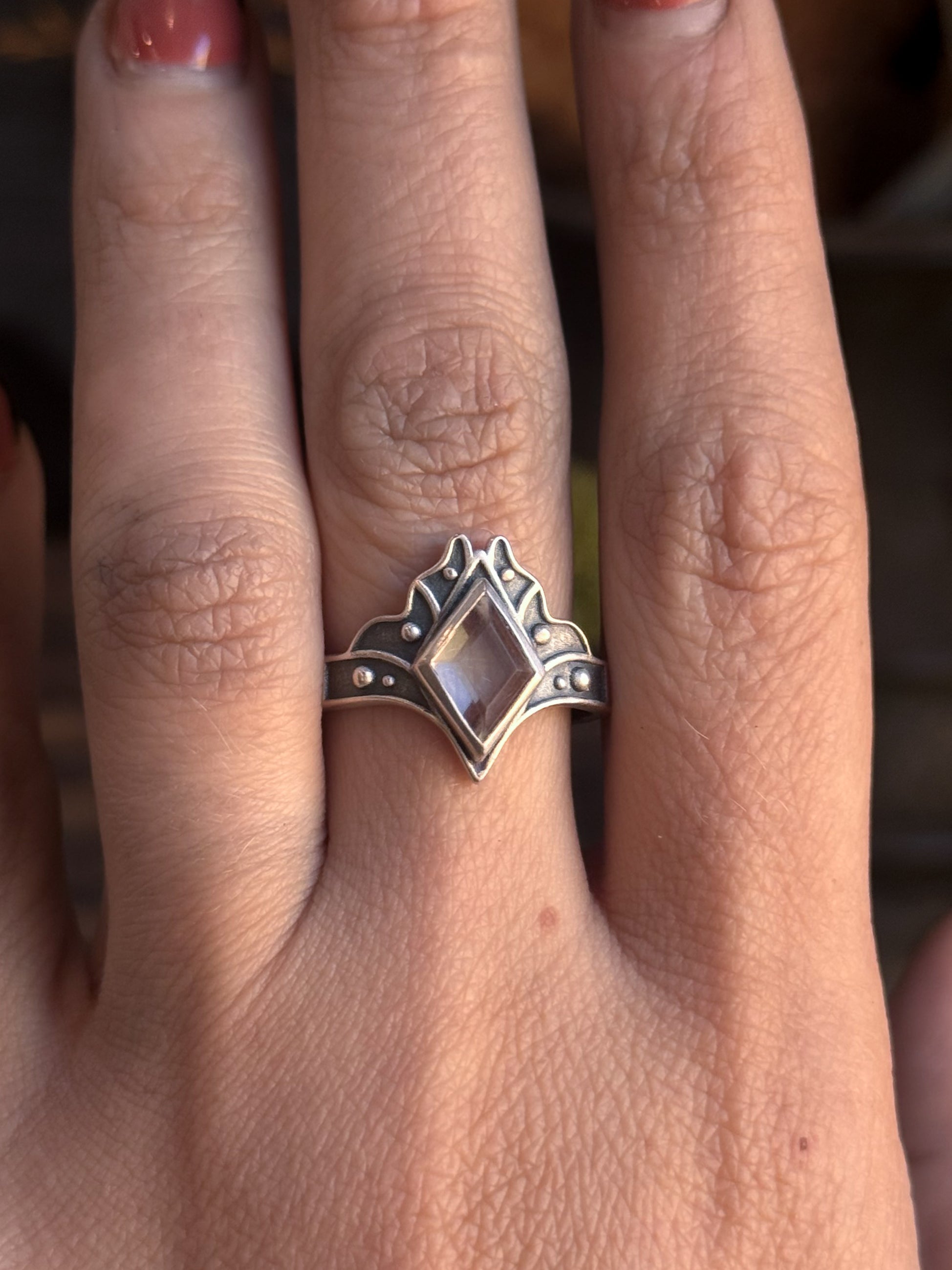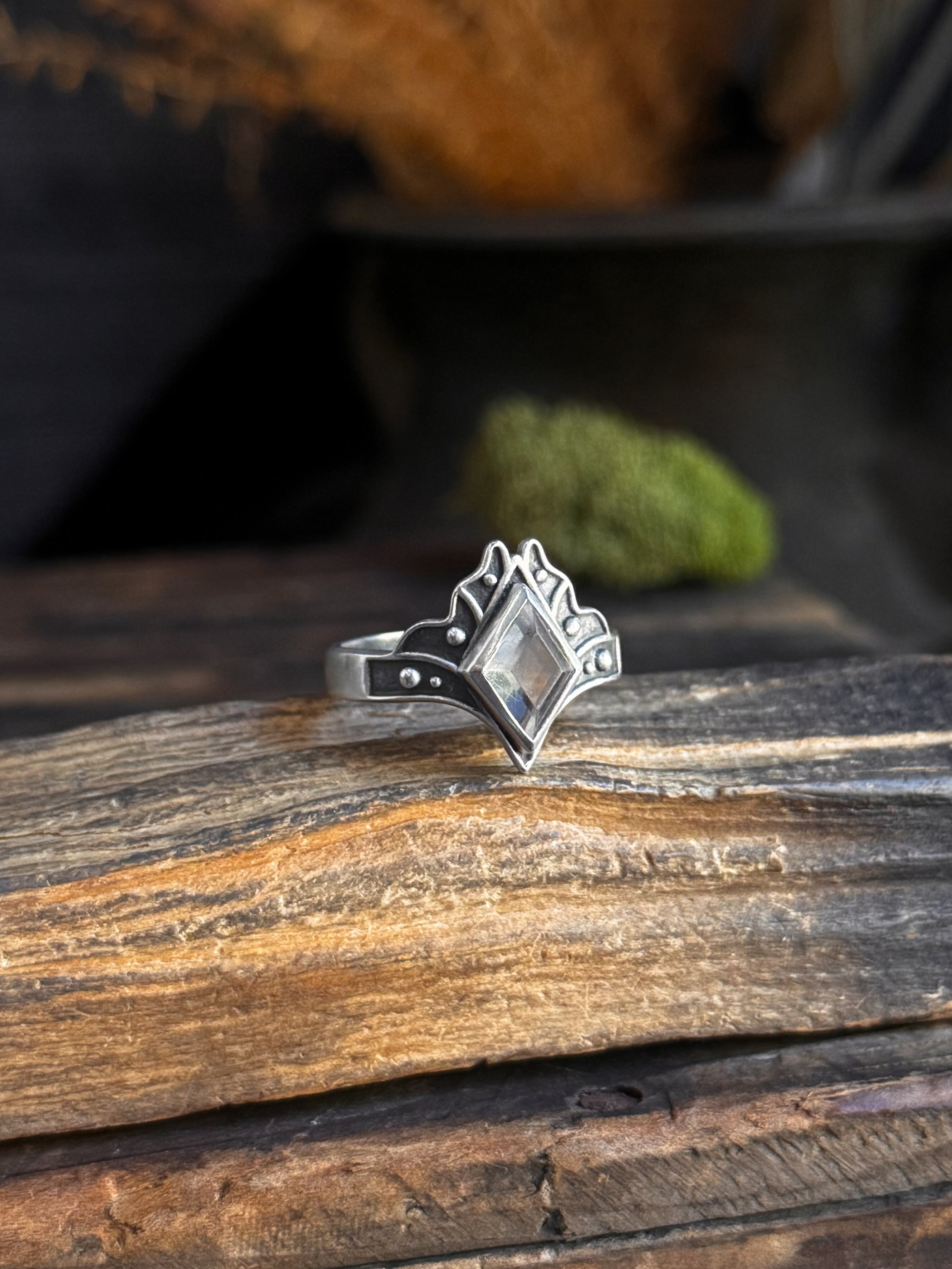 Hand carved and cast sterling silver ring set with natural faceted Clear Quartz.