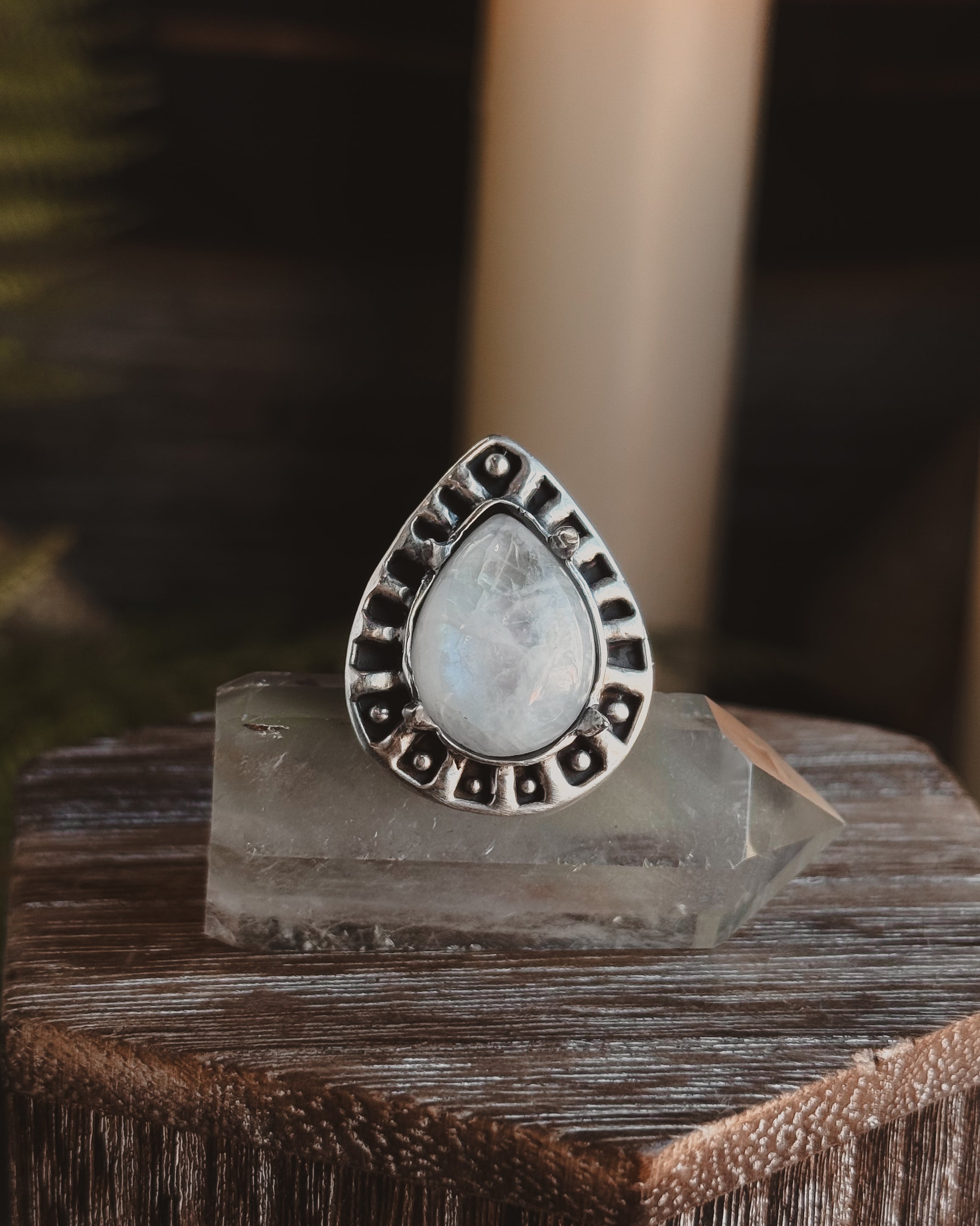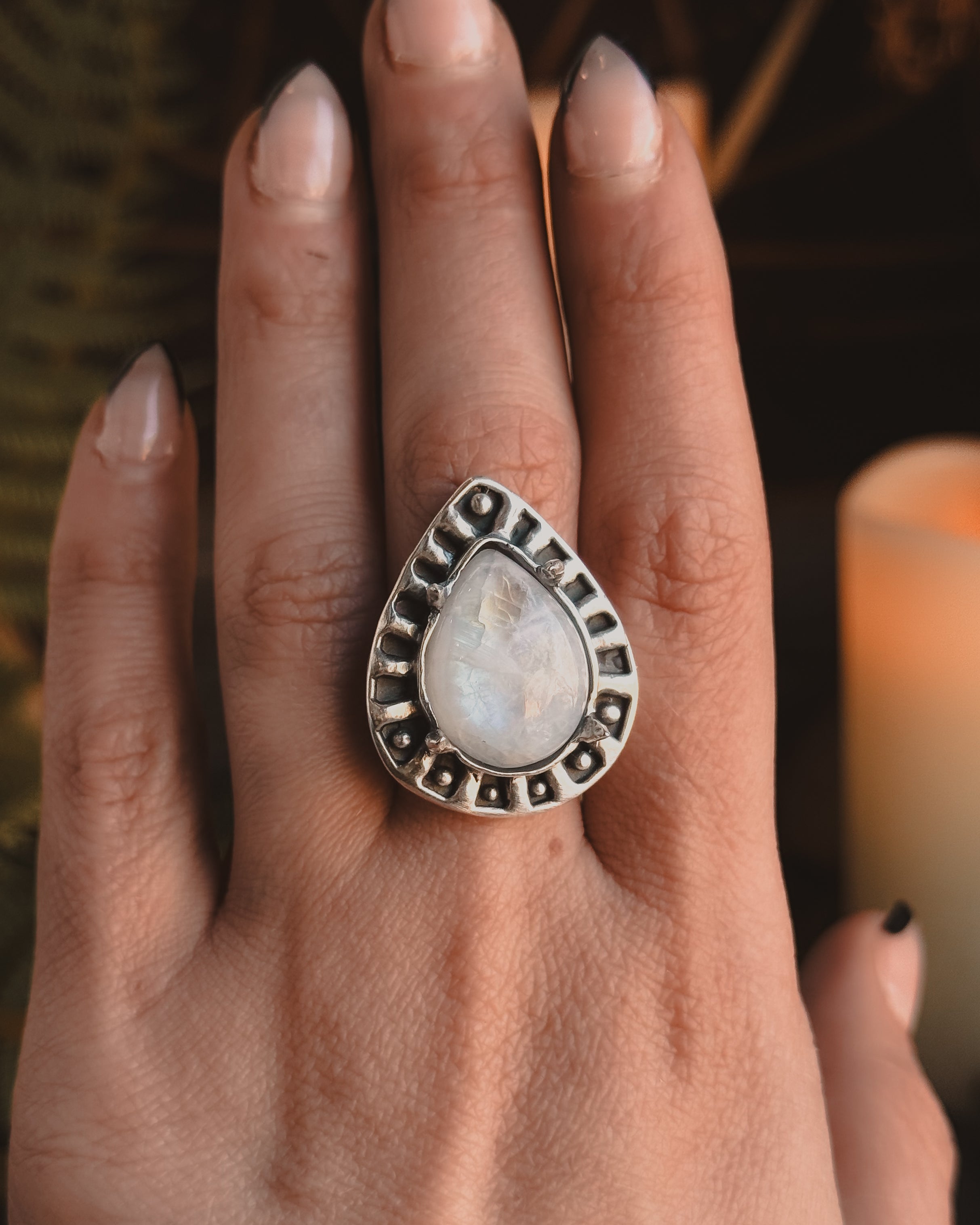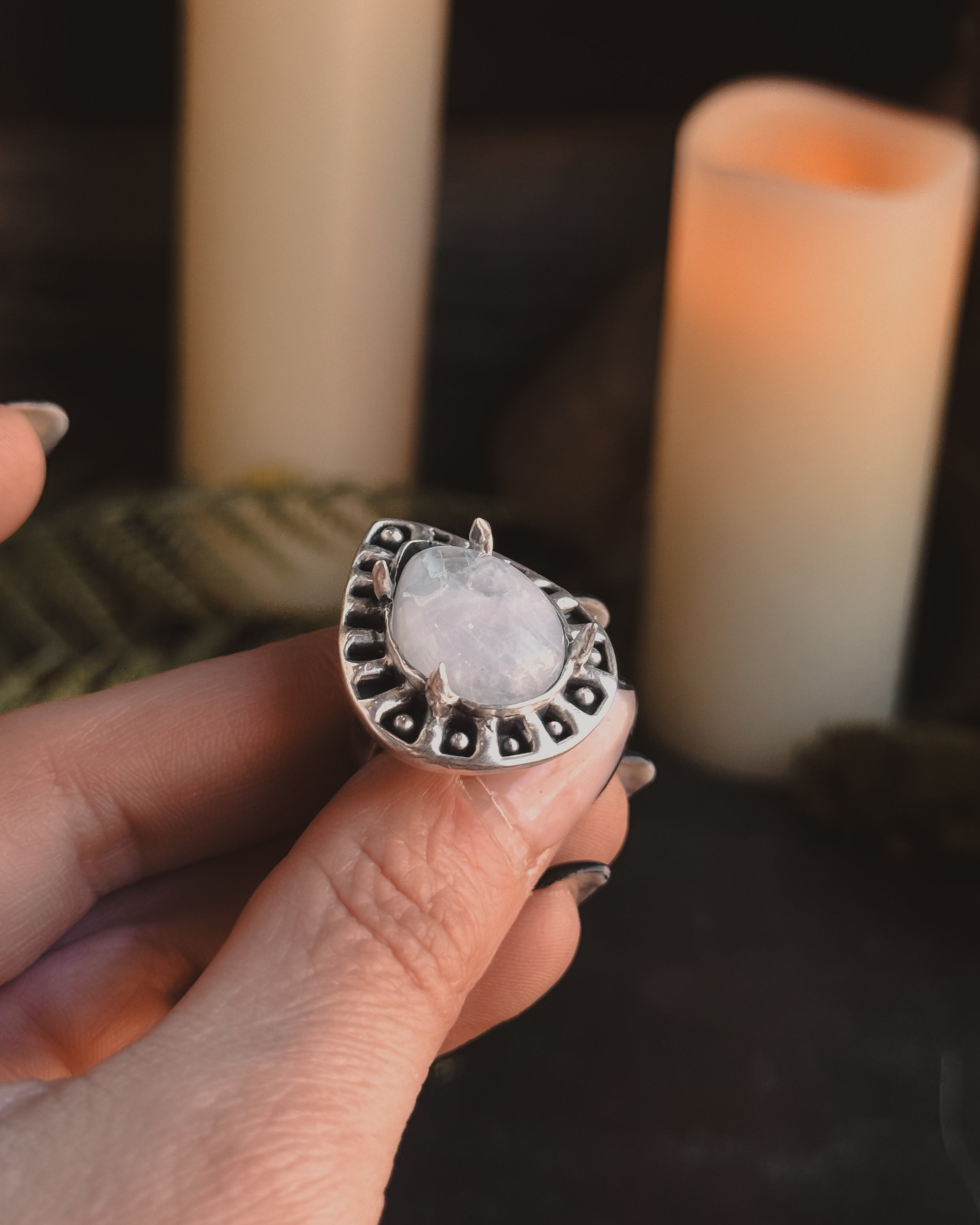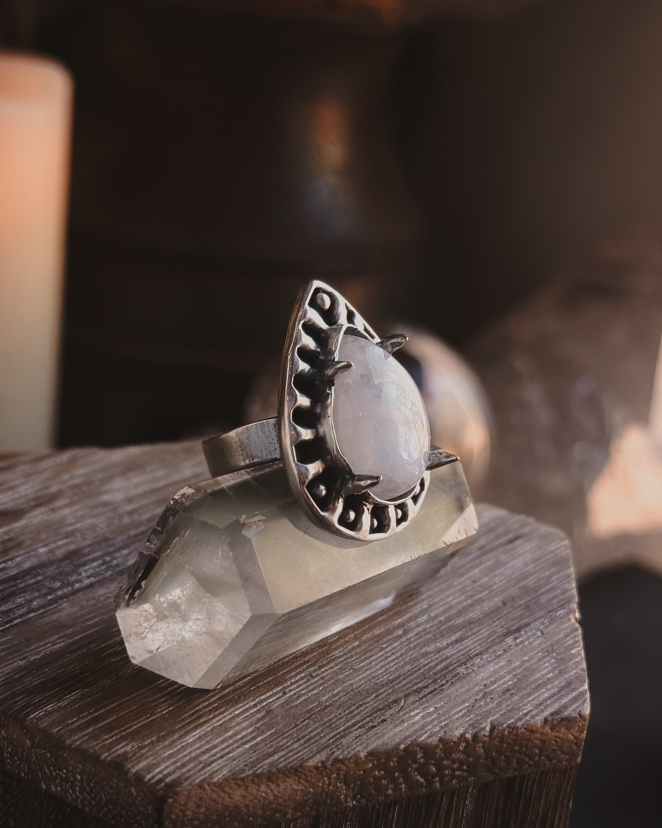 Hand carved and cast sterling silver Deep Love Ring Featuring a Rainbow Moonstone. If you have questions regarding fit, you can contact us at any time. We are happy to help you determine your ring size.