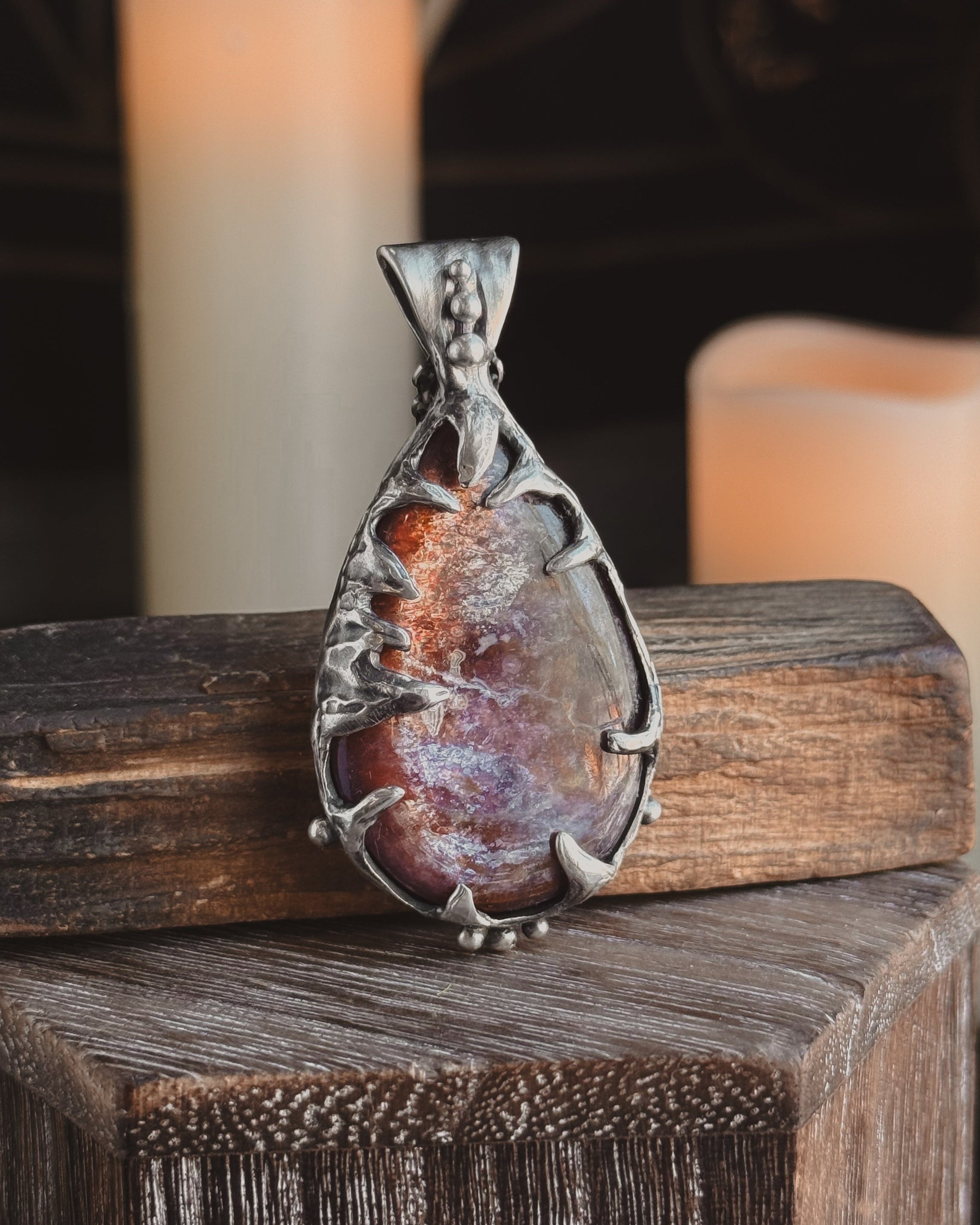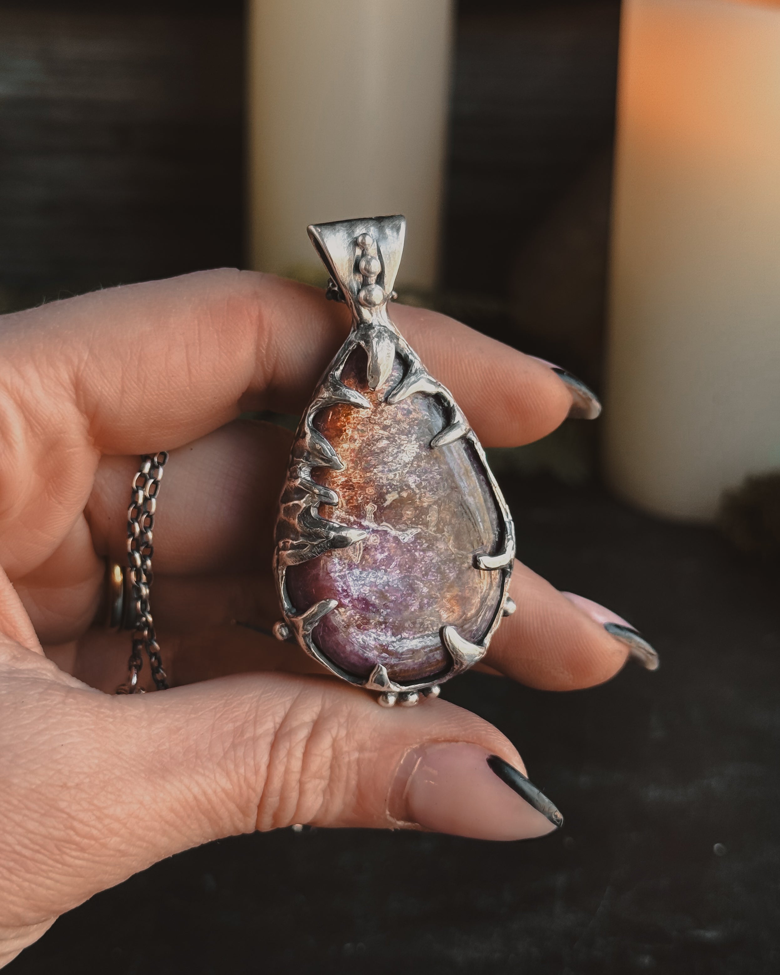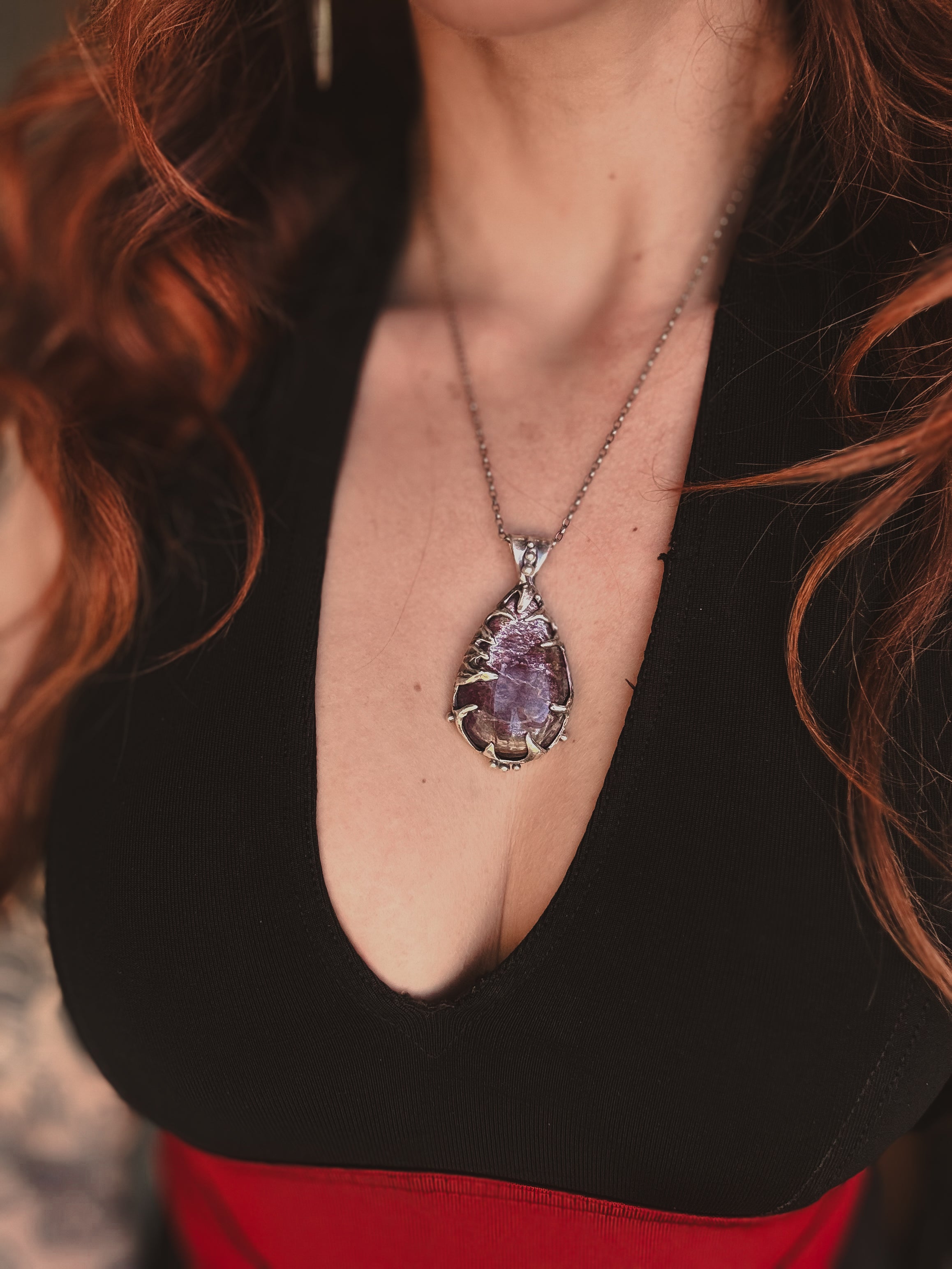 This piece is solid sterling silver including the chain and findings. Eternal Flame Necklace featuring a Lepidolite.
