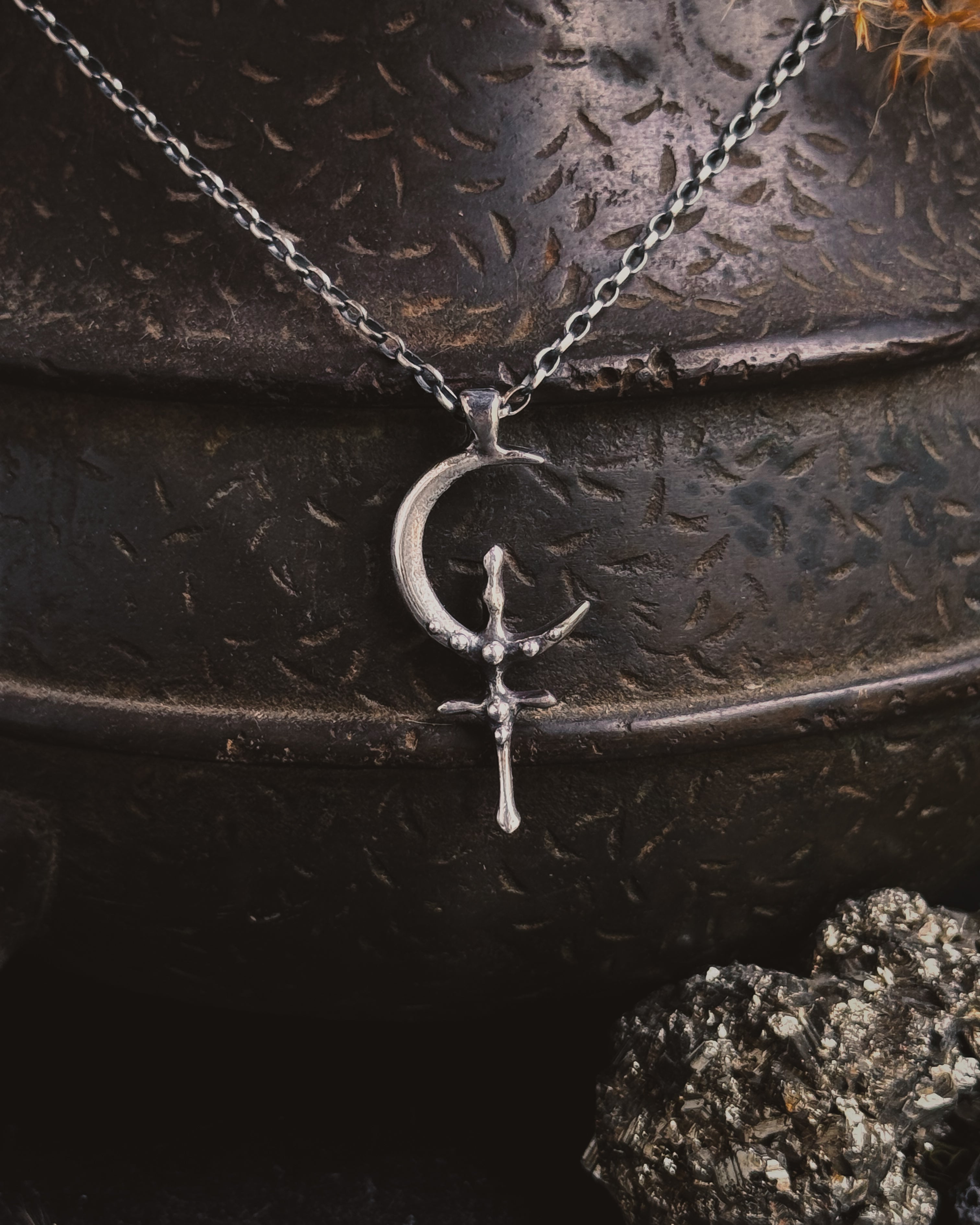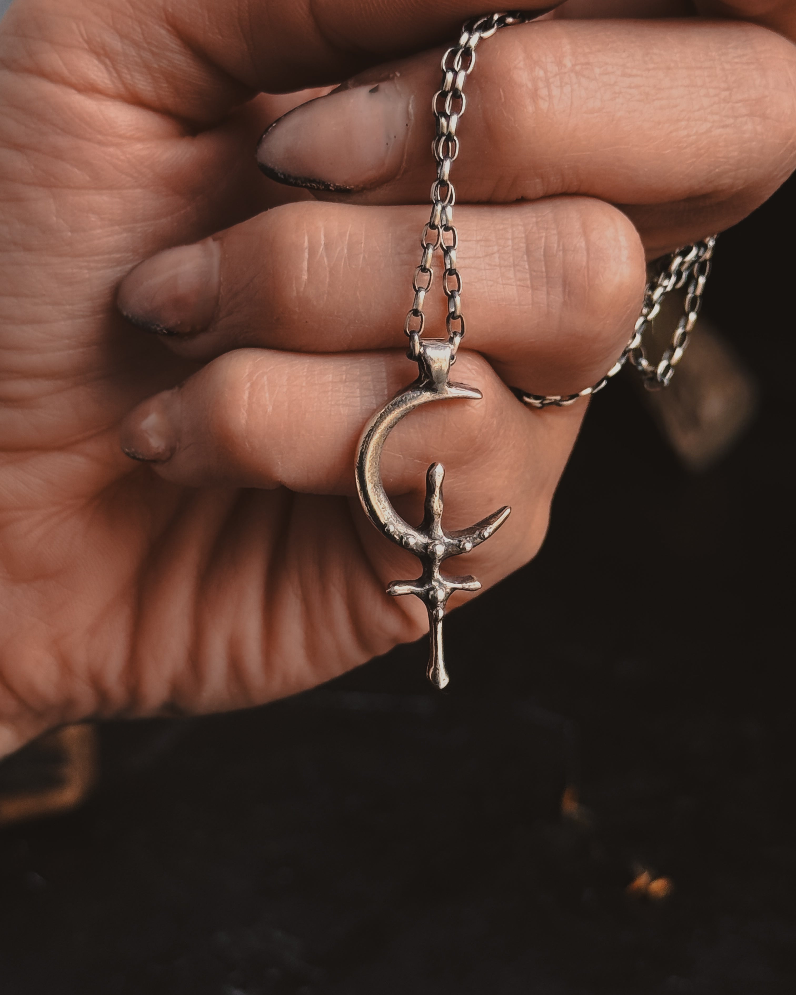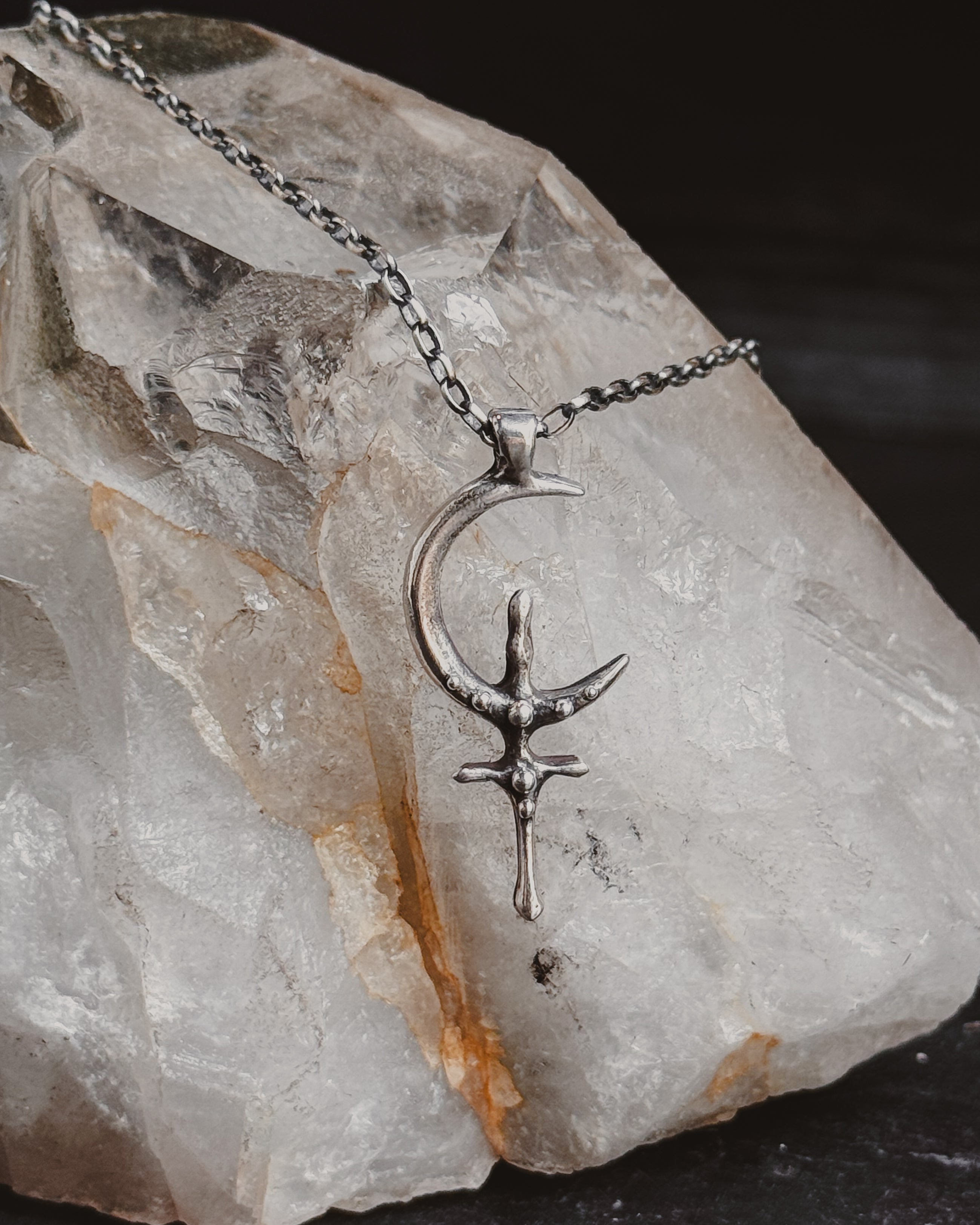 Handcrafted in sterling silver from our Coven Collection, this pendant serves as a wearable tribute to reclaiming your feminine power and embracing your authentic self. The carefully crafted sigil represents both lunar wisdom and the fierce independence of the divine feminine—qualities that make Lilith a powerful ally for those seeking to break free from limiting beliefs and step into their sovereignty. Like Lilith herself, who chose exile over submission, this necklace reminds you that true power comes from honoring your own truth.
