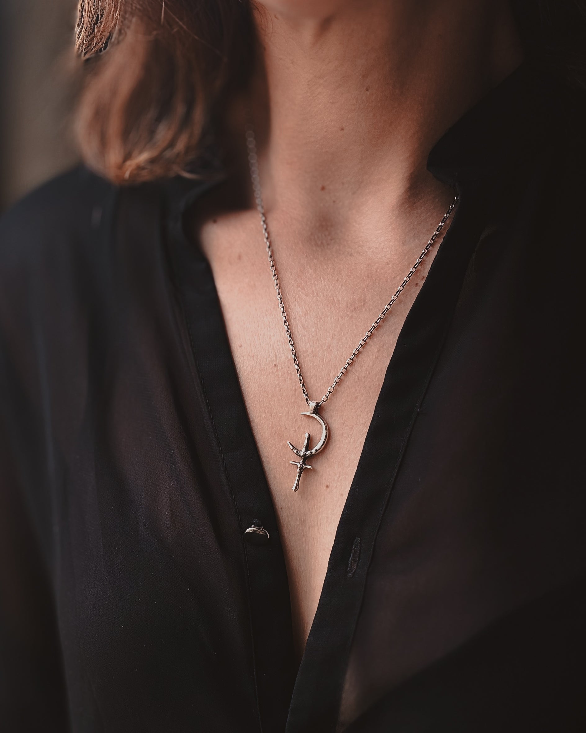 The Lilith Cross Necklace features a hand-carved Lilith sigil that celebrates the powerful lunar goddess and ultimate symbol of feminine independence and rebellion. This empowering pendant combines the crescent moon with the feminine symbol, creating a sacred talisman that honors Lilith's role as the first woman who refused to submit and chose her own path.