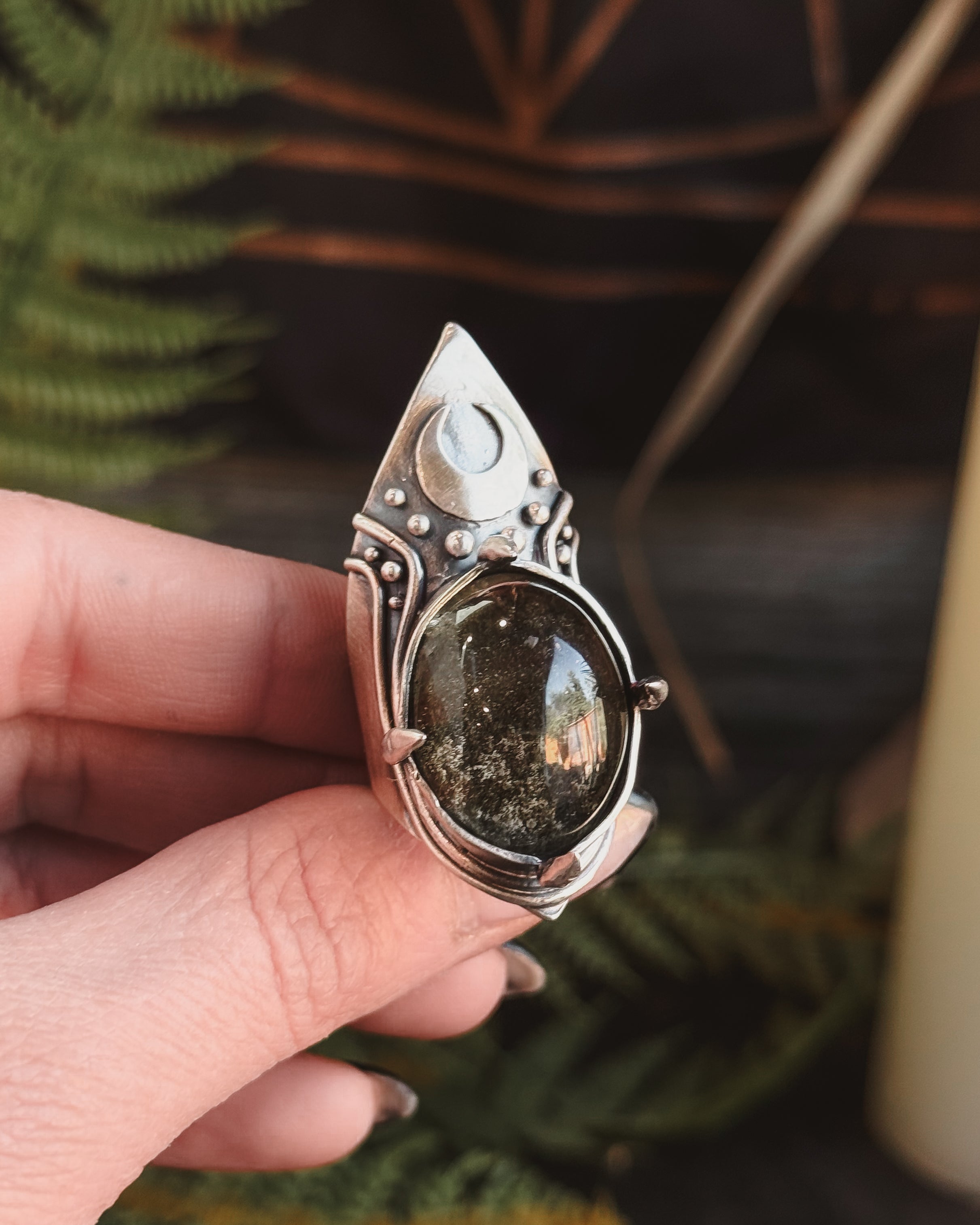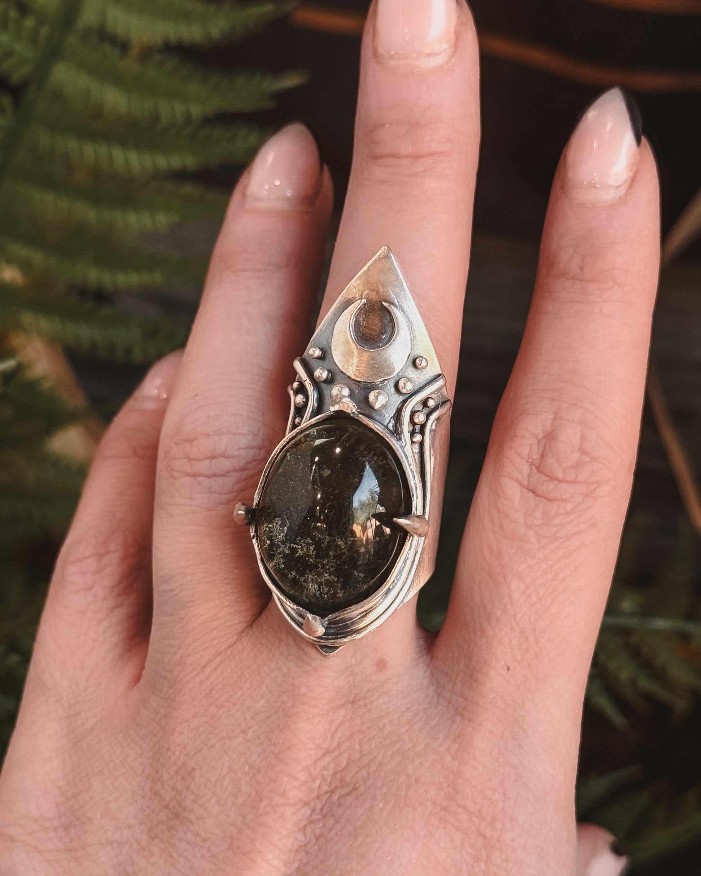 Hand carved and cast sterling silver Moon Queen Ring, set with a natural Garden Quartz. If you have questions regarding fit, you can contact us at any time. We are happy to help you determine your ring size.