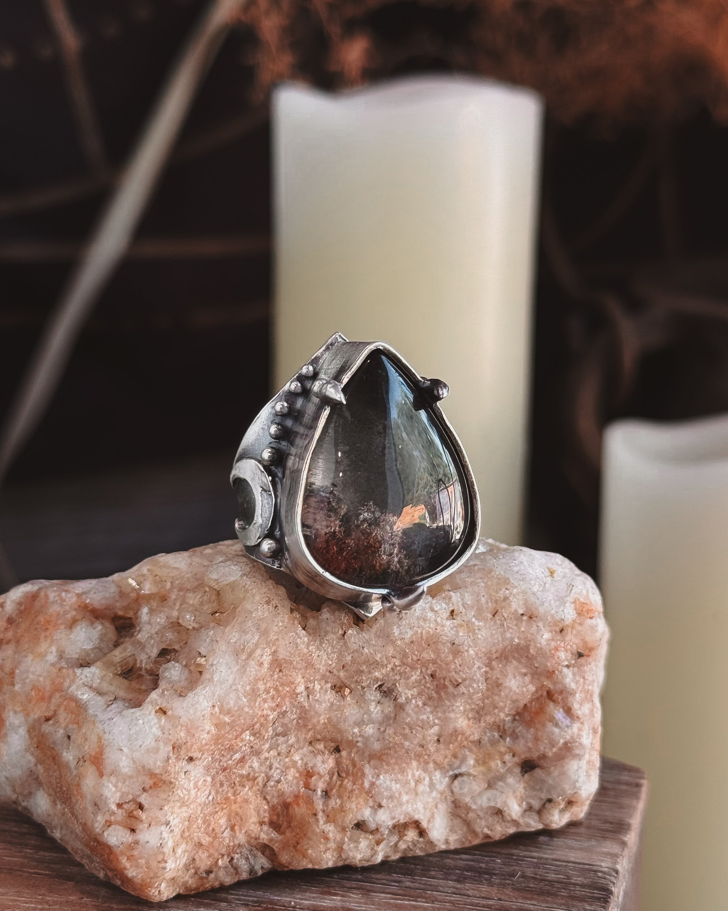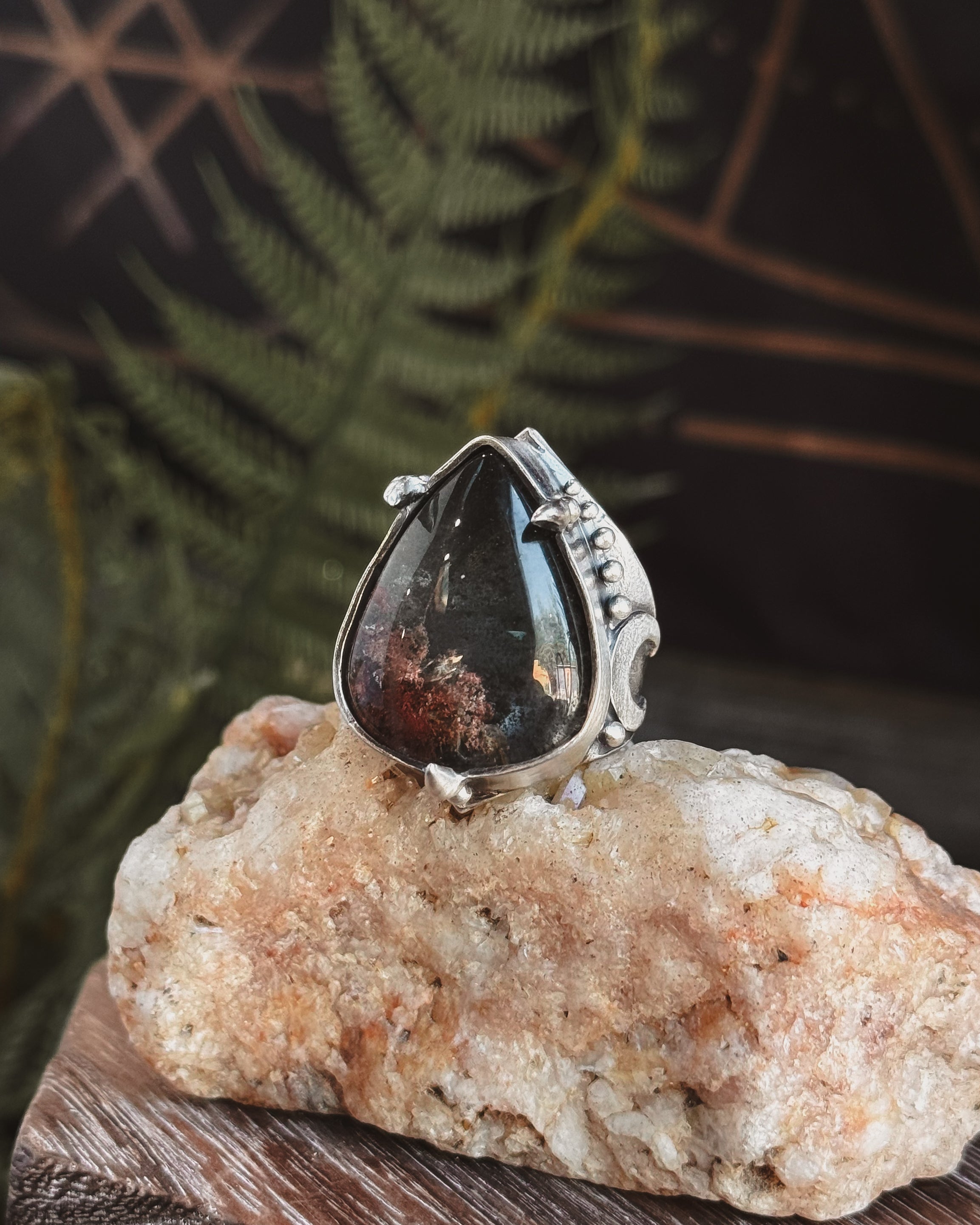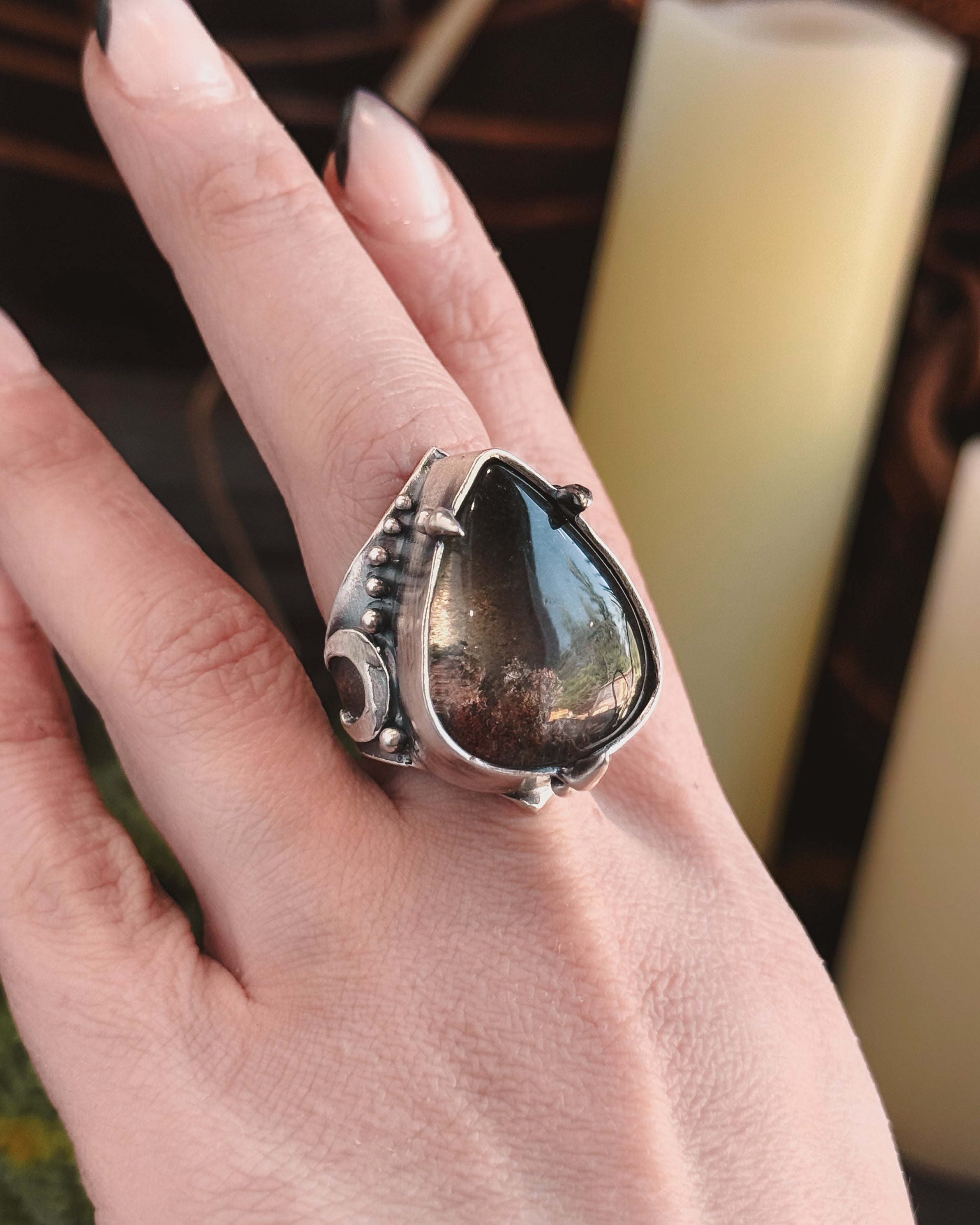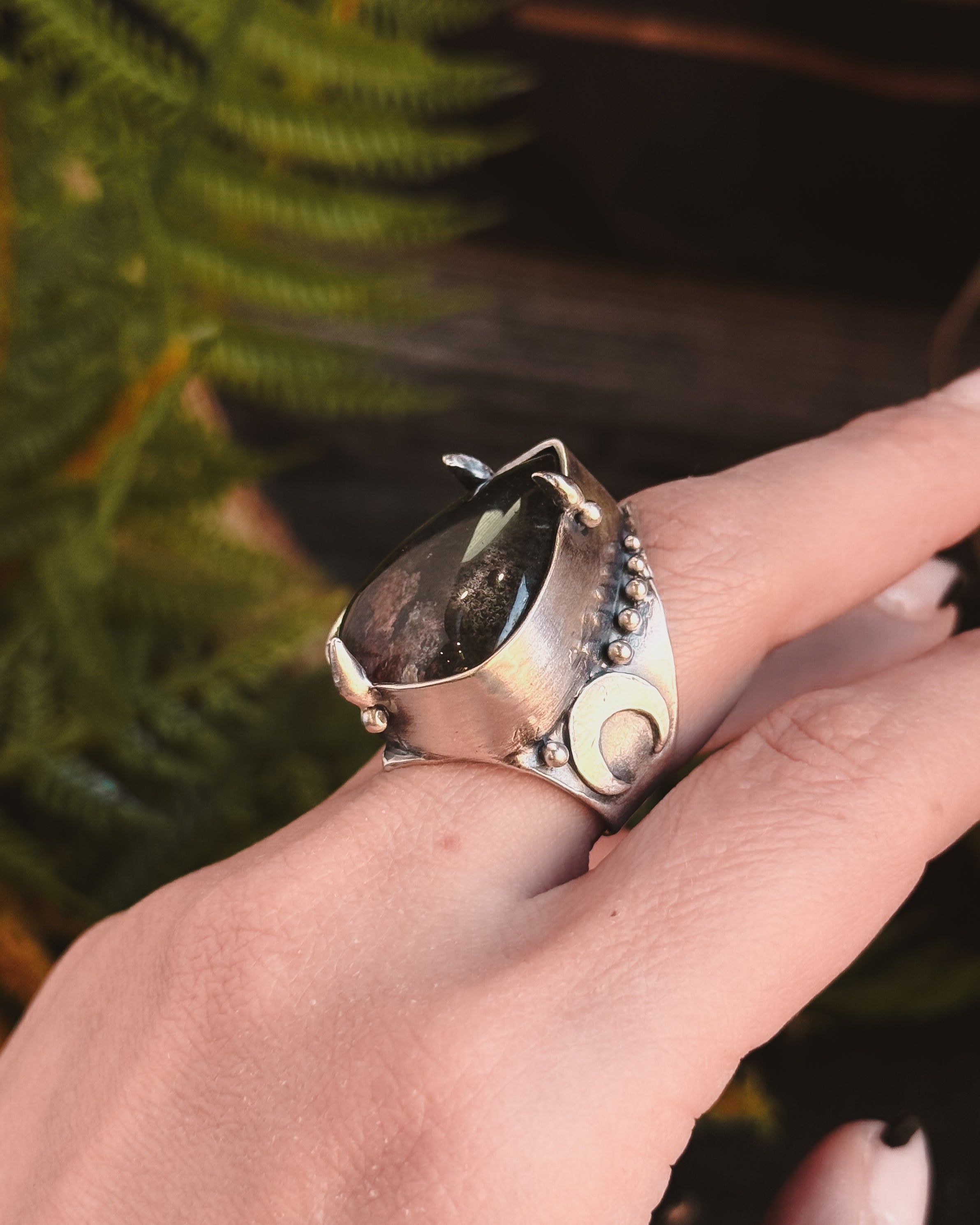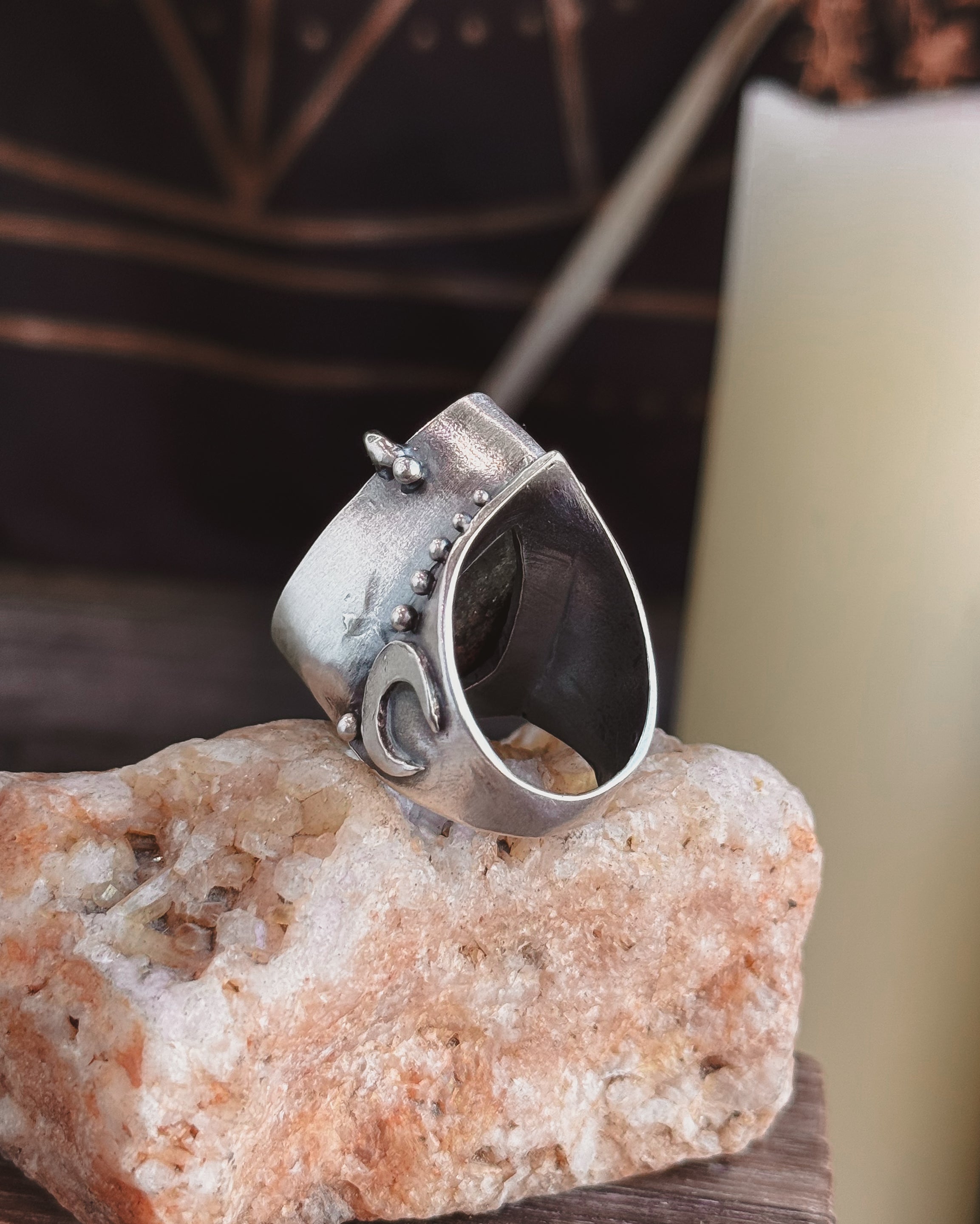 Hand carved and cast sterling silver Moon Ring, set with a natural Garden Quartz. If you have questions regarding fit, you can contact us at any time. We are happy to help you determine your ring size.