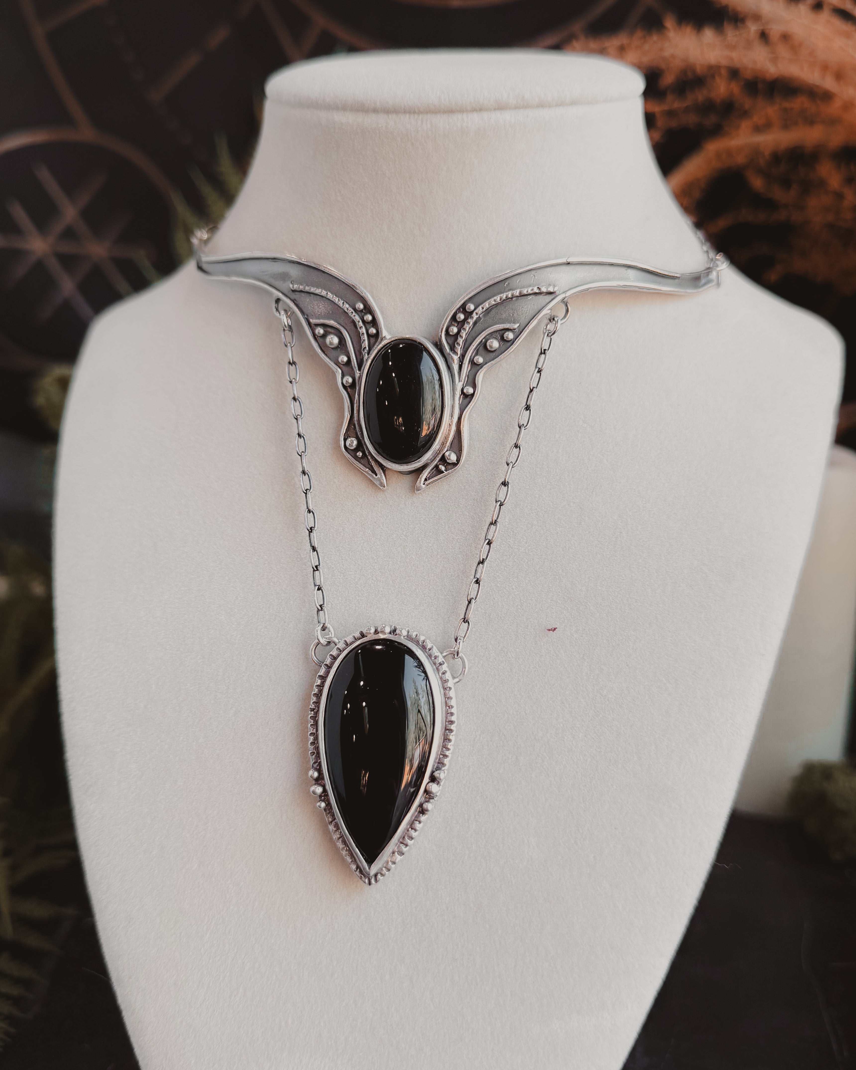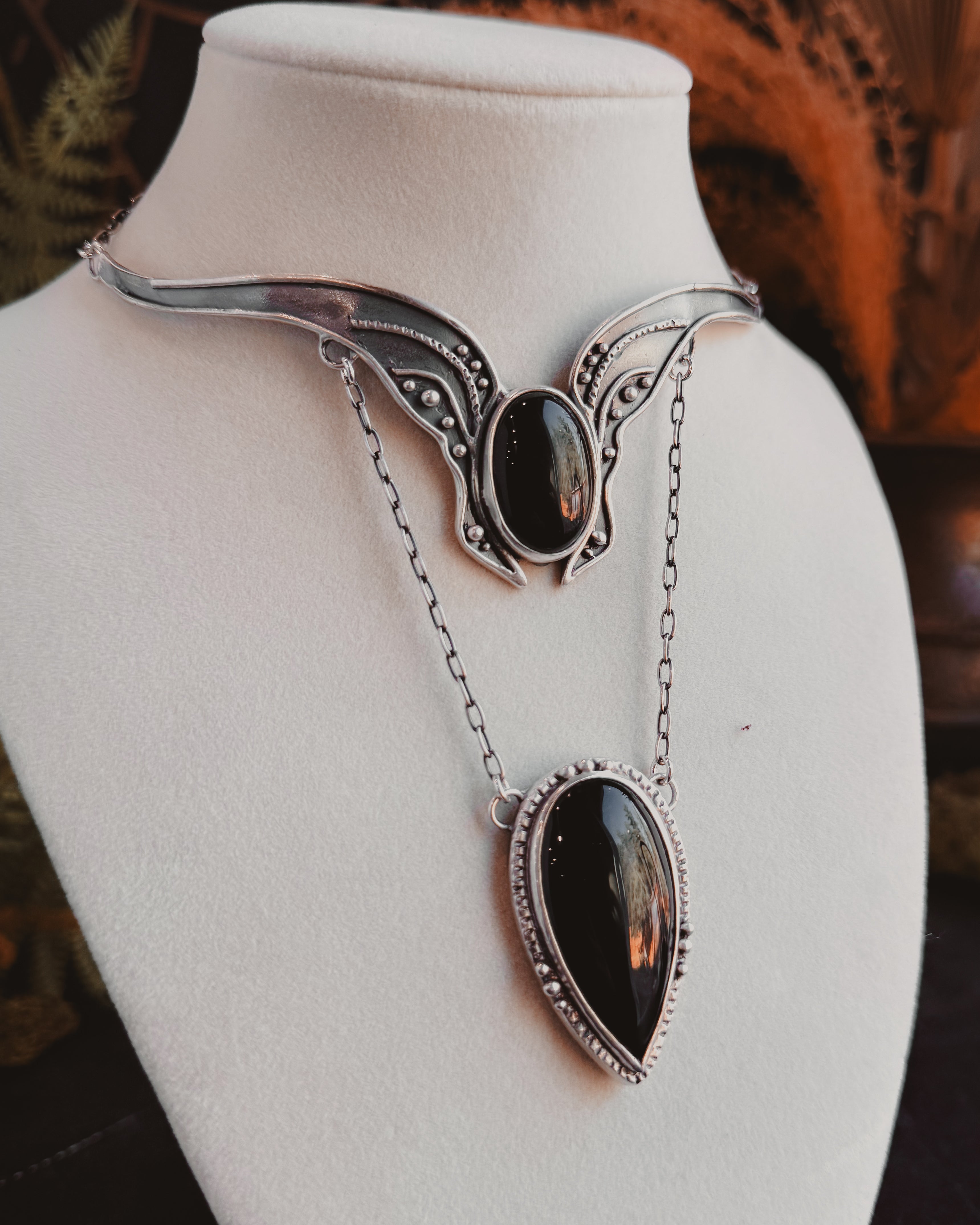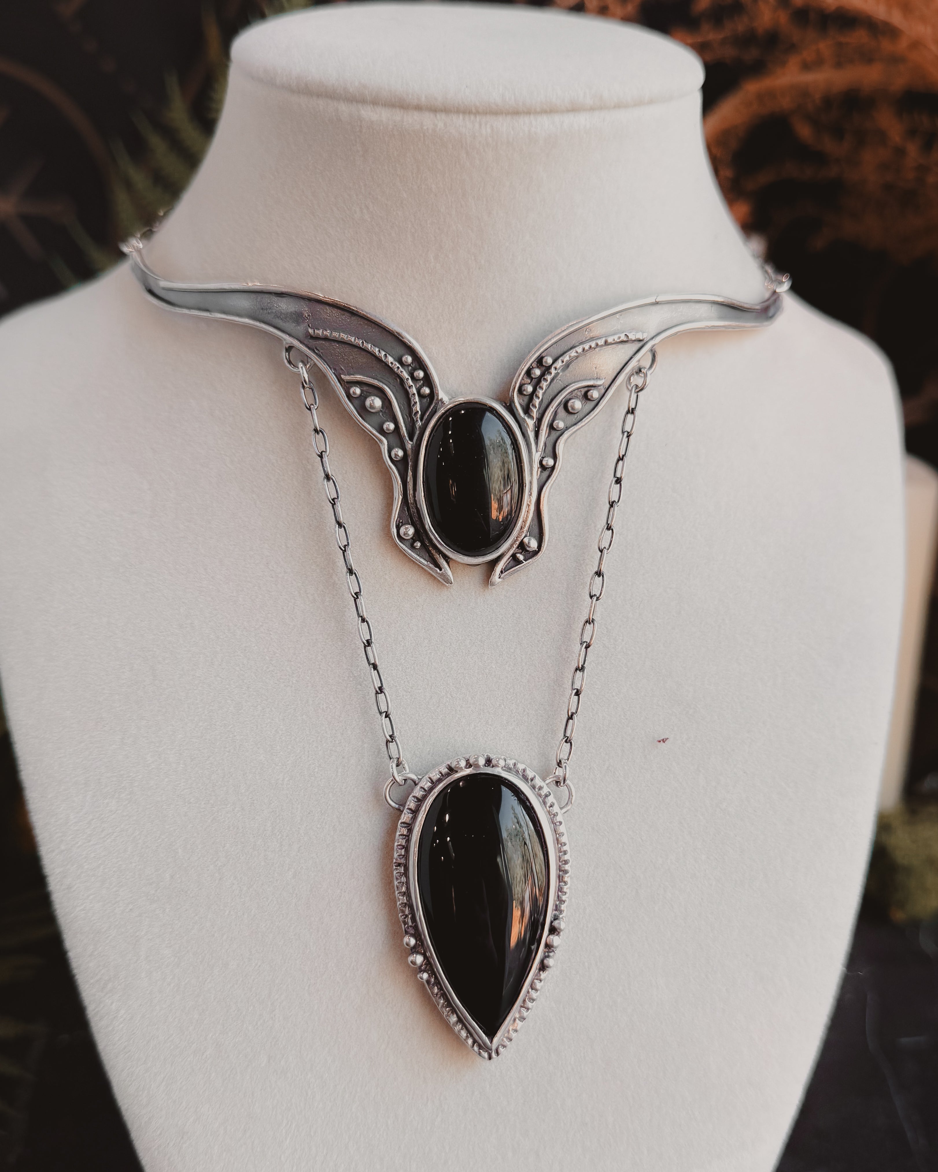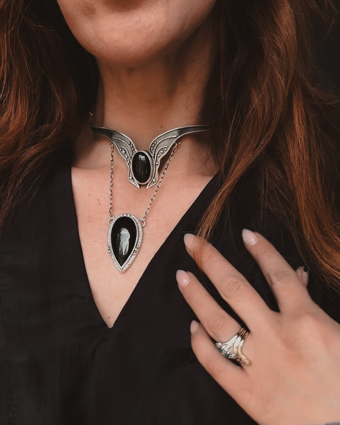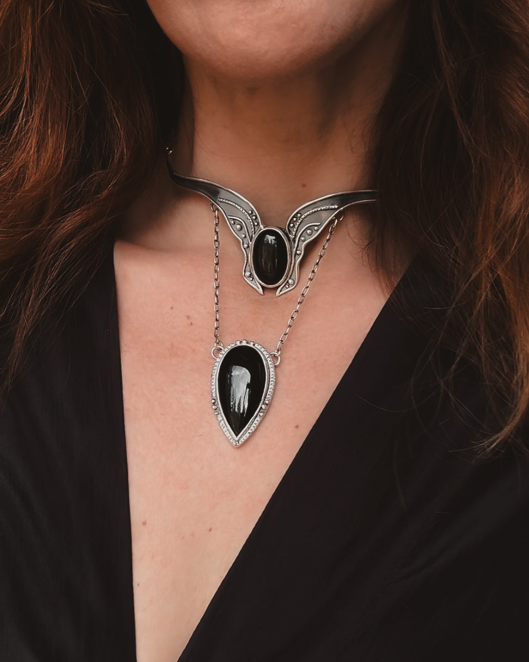 This piece is solid sterling silver including the chain and findings. Vanya neck cuff featuring Black Agate.